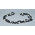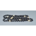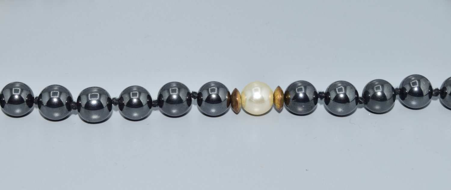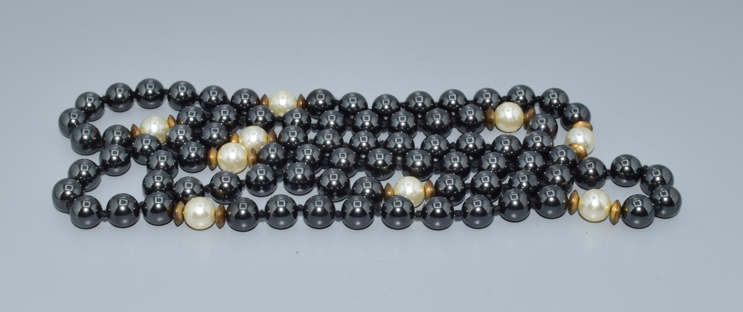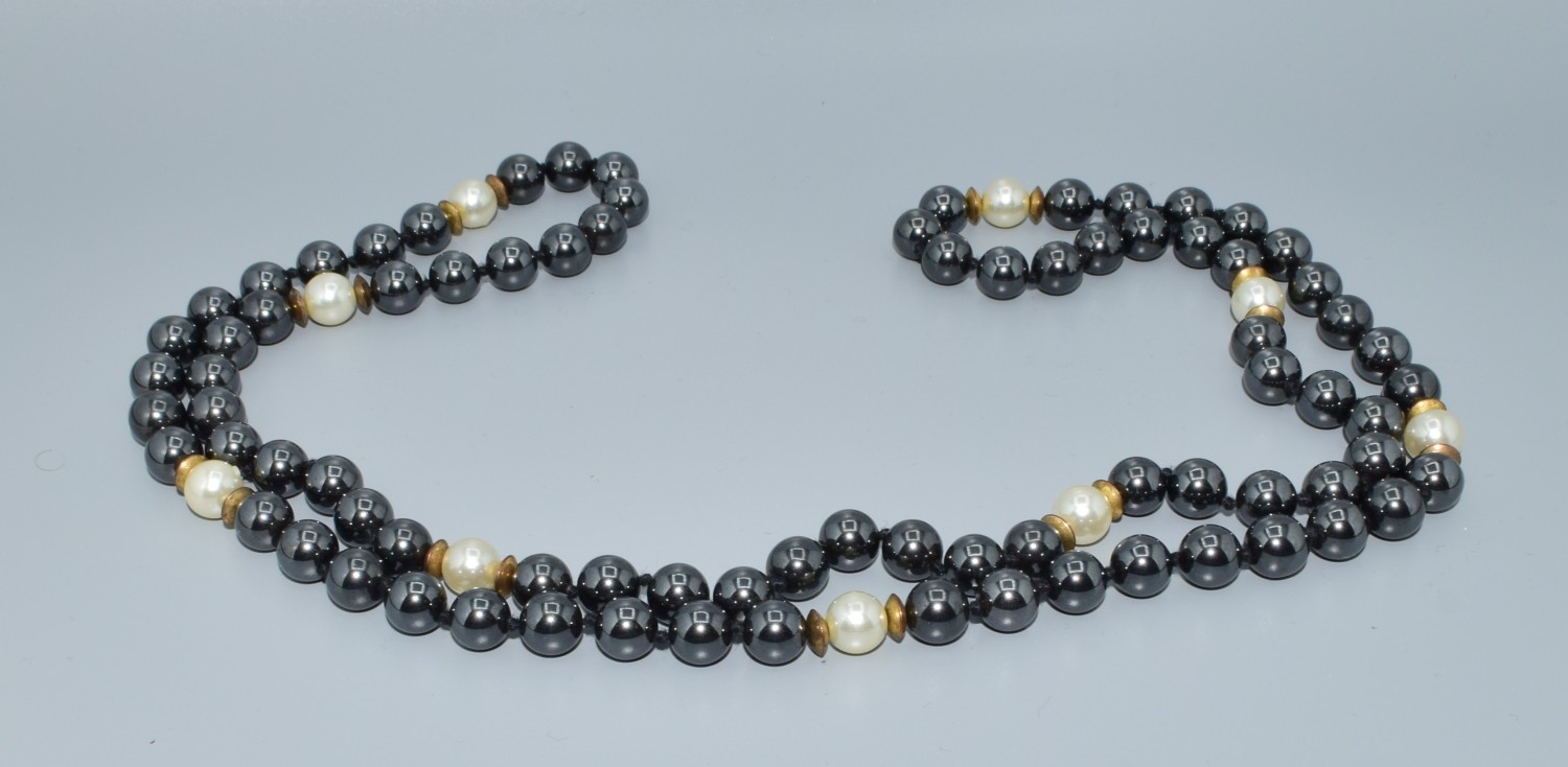 Long strand of haematite and white pearl necklace all individually knotted 80cm long