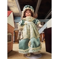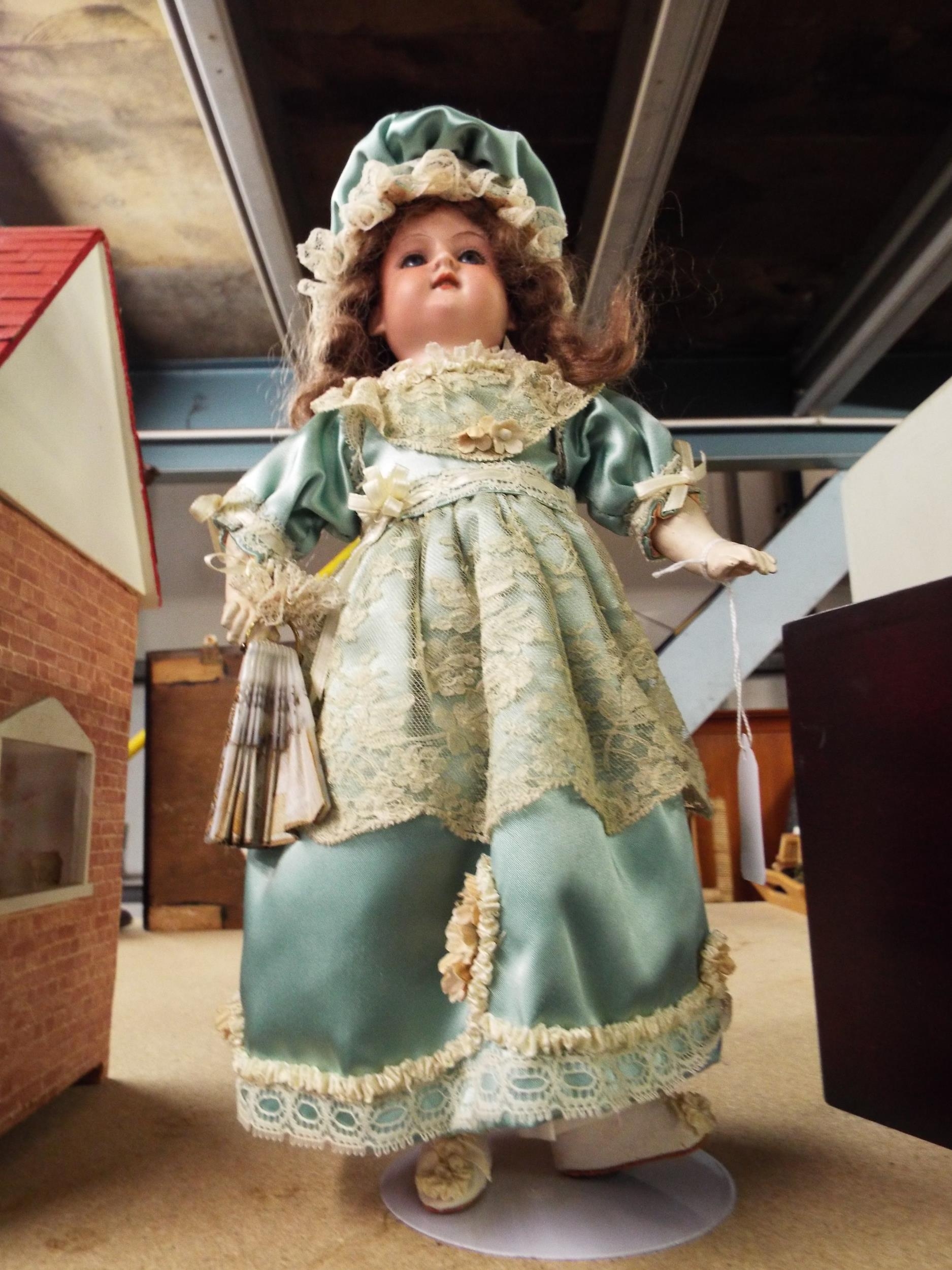 A vintage 13.5” Armand Marseille Floradora A 3/0 M German bisque head doll in period outfit (not original costume) on metal stand