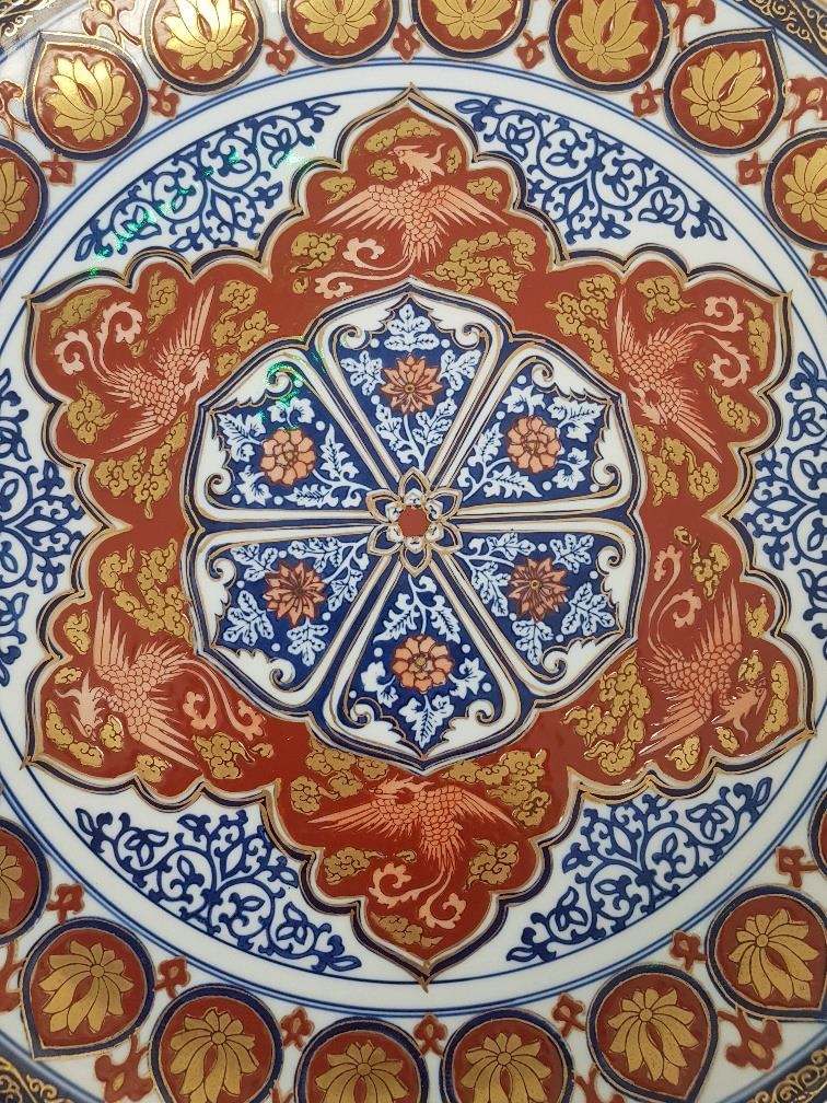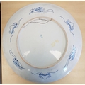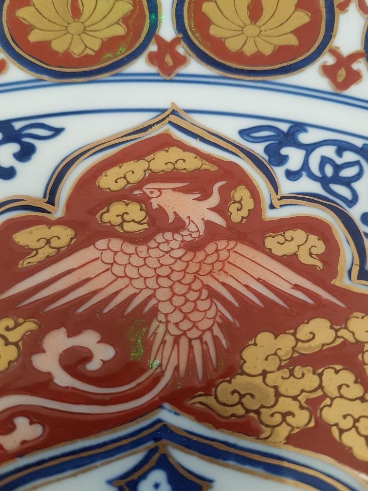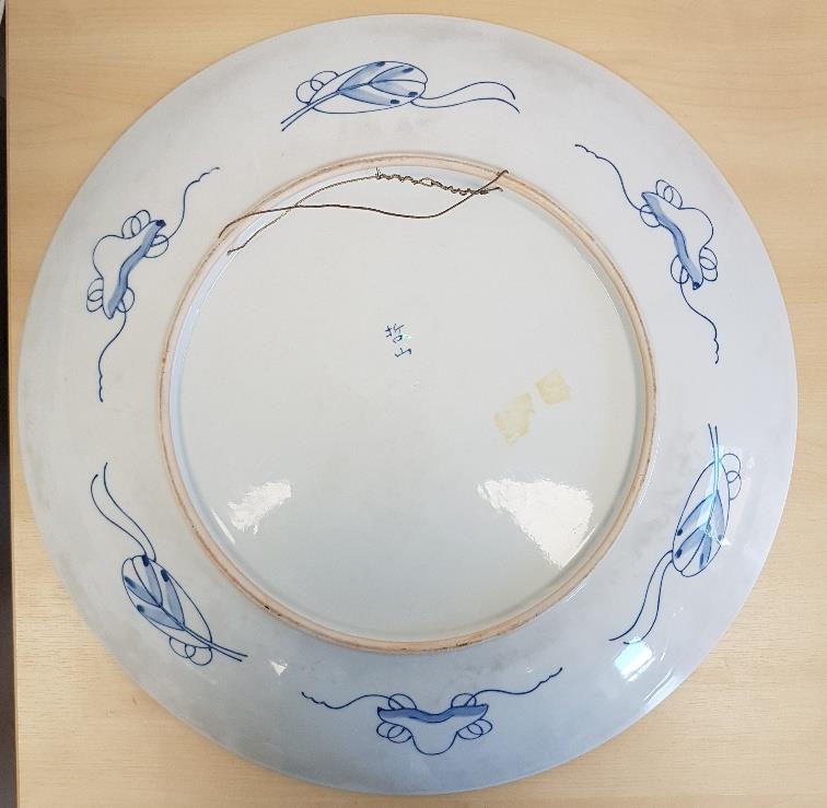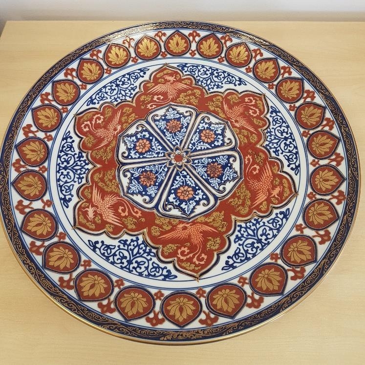 Stunning Large Japanese Imari Charger with gold and blue dragon decoration - 18 inches in diameter with marks to the reverse. Drilled for hanging (not suitable for posting)