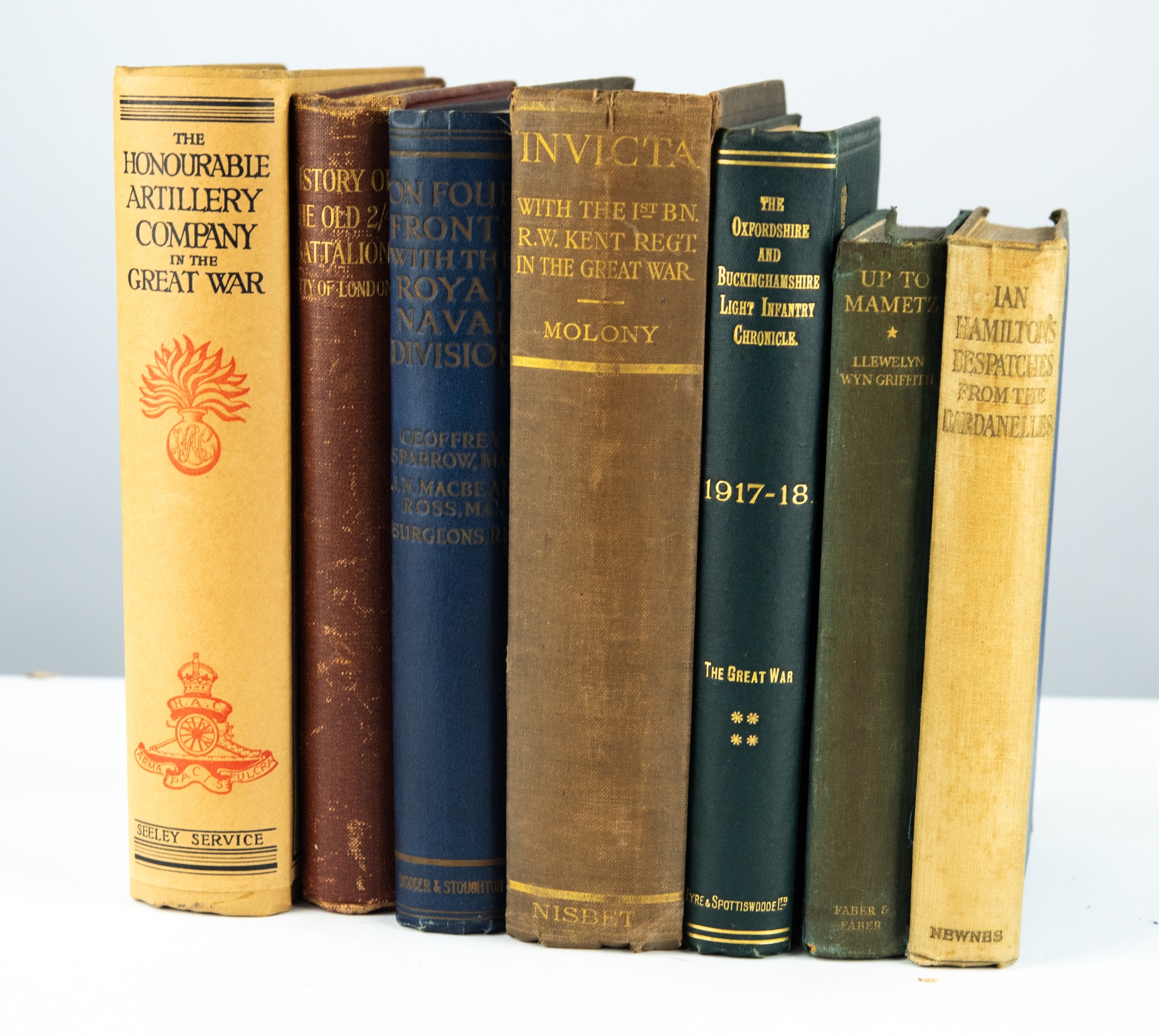 Molony - Invicta, with the First Battalion, the Queens Own Royal West Kent Regiment in the Great War, pub Nisbet & Co Ltd, 1923. Lieut Colonel A F Mockler - Ferryman- The Oxfordshire & Buckingham Light Infantry Chronicle 1917-1918, pub Eyre Spottiswoode ltd. The History of the Old 2/4th City of London Battalion The London Regiment, Royal Fusiliers, pub Westminster Press, 1919. Together with a small group of similar period titles of Military interest, mainly relating to WORLD WAR ONE. (7)