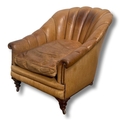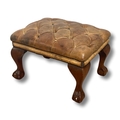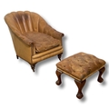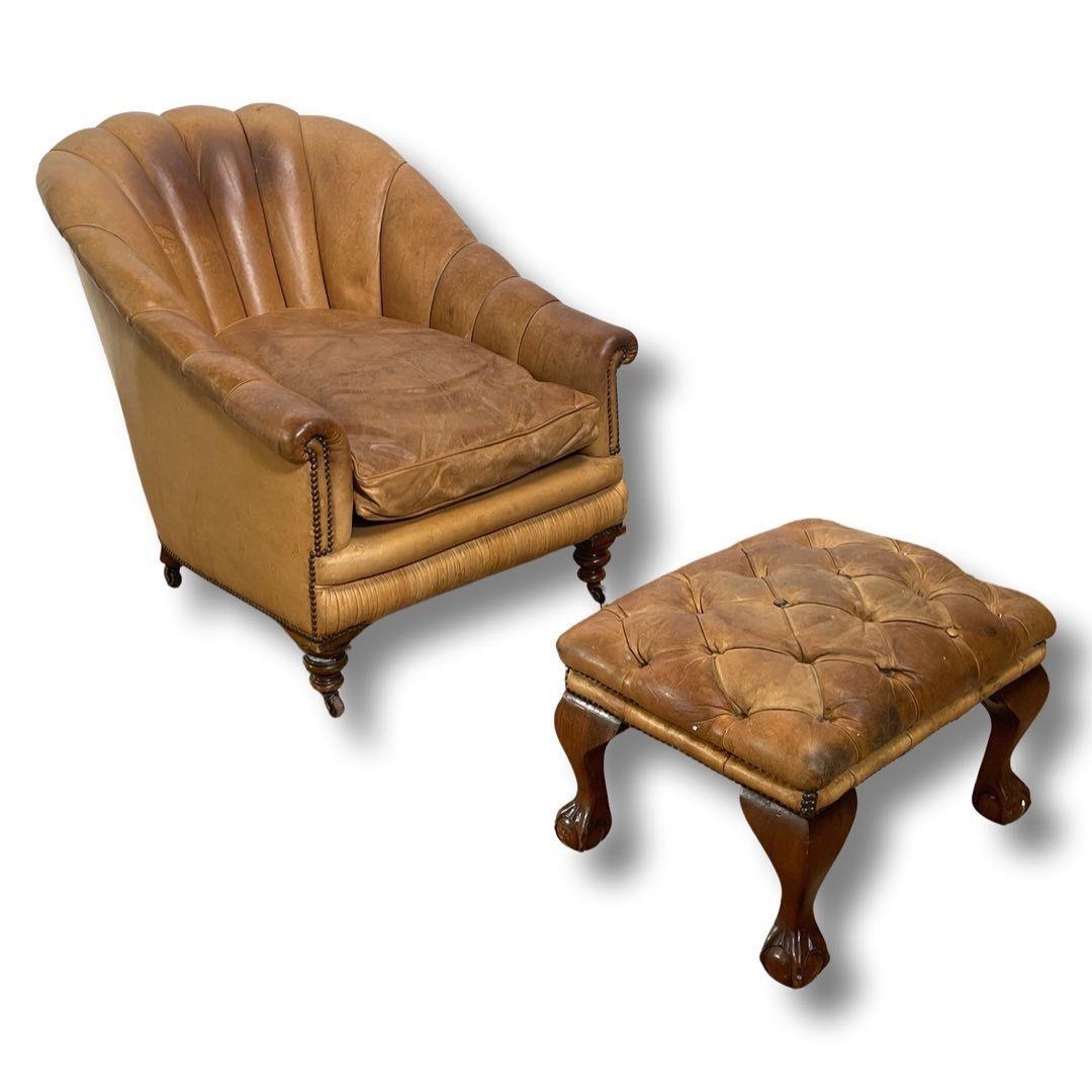 Quality large shell back leather armchair in honey tan with great patina and matching full button chesterfield stool in the same warm colour Chair 81 h x 100 d x 74 w x 50 sh Stool 57 w x 44 d x 40 h c1930’s