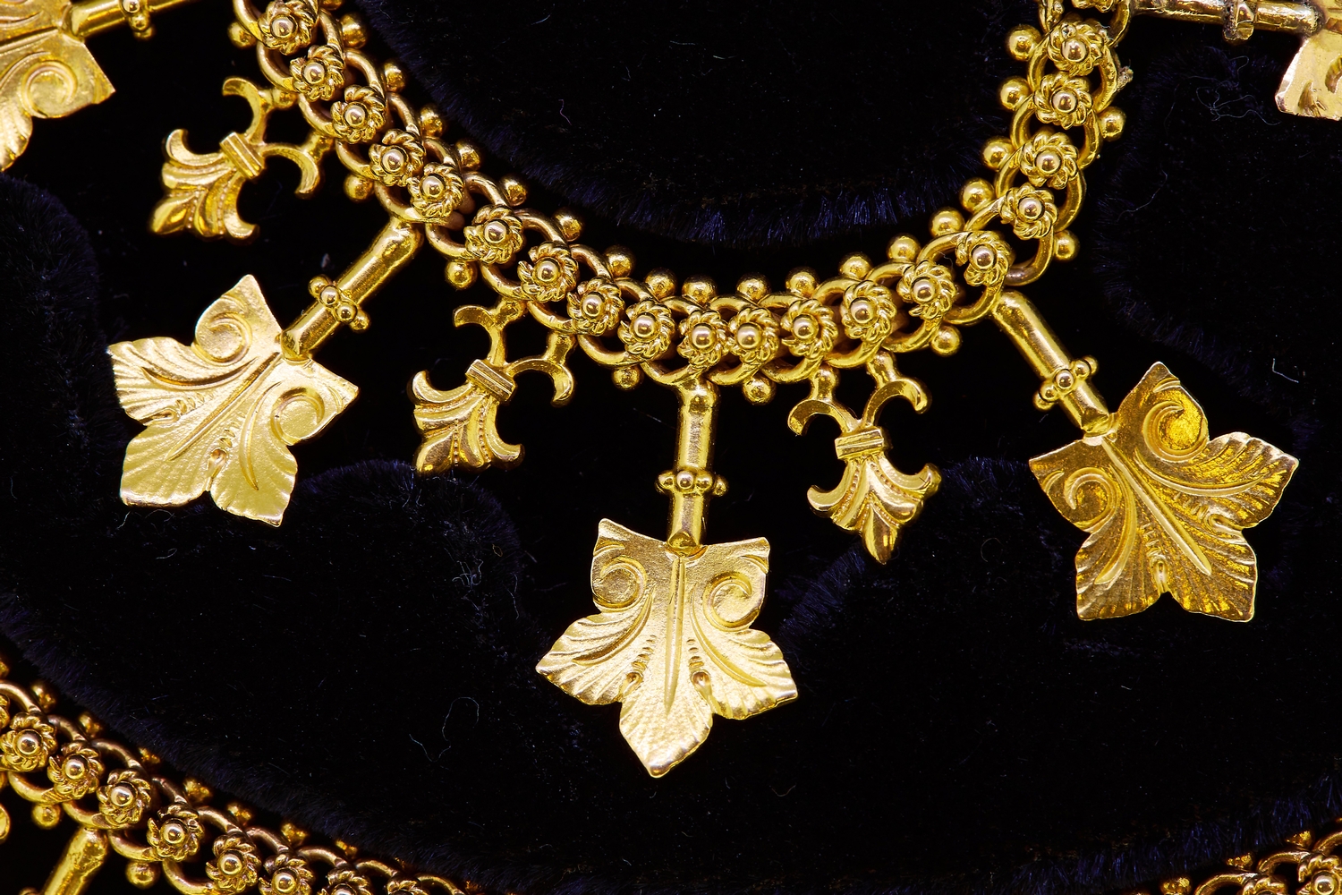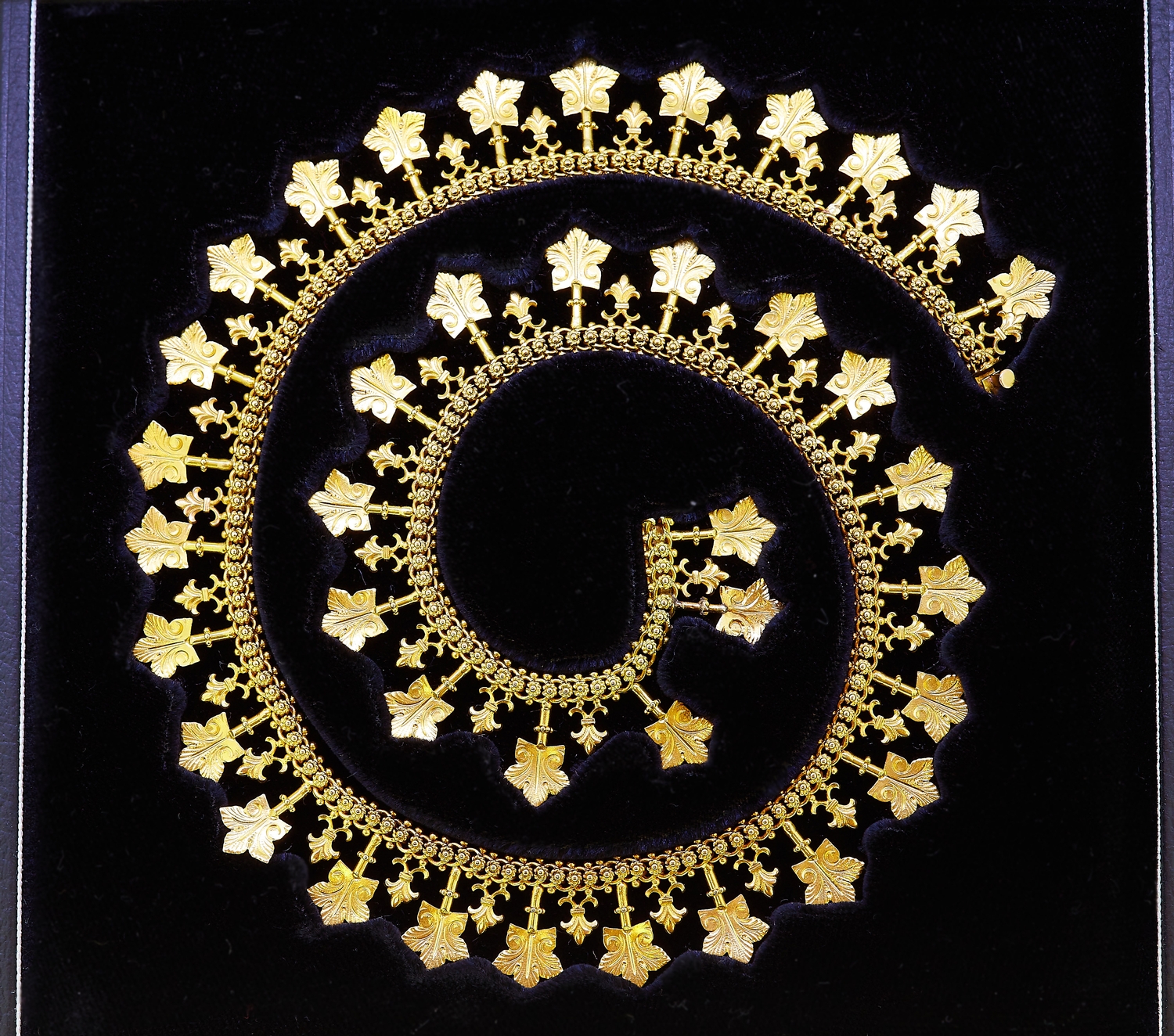 IMPORTANT ANTIQUE VICTORIAN FLORAL DORP NECKLACE, the fancy link necklace alternated with fleur-de-lis drops and larger floral drops. L. 45 cm. 67 grams. With a fitted box.