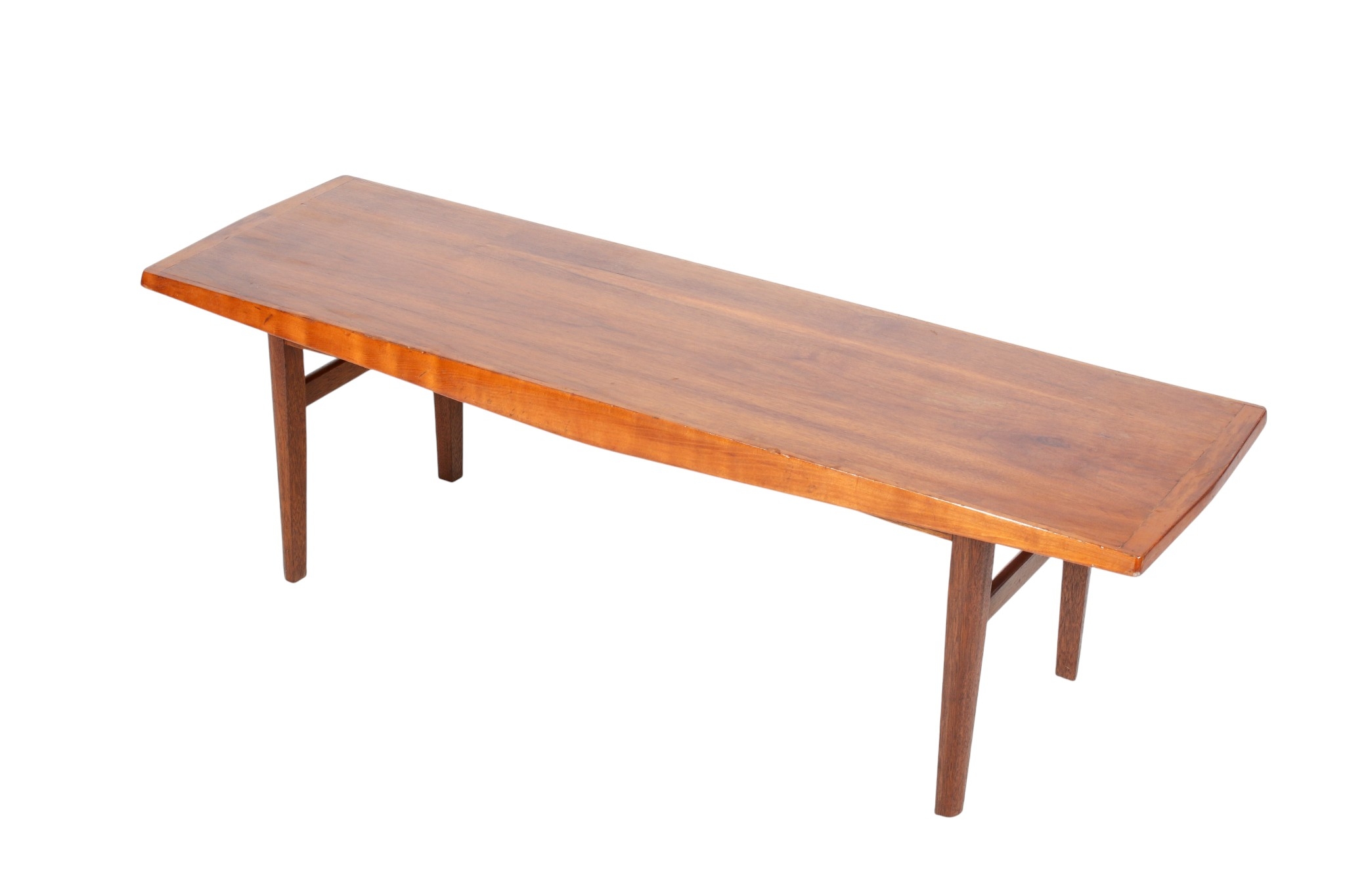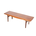 A mid-century teak coffee table in the style of Gordon Russell. The rectangular top mounted on turned supports, H39cm x W127cm x D41cm.
