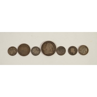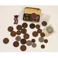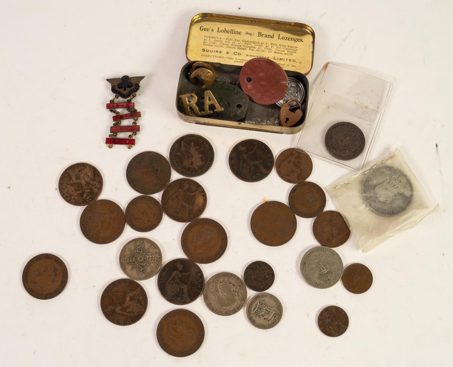 VICTORIAN SILVER CROWN COIN 1889, showing wear, A LATE NINETEENTH CENTURY PROVINCE DU BAS CANADA half penny bank token 1837 (F), a SELECTION OF MAINLY GEORGE V COINAGE including two silver florins 1920 and 1923, approx 25 coins in total mainly (F). TOGETHER WITH A VINTAGE BELLE VUE SPEEDWAY BADGE with year clasps for 1947-1950 and FIVE OTHER ITEMS in a VINTAGE GEES LOVELLINE LOZENGES TIN