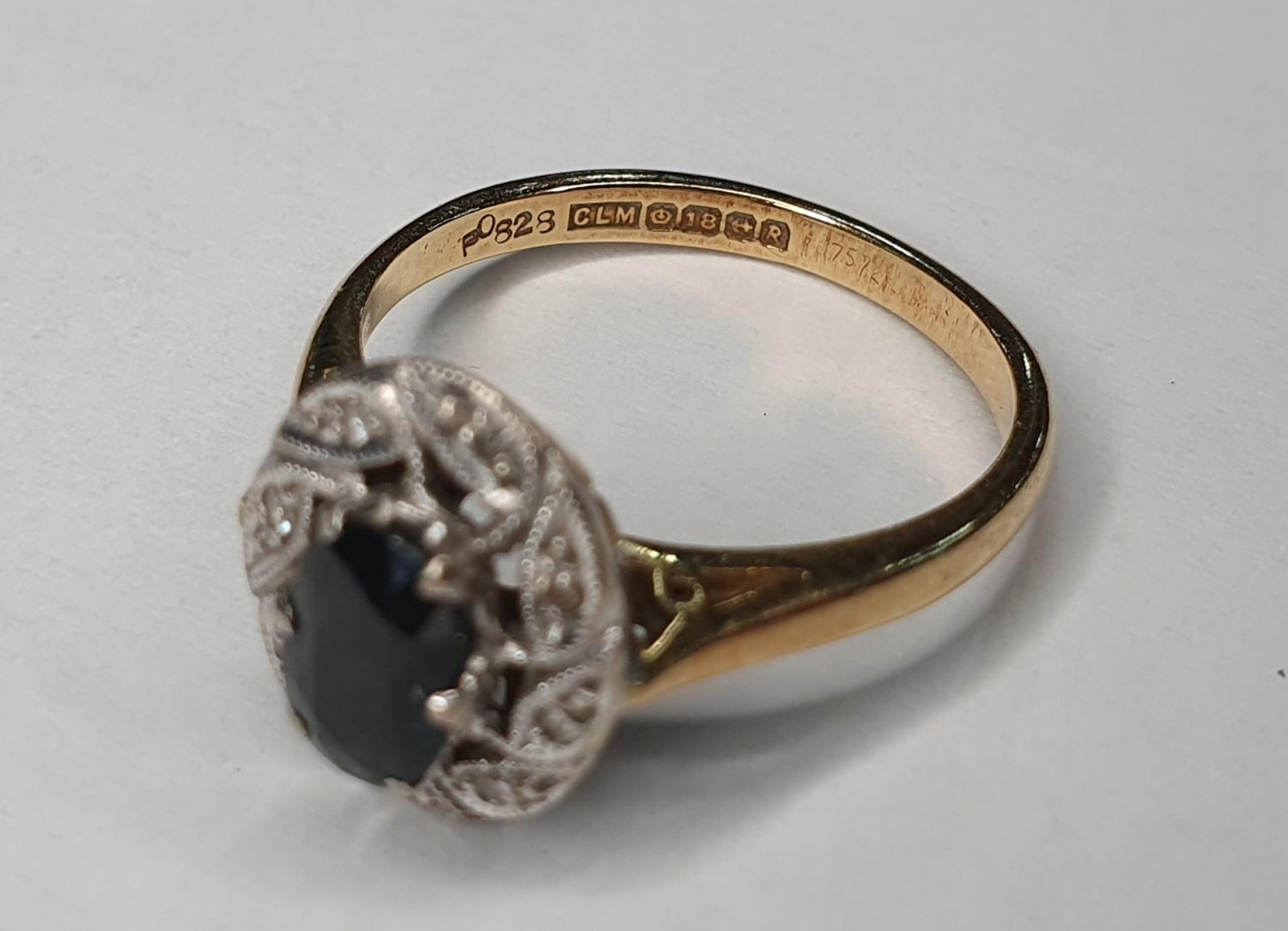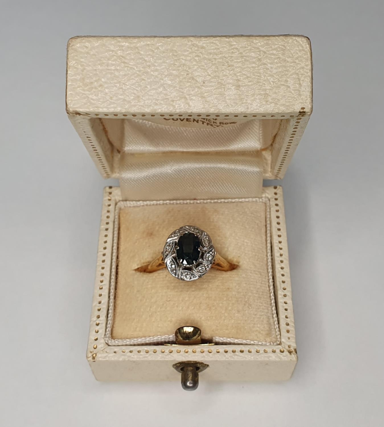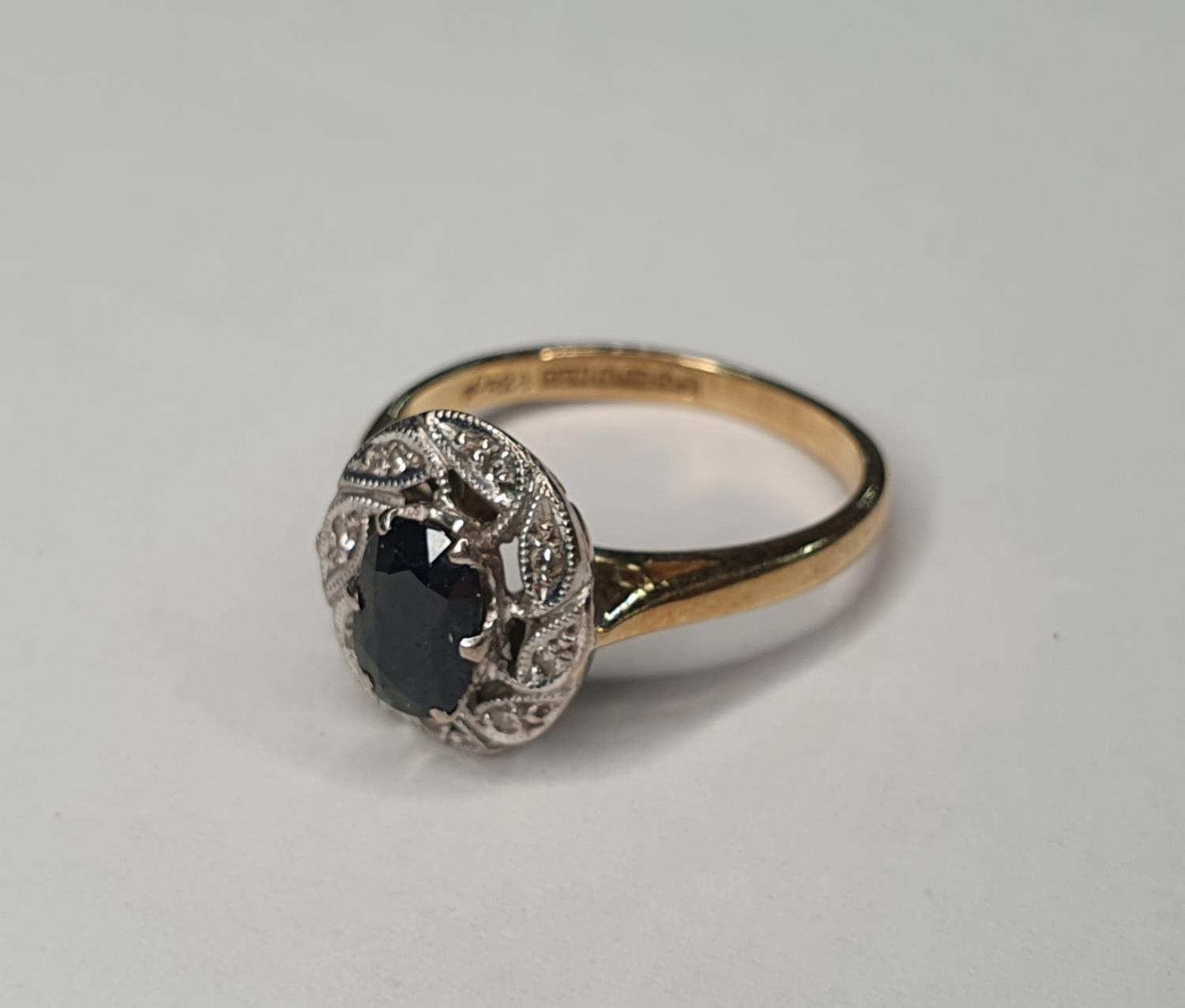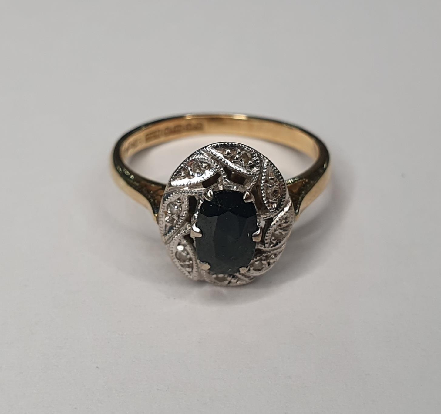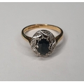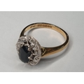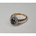 18ct yellow gold Sapphire and diamond ring (approx 0.4ct gross) surrounded by eight round cut diamonds (each diamond approx 0.5ct),