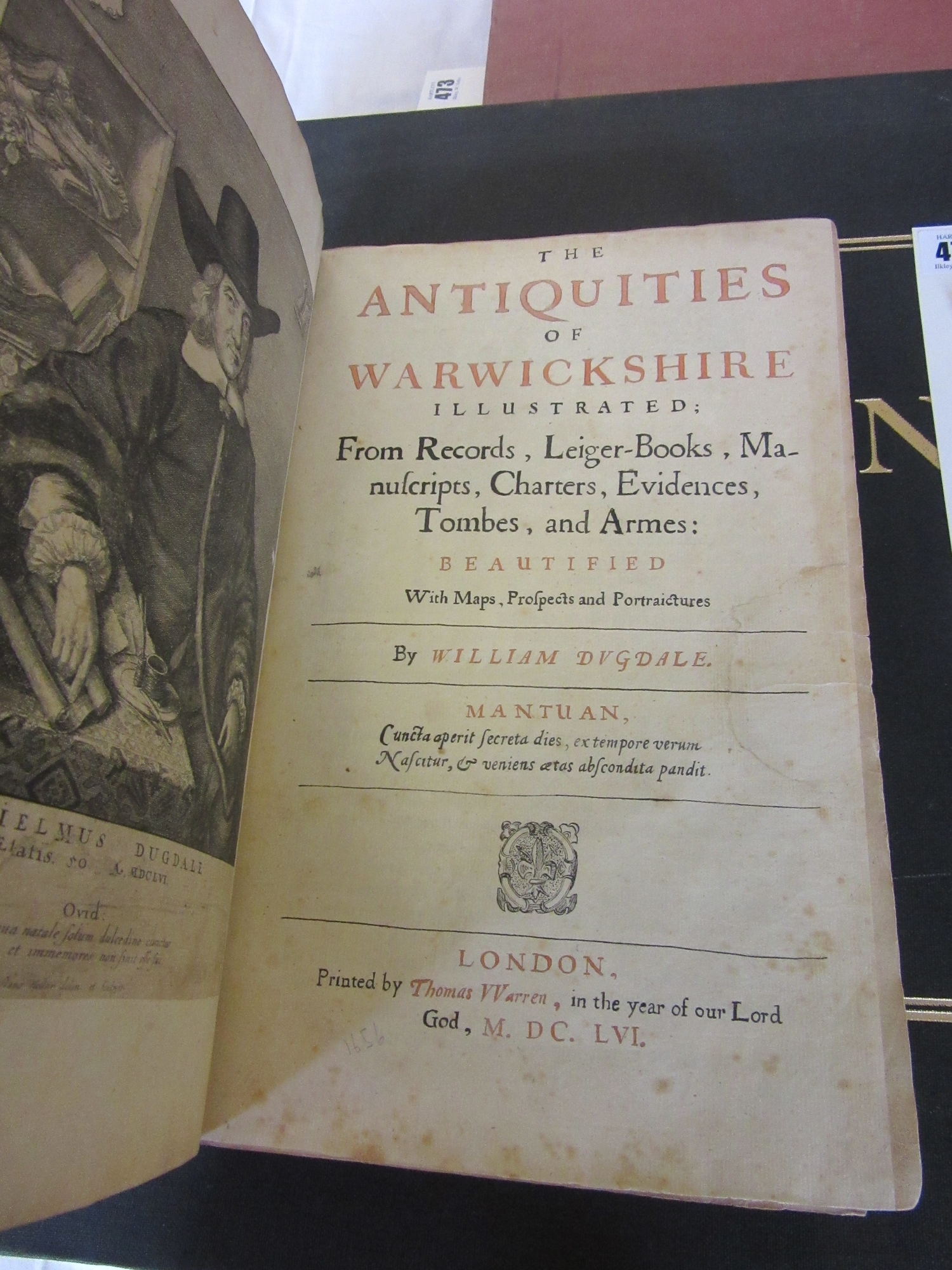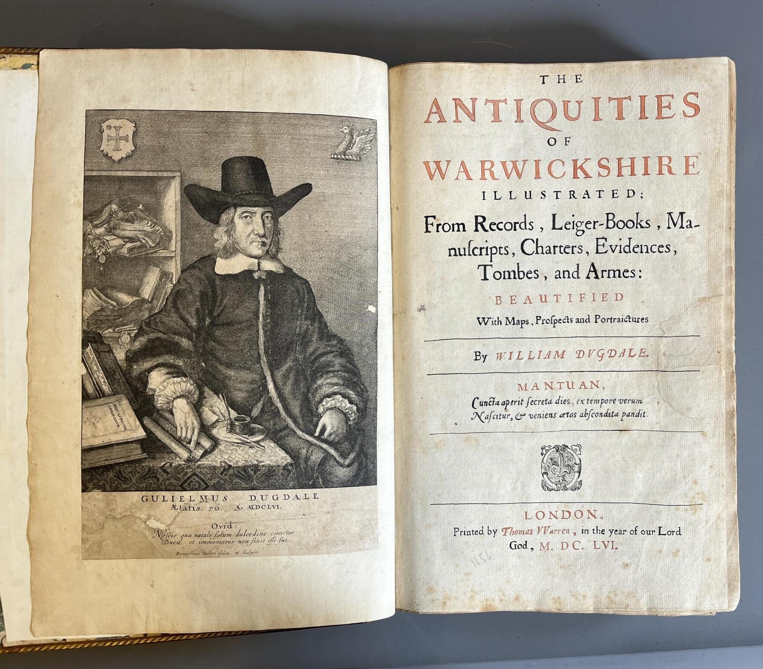 THE ANTIQUITIES OF WARWICKSHIRE, William Dugdale, 1655, Thomas Warren, diced calf binding with taped spine. Armorial bookplate of Robert Clark Paul. Sold WAF (Est. plus 20% premium)