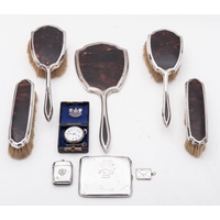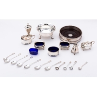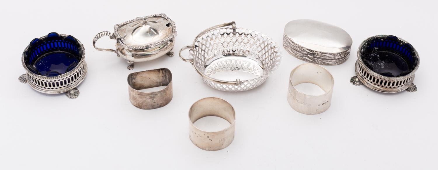 A mixed group of silver and silver plated items including; a Birmingham silver mustard pot of rectangular form and three napkin rings, 203gms., (6.5ozs.),gross, with a silver plated swing handle sweet meat dish, two circular salts with shaped blue glass liners and an oval box, (8)