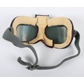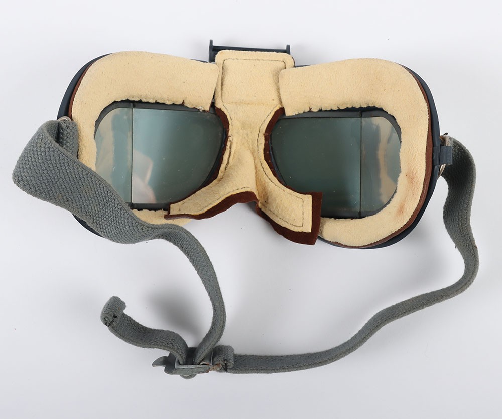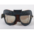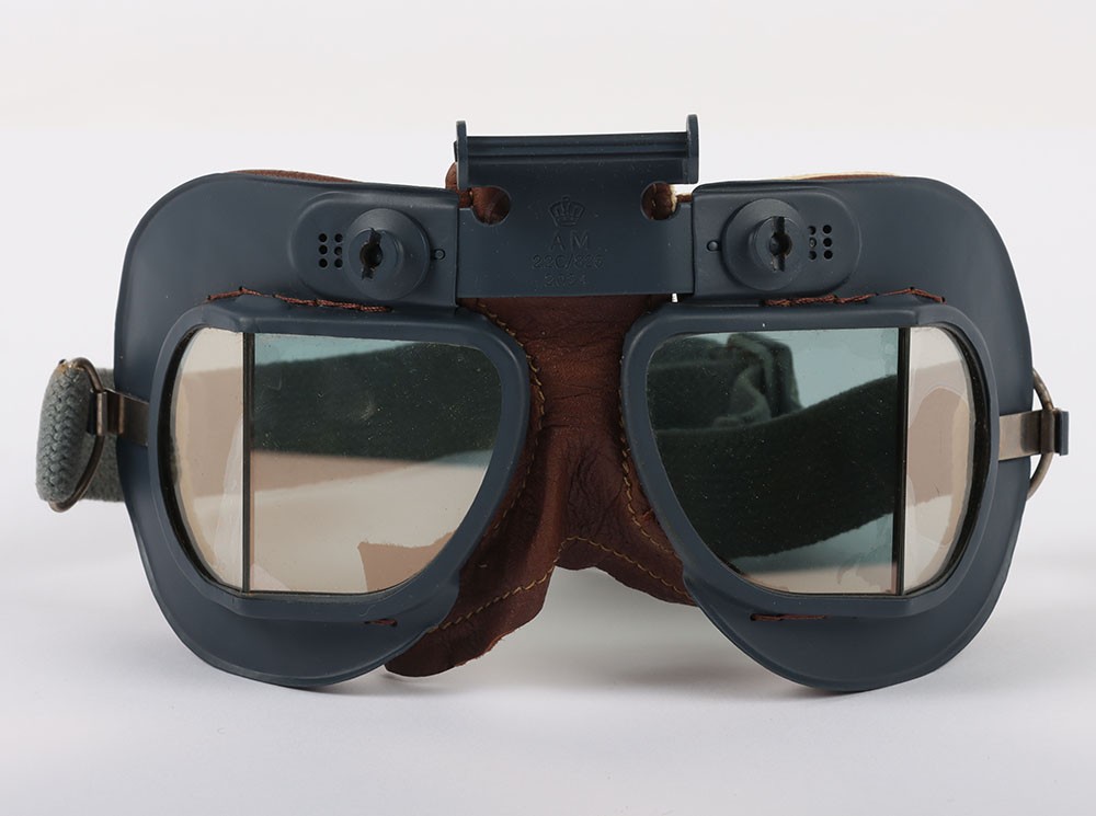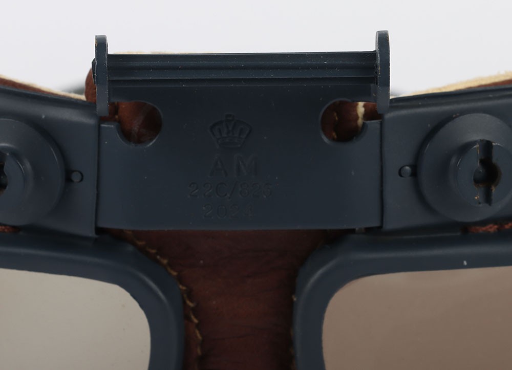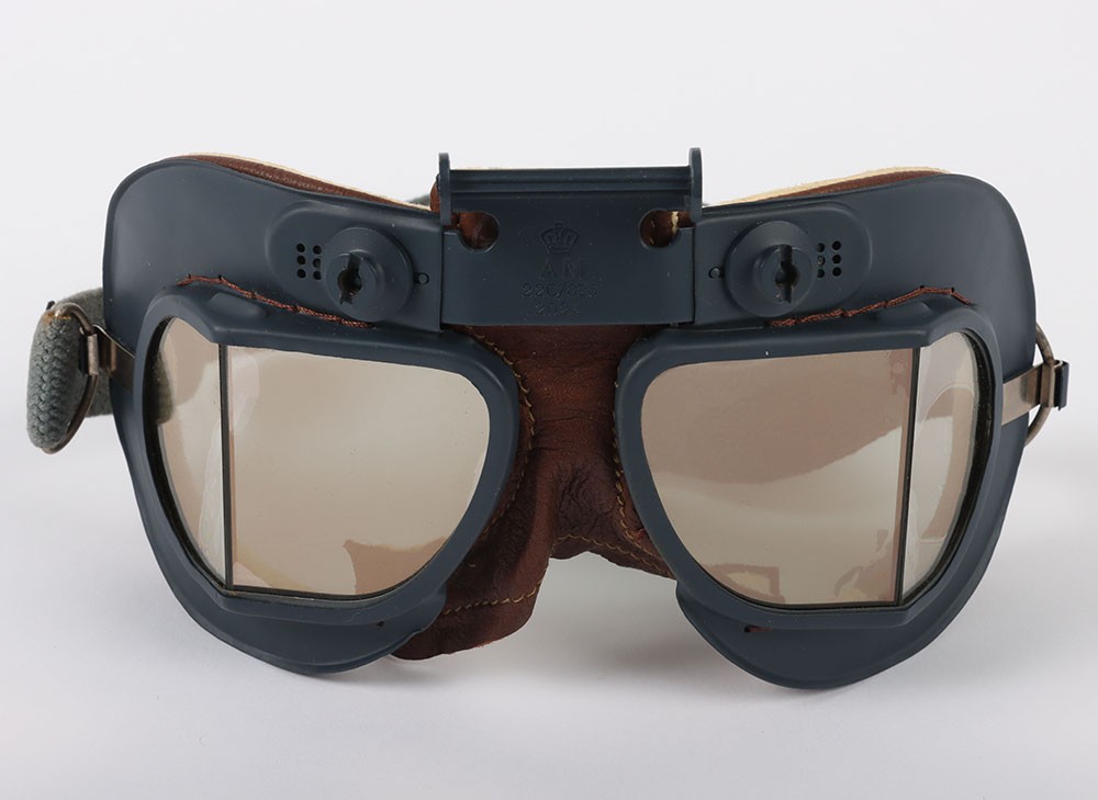 WW2 RAF Mk.VII Flying Goggles. A very good pair of original RAF Mk.VII flying goggles. Good frames with original adjustment nuts and retaining the blue grey paint work. The 'AM' and crown with the stores code 22C/826 is stamped into the nose bridge. Leather surrounds with clean chamois leather and the later elastic type strap. Clear tinted lenses. Nice set of original goggles which have most likely been restored. Great for display purposes as used by the RAF and USAAF aircrews.