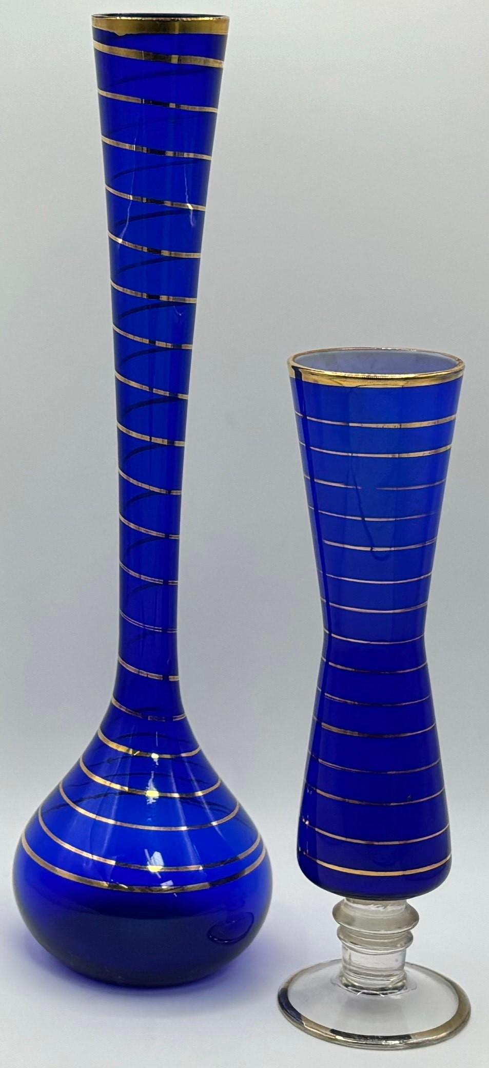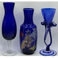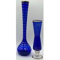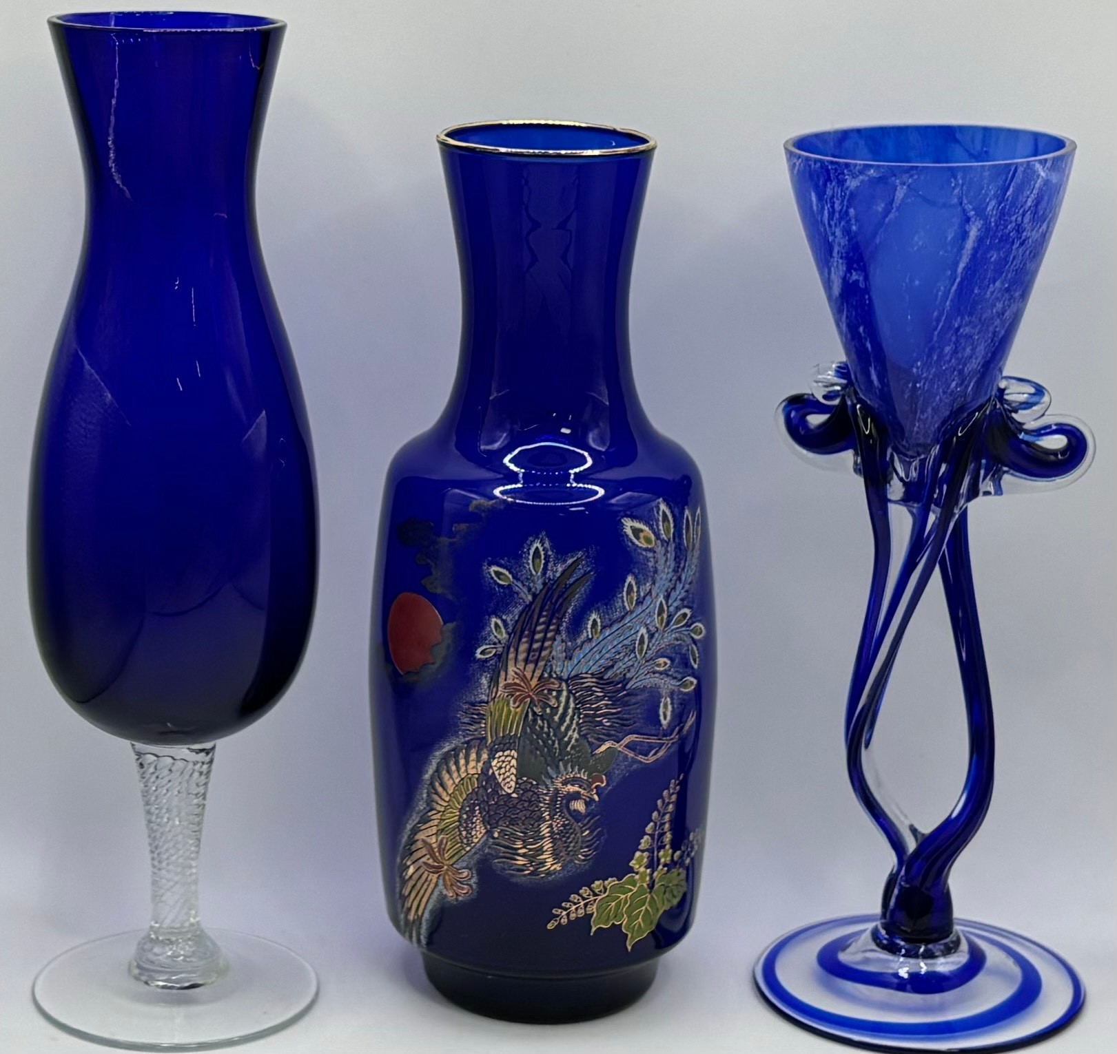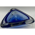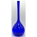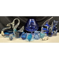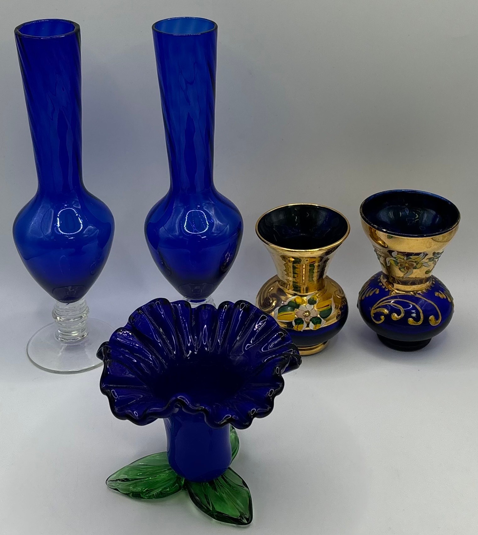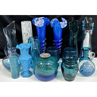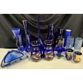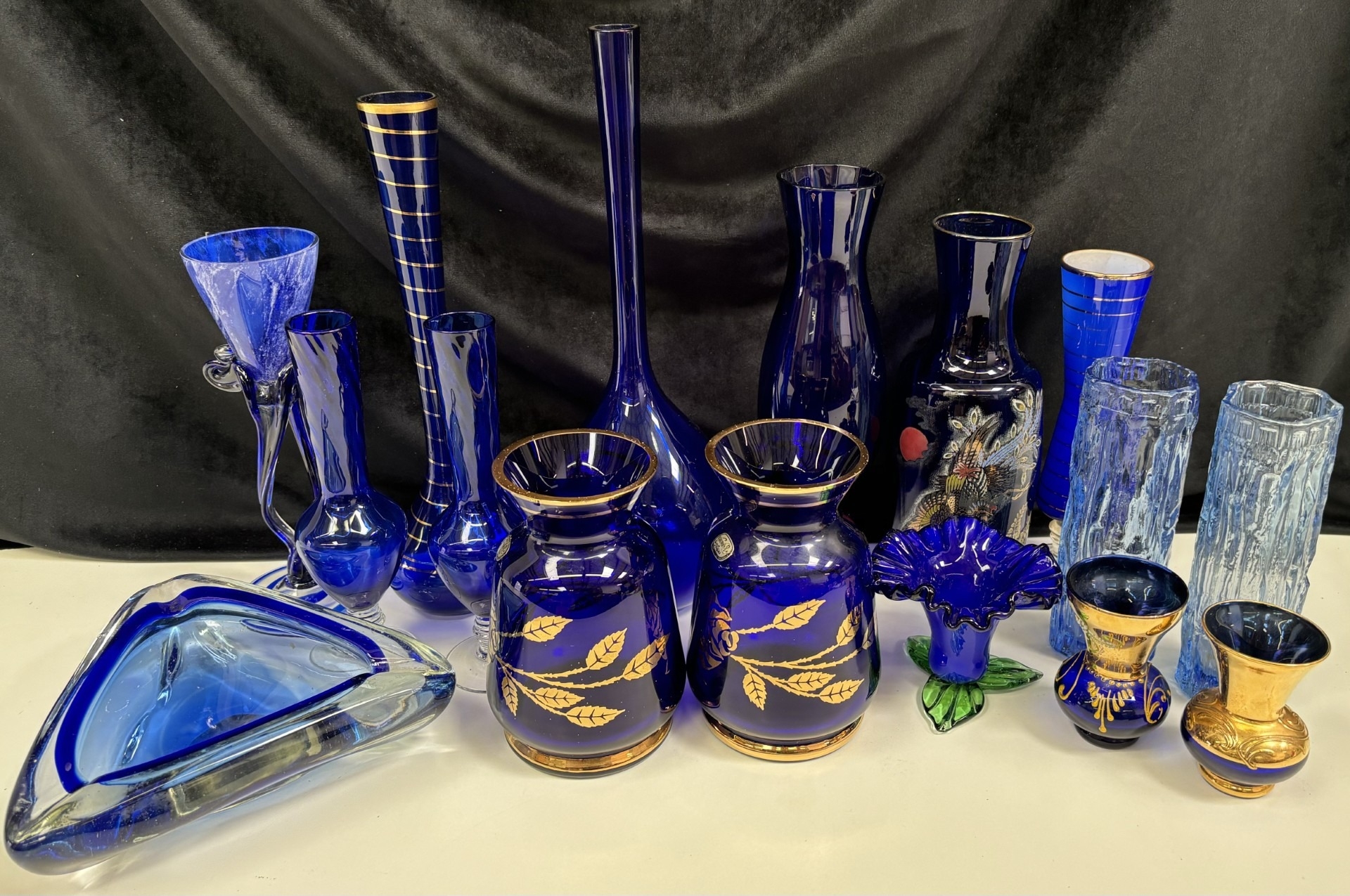 Collection of 16 pieces of mid-century cobalt blue/blue glass vases & dish. To include Bohemia Glass, Ravenhead (likely), etc. Tallest 34cm.