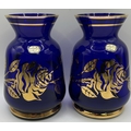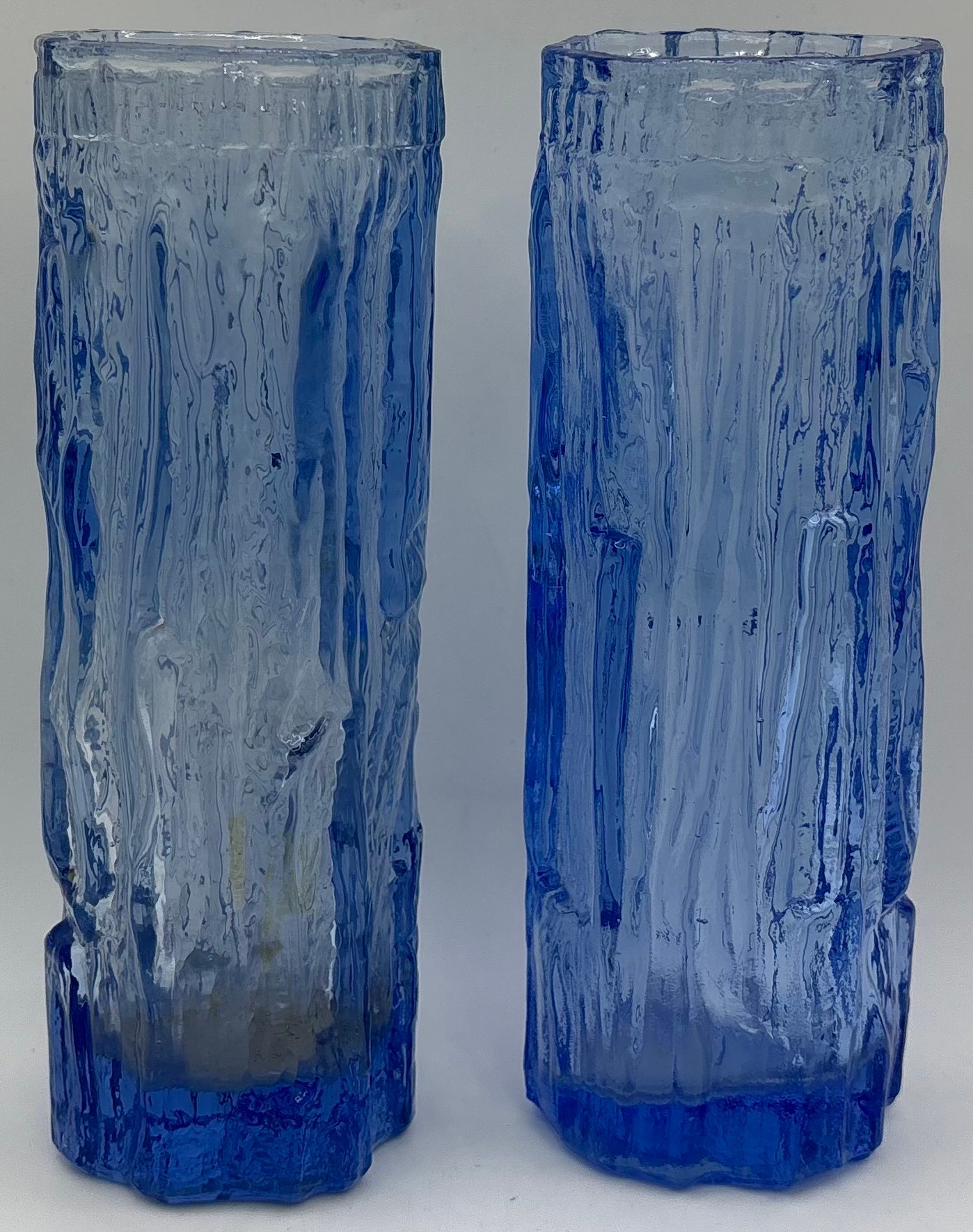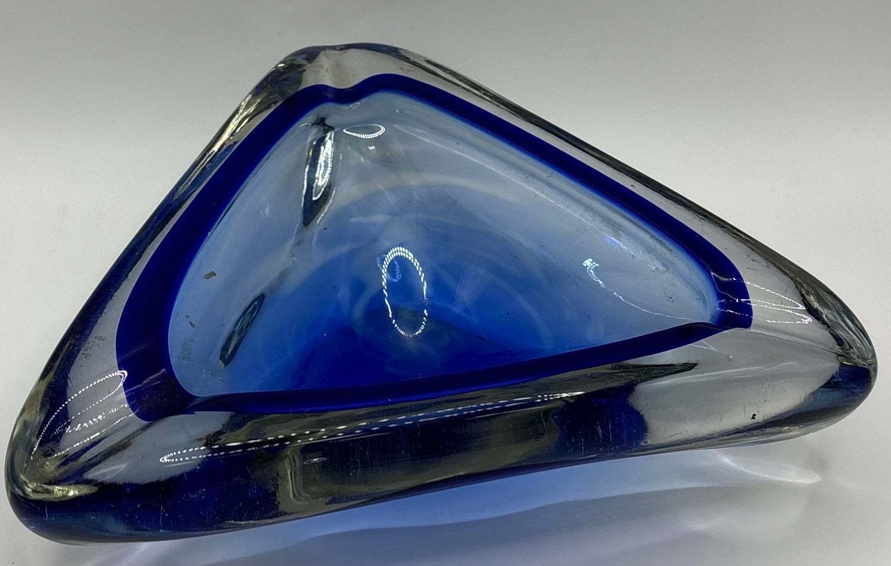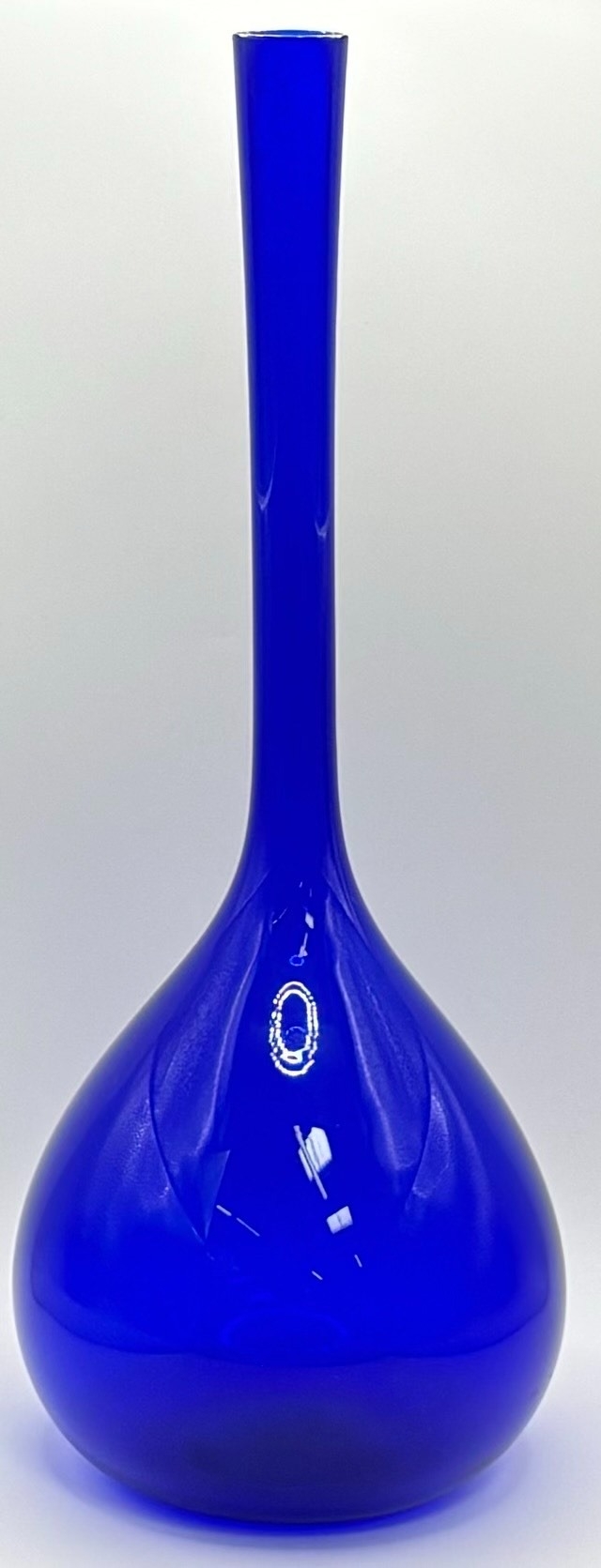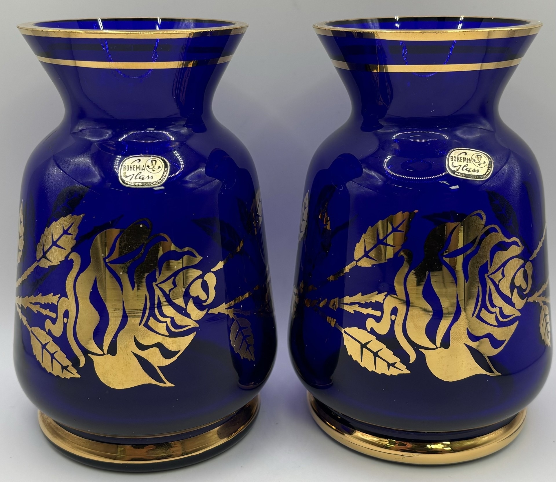 Collection of 16 pieces of mid-century cobalt blue/blue glass vases & dish. To include Bohemia Glass, Ravenhead (likely), etc. Tallest 34cm.