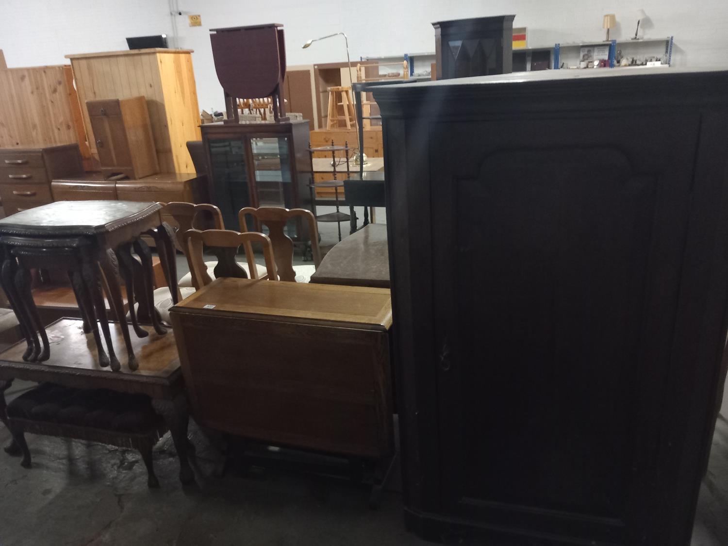 A corner cabinet, drop leaf dining table, nest of tables etc