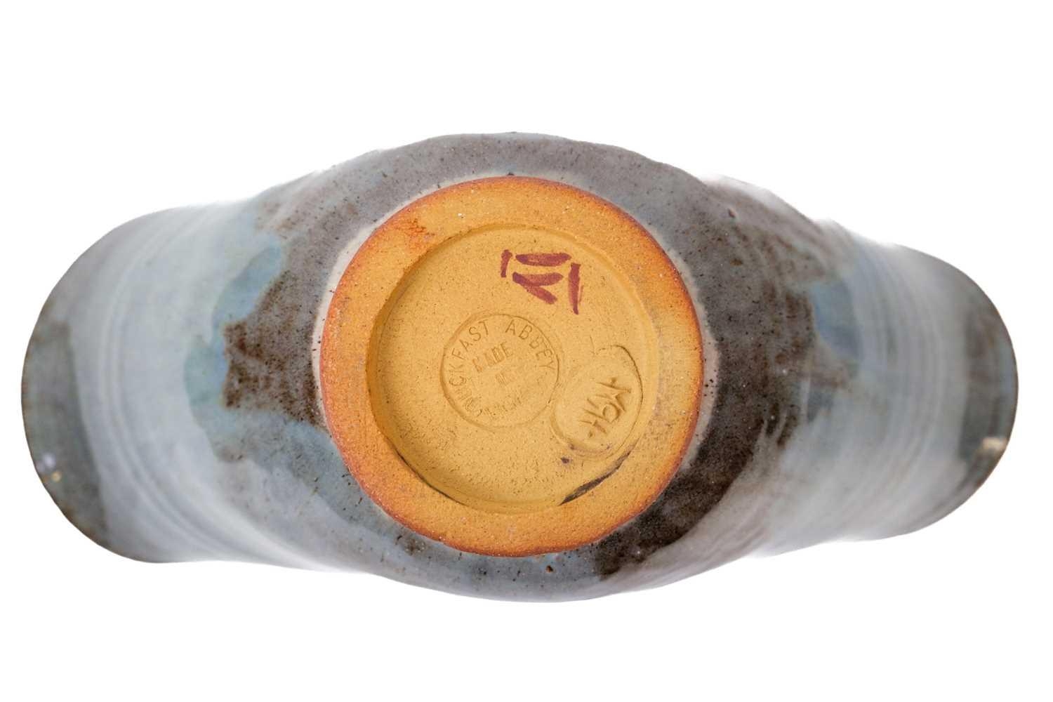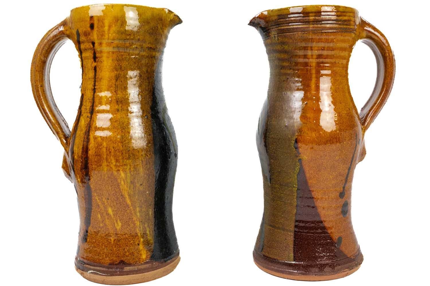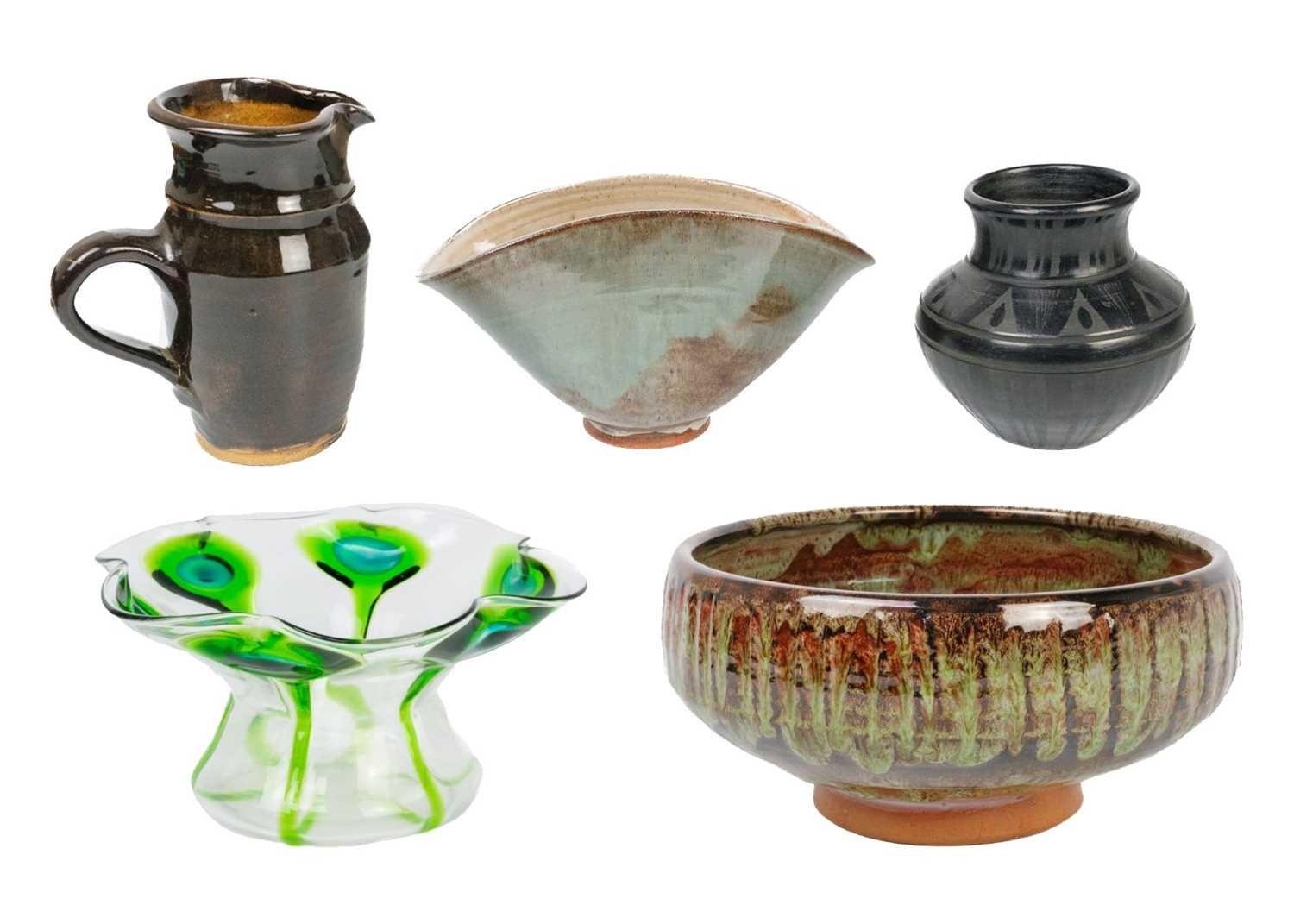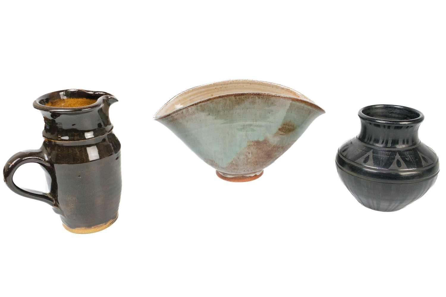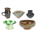 A collection of studio pottery. To include two bowls and a jug by Mary Gibson Horrocks of Buckfast Abbey studio pottery, two unmarked jugs in a brown glaze; together with a studio pottery vase marked to base and an art glass bowl. (7)