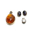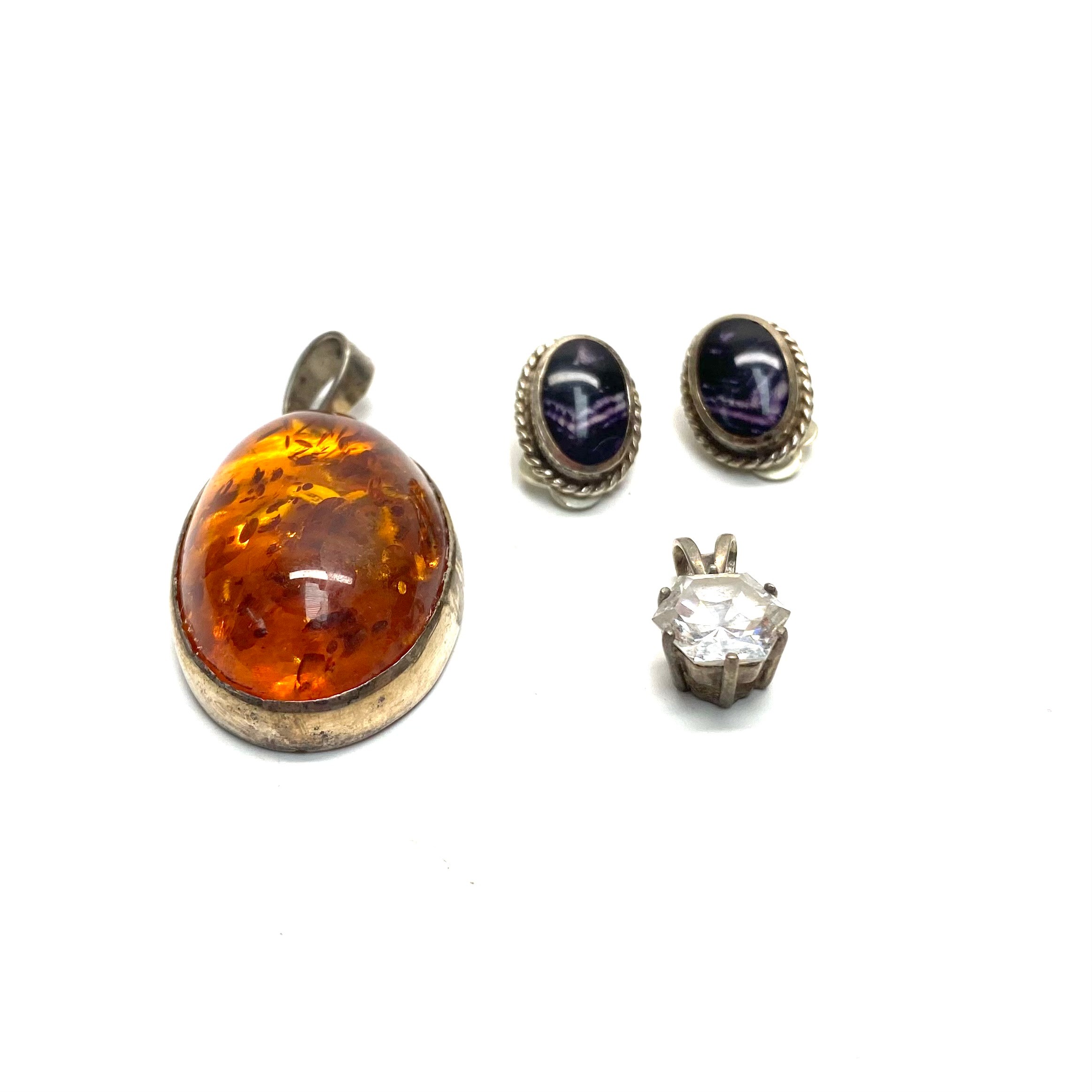 Large amber pendant with silver mount, pair of silver earrings and a silver pendant with large CZ stone.