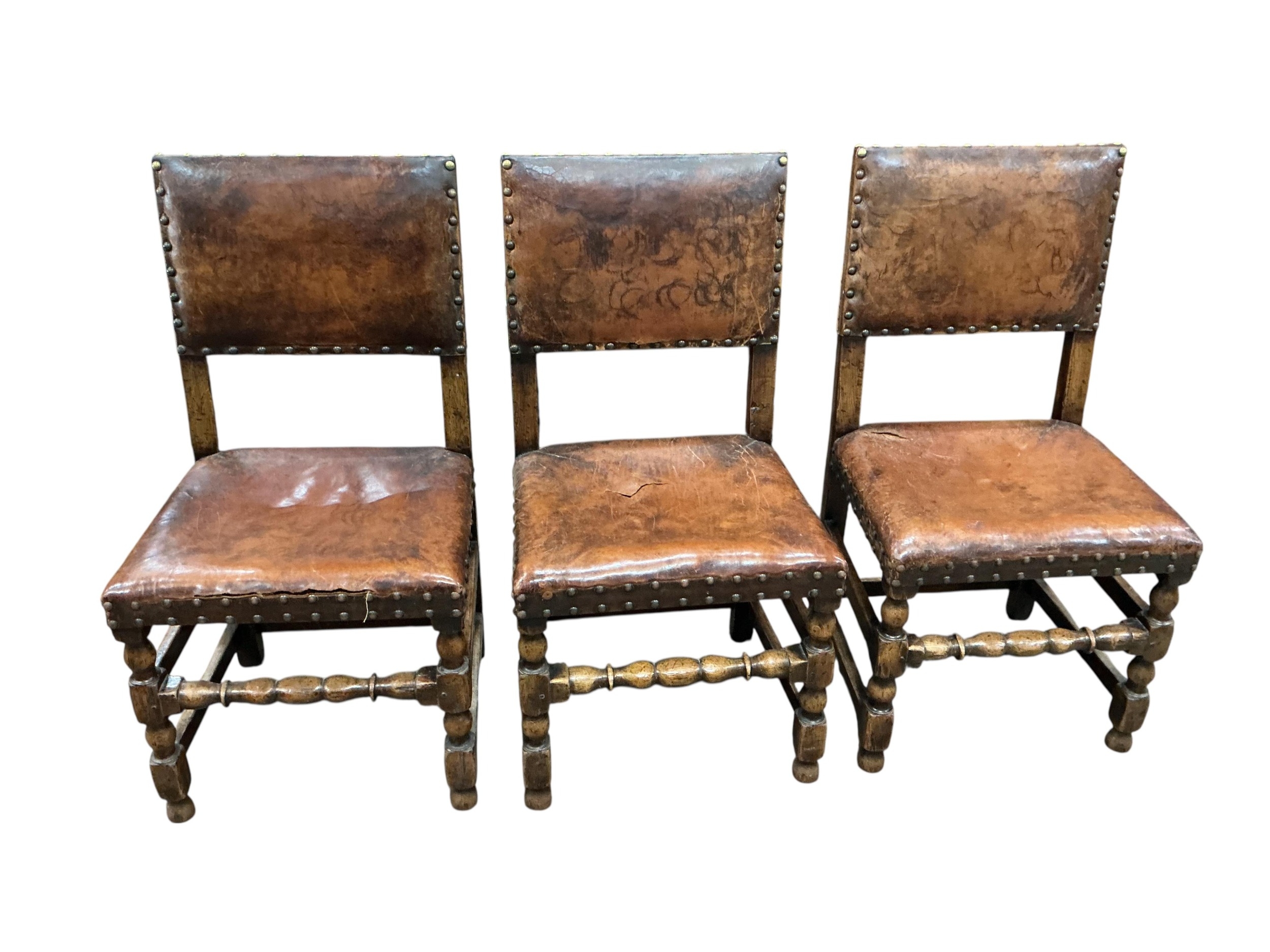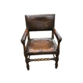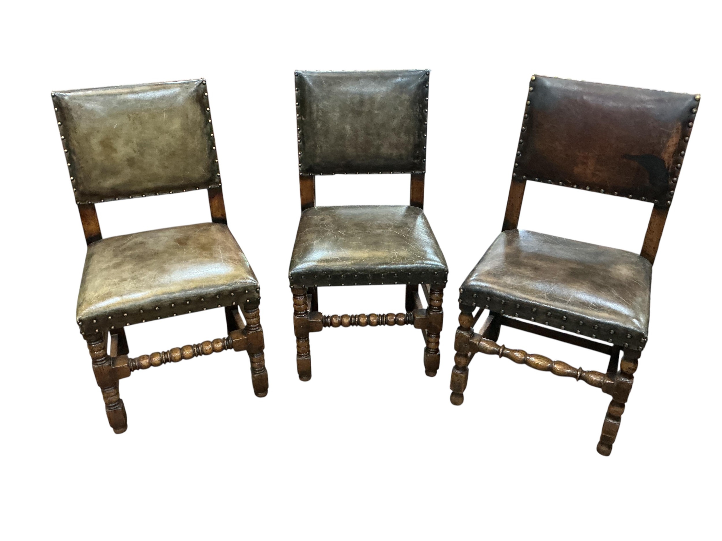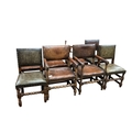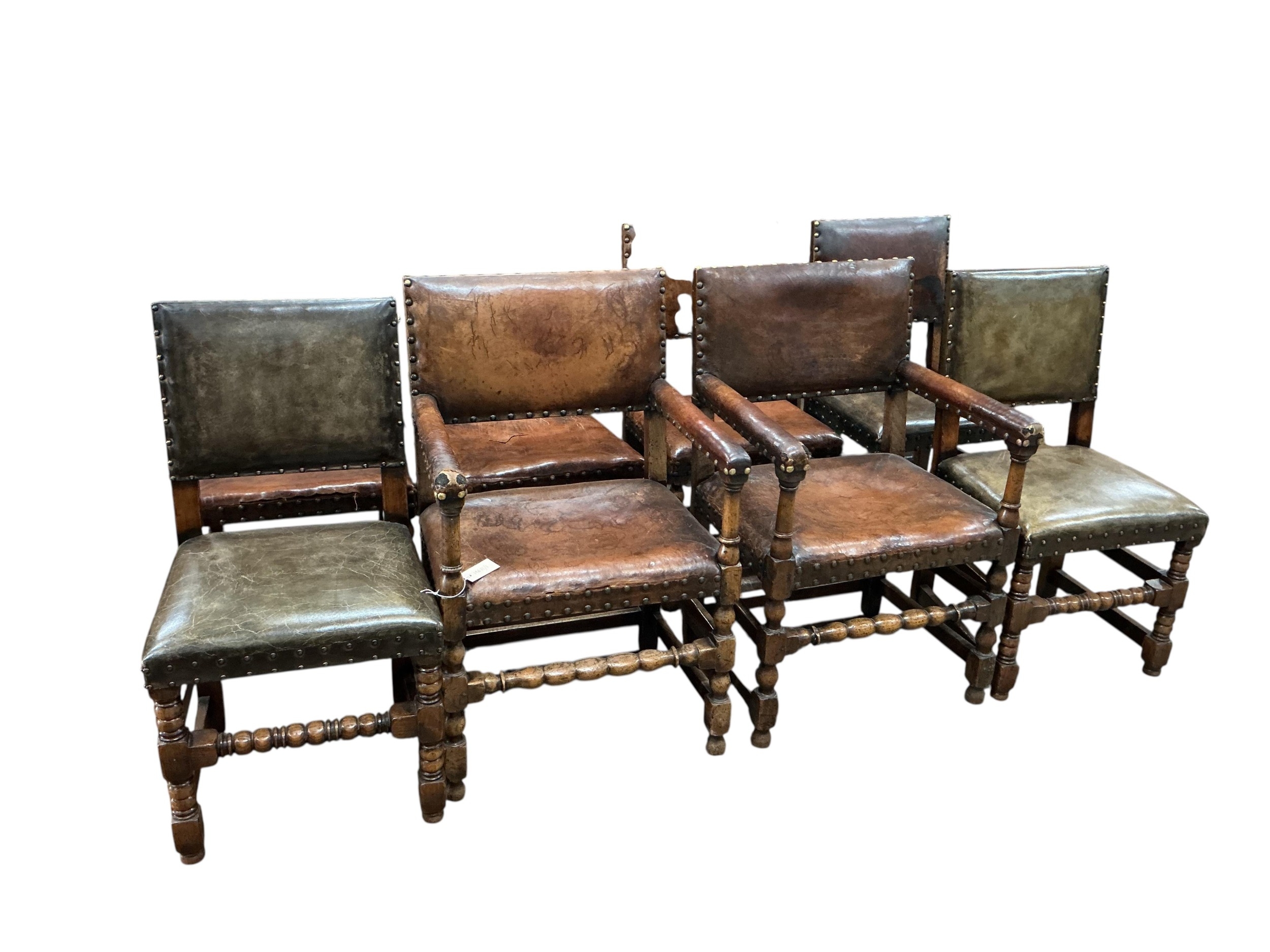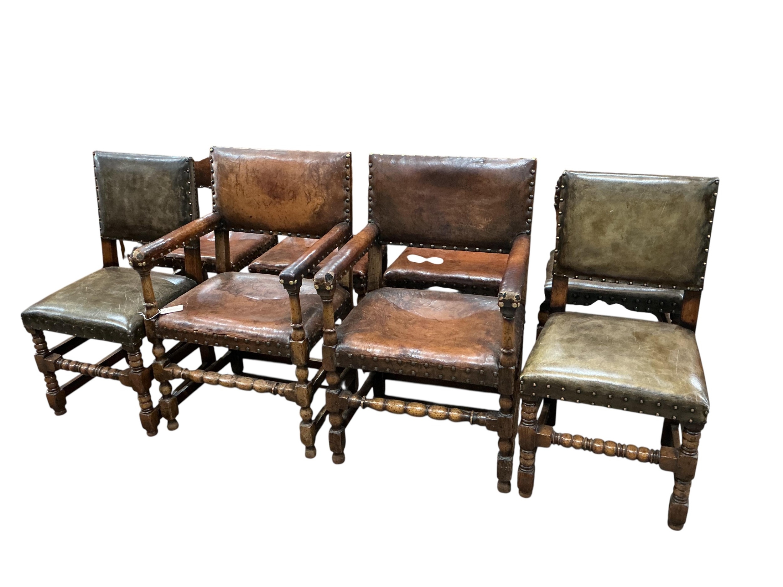 A set of eight Cromwellian style oak and tan leather dining chairs, two with arms