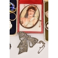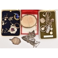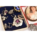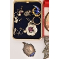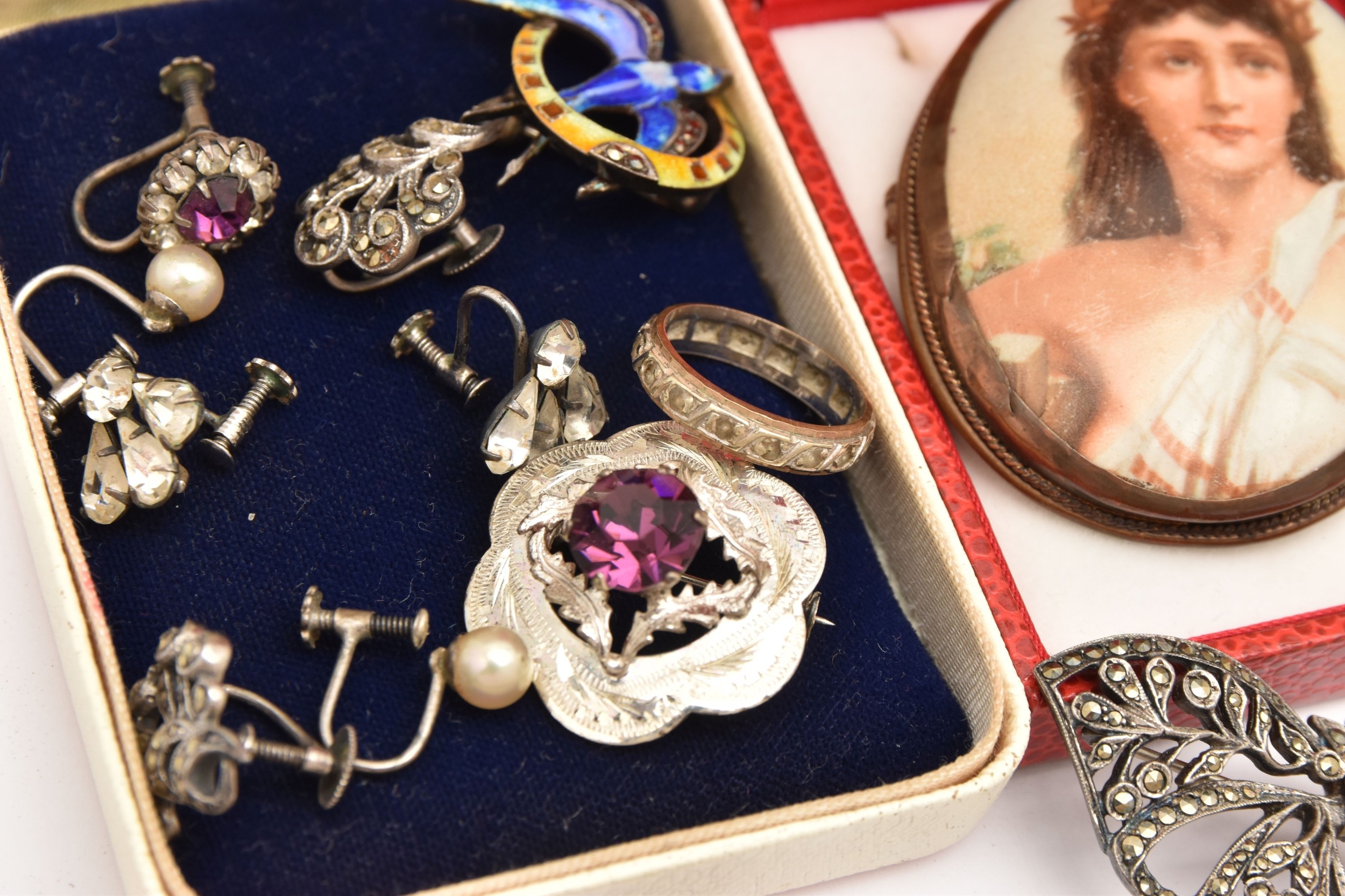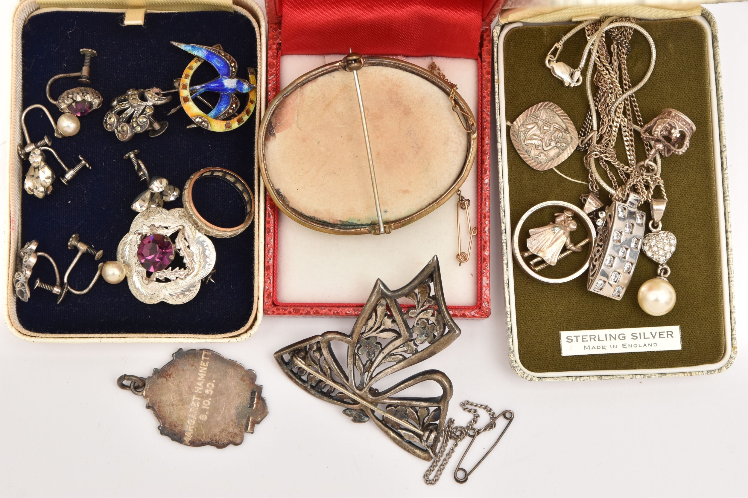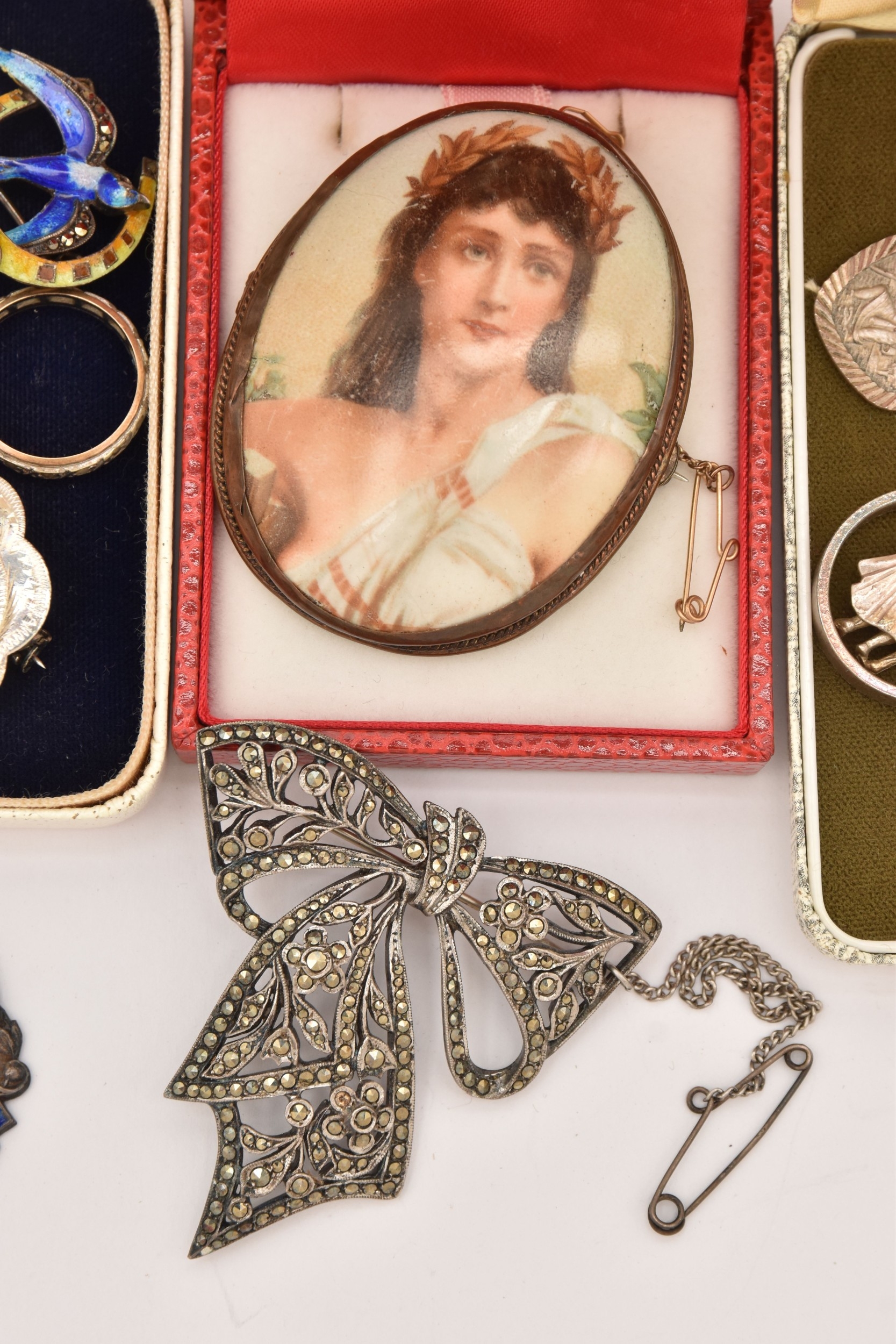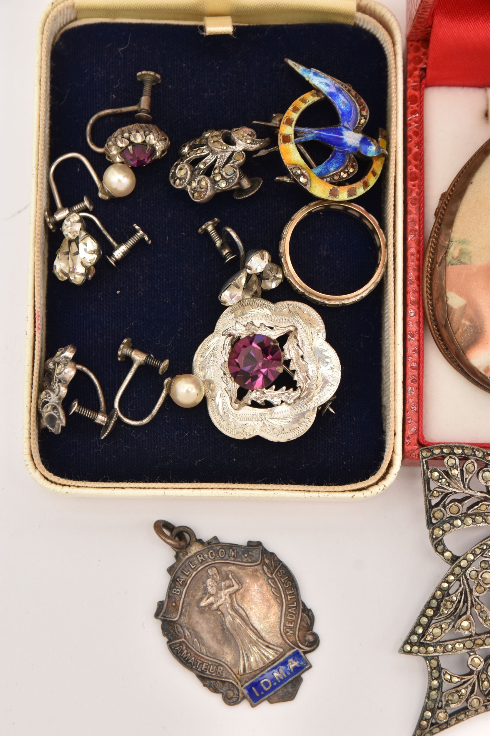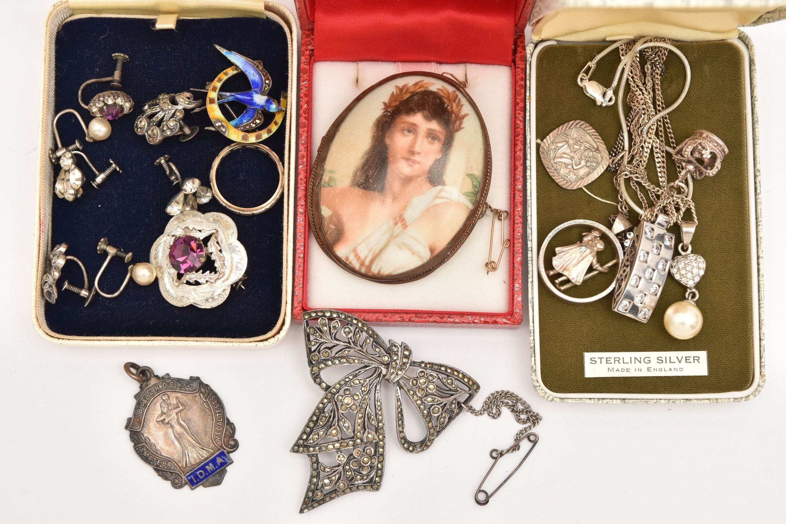 AN ASSORTMENT OF SILVER AND WHITE METAL JEWELLERY, to include a silver and marcasite bow brooch, a silver medal, both hallmarked, approximate gross weight 28.6 grams, together with an assortment of white metal jewellery items, some stamped 925, 800 or sterling, approximate gross weight 60.7 grams, also including a ceramic brooch, (condition report: general moderate wear)