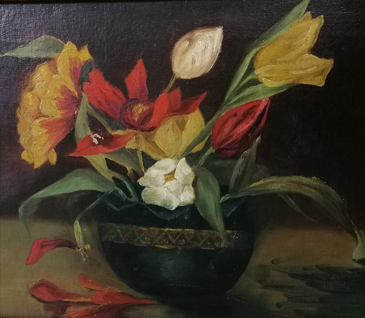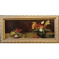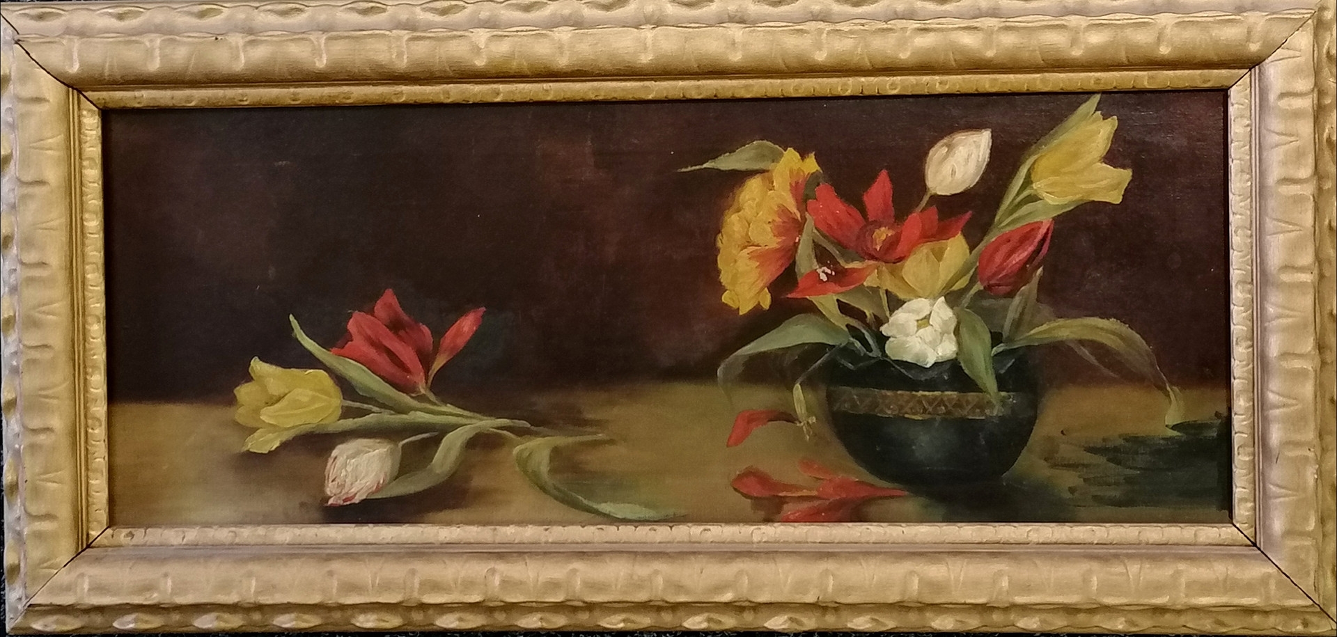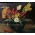 Unsigned oil painting on canvas of a vase of tulips frame 73cm x 36cm.