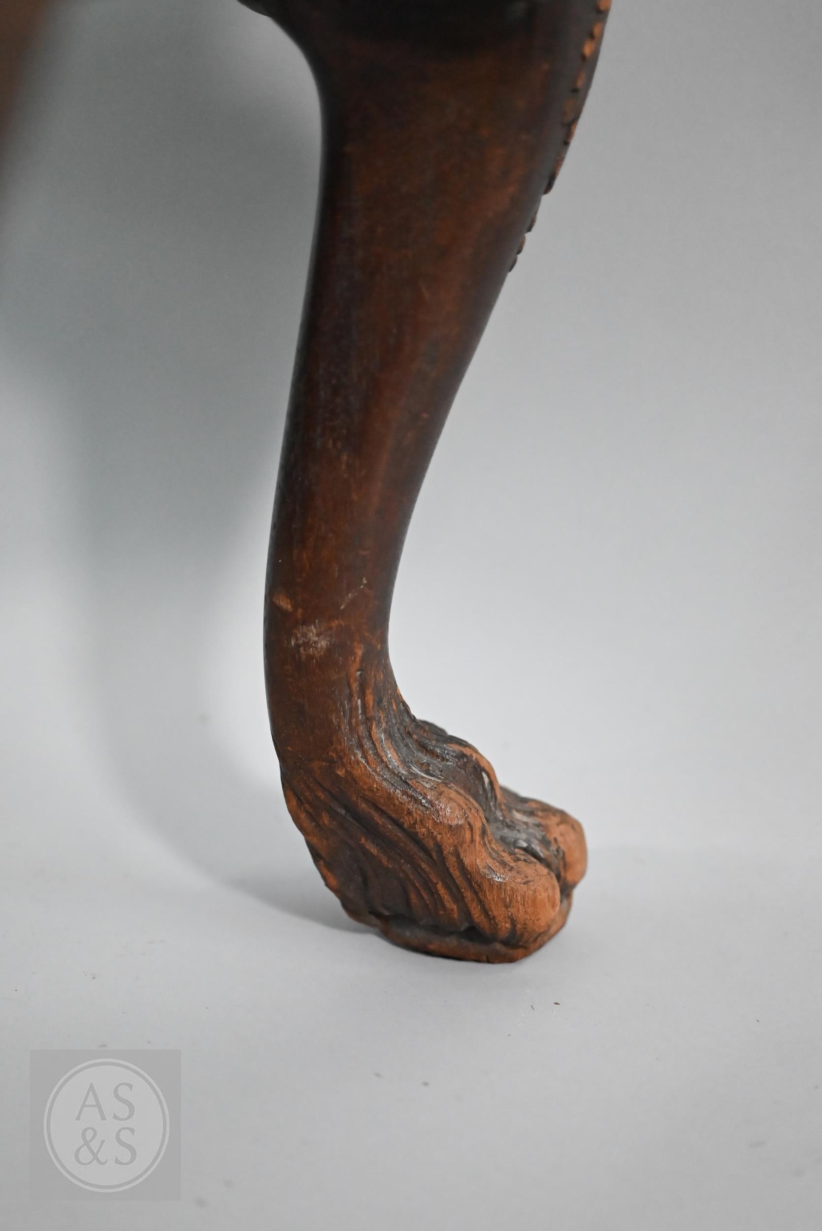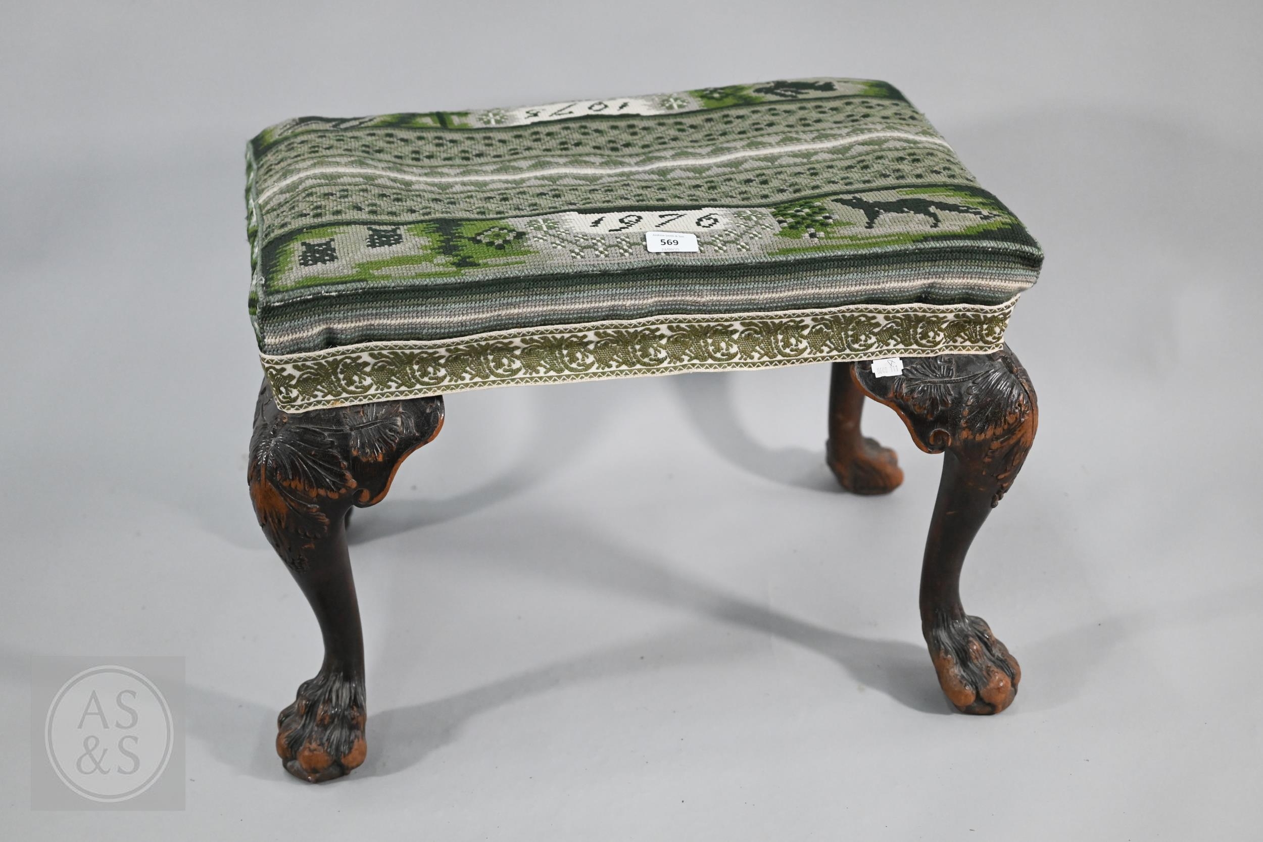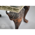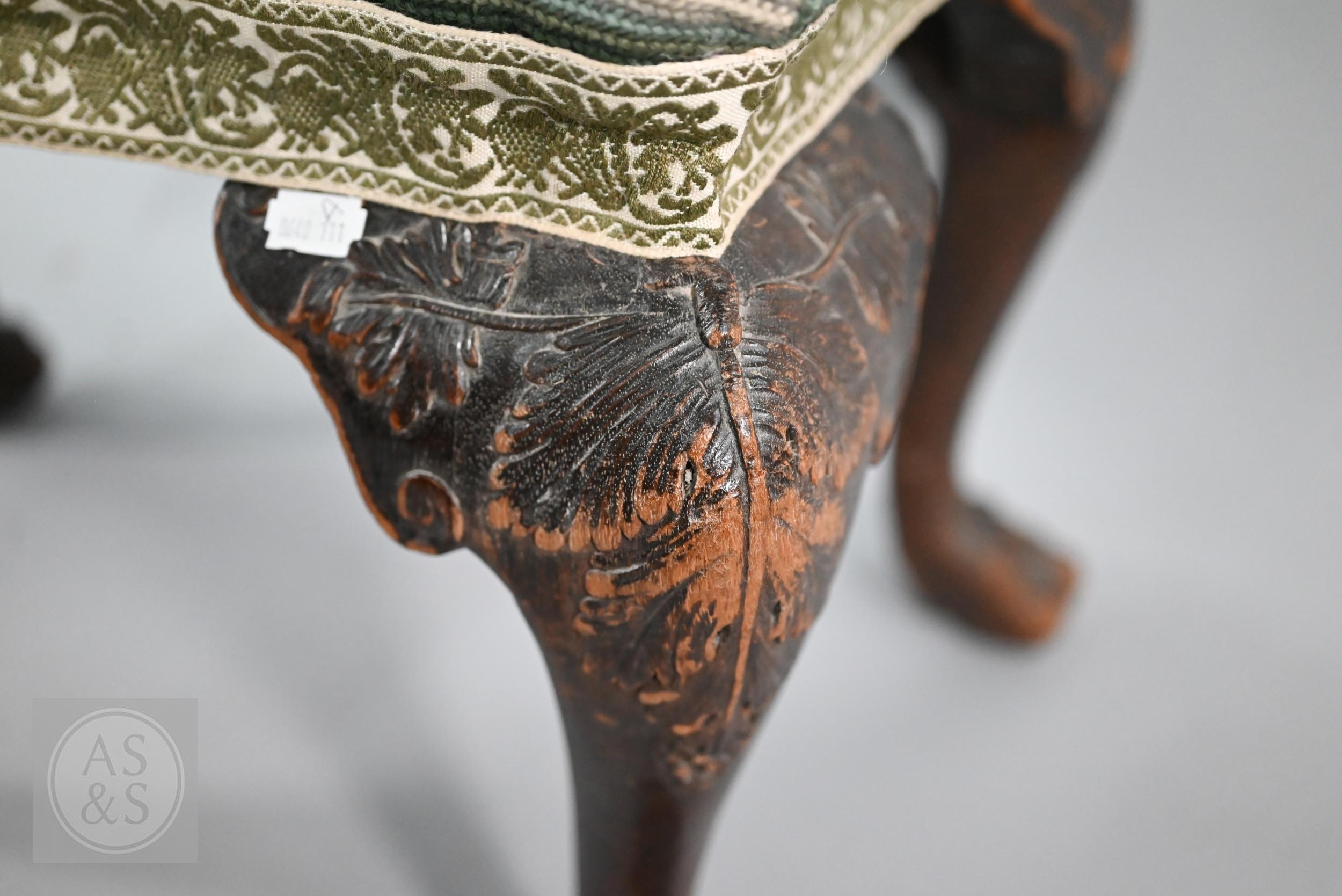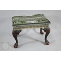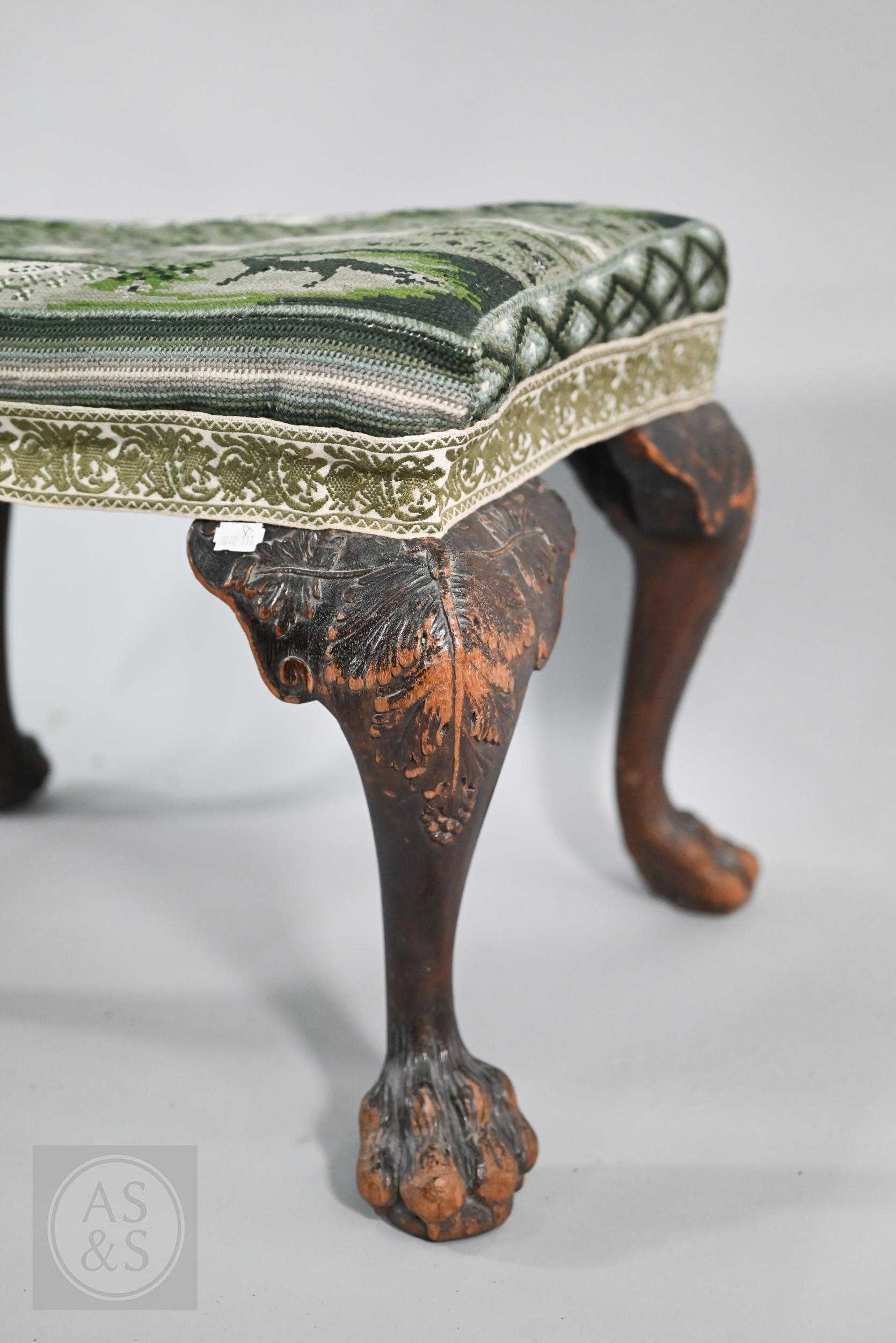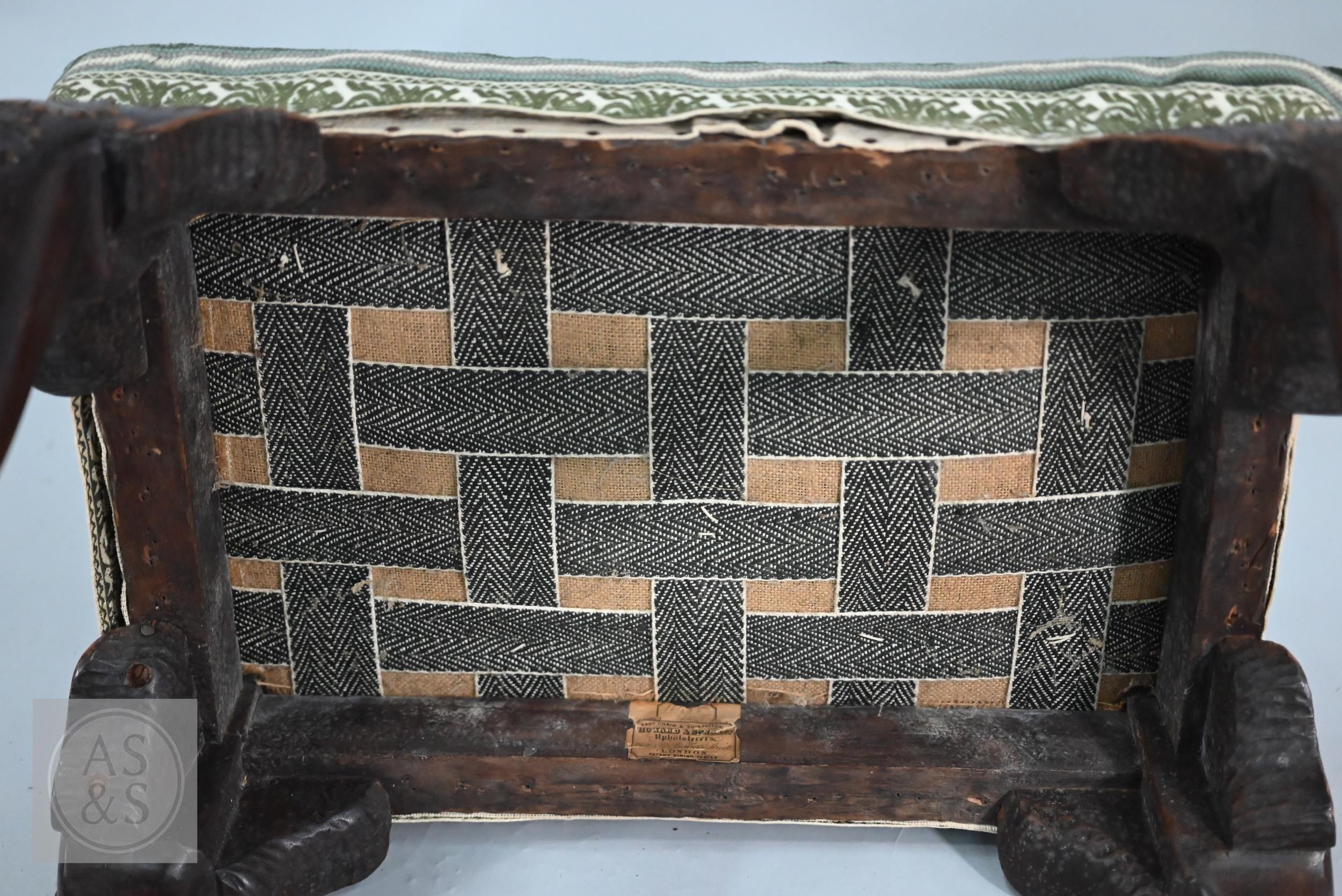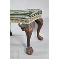 A Victorian carved walnut stool in the Georgian style by Howard & Sons Ltd, the (later covered) overstuffed seat raised on cabriole supports to claw and ball feet, bears original paper makers label to underside, 62 cm x 42 cm x 42 cm h
