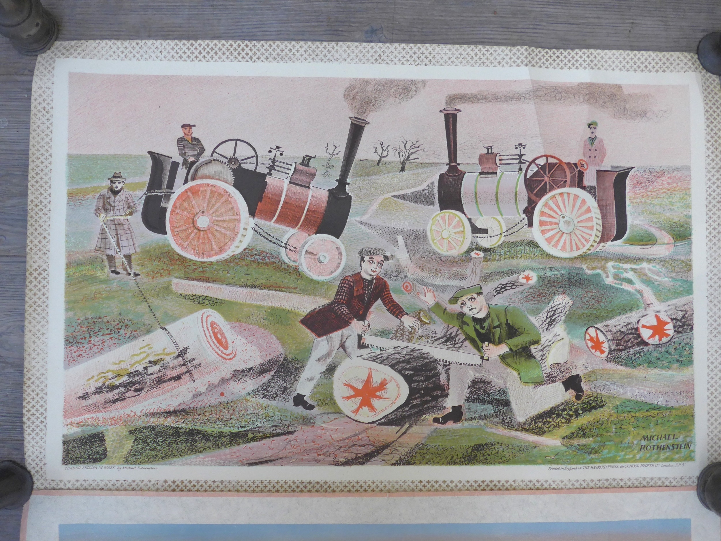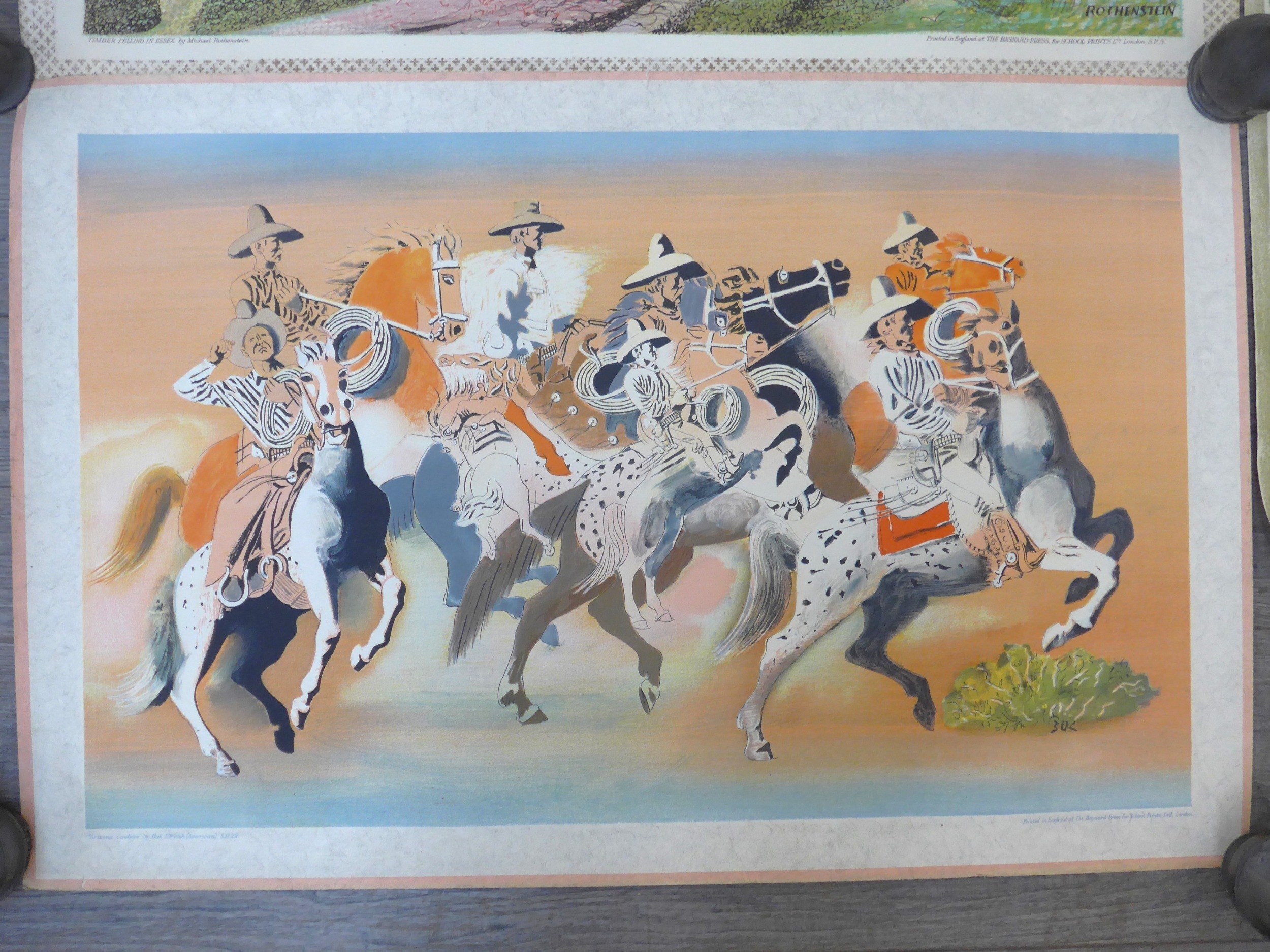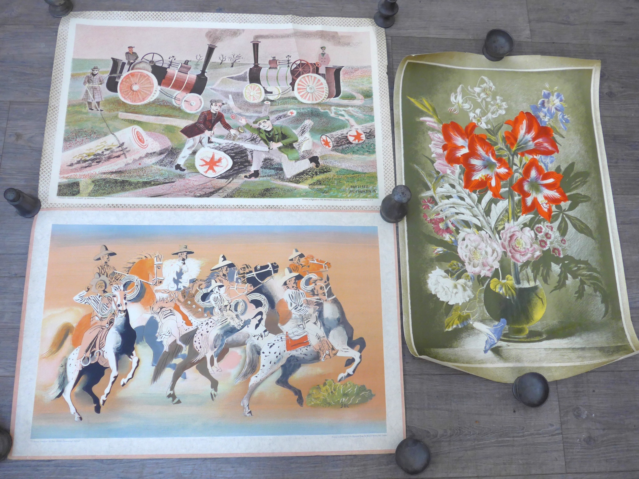 Baynard Press for School Prints Ltd - Three unframed prints including Michael Rothenstein 'Timber Felling In Essex', Gerald Cooper 'Striped Lily' and Buk Ulreich 'Arizona Cowboys'. Each 49.5cm x 76cm, (Splits to edges of each)