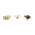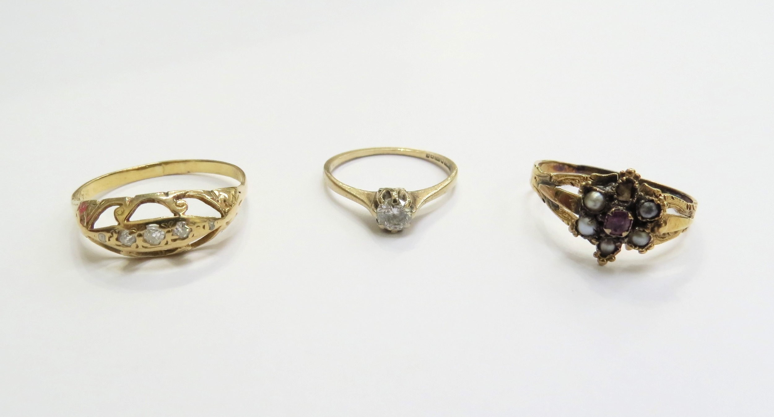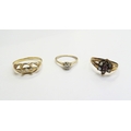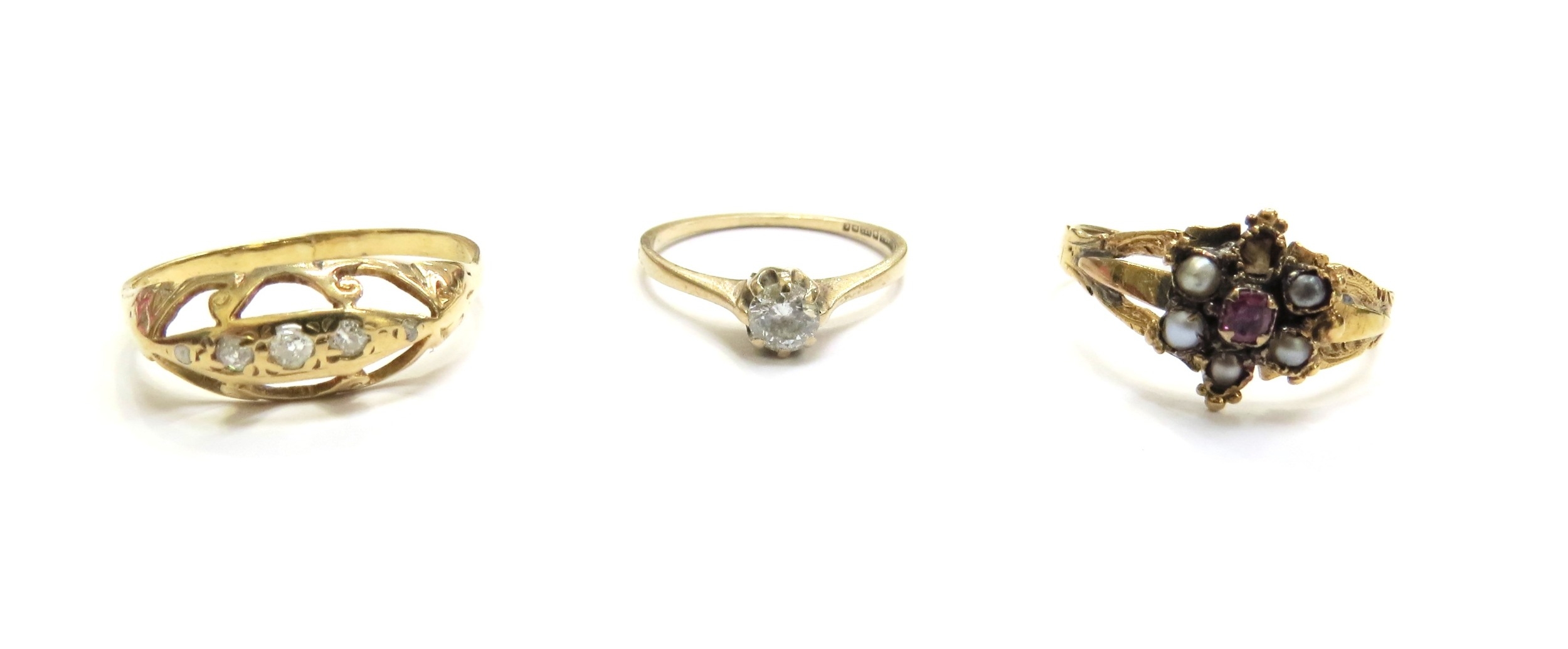 A Victorian diamond set ring, shank unmarked, a Victorian flower form ring, centre ruby framed by seed pearls (one missing) and a 9ct gold ring with white stone, 4.9g total (3)