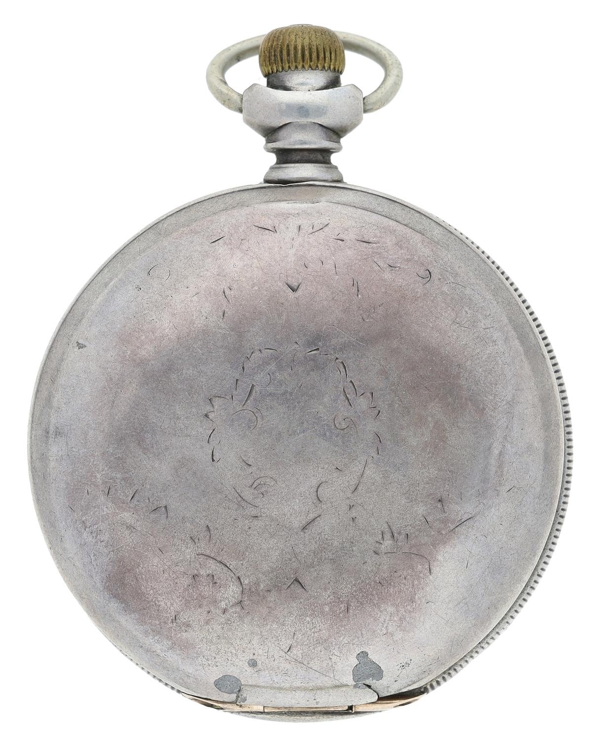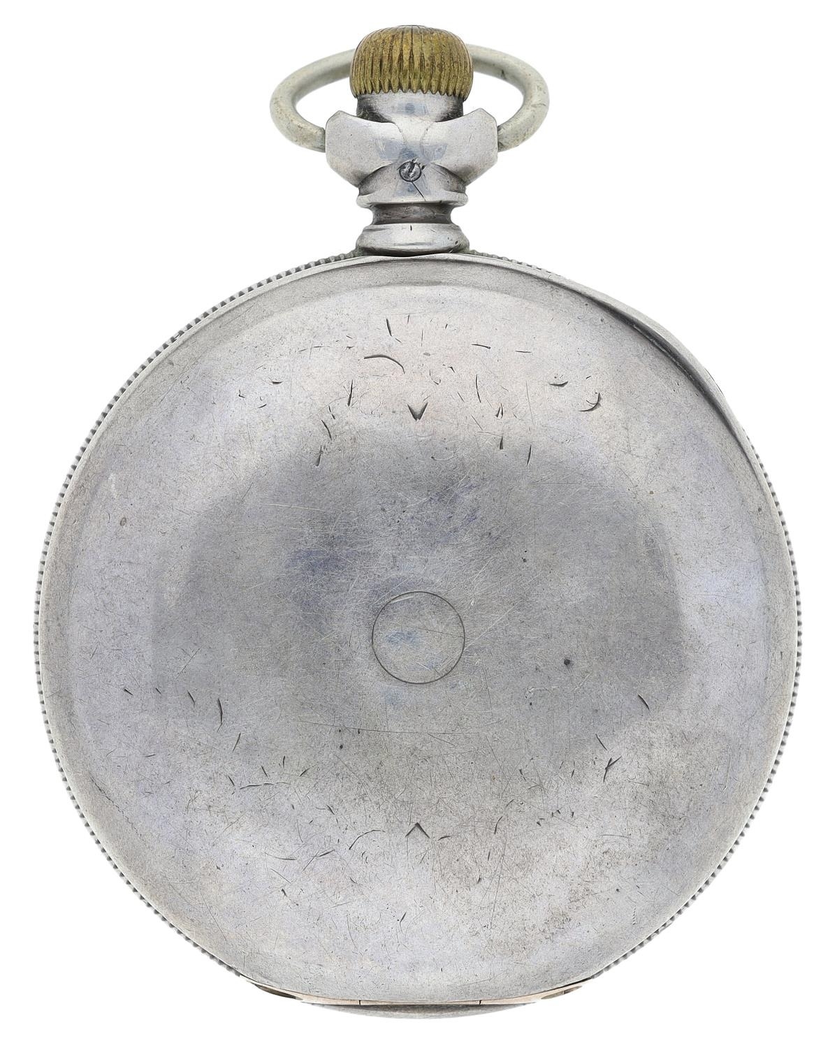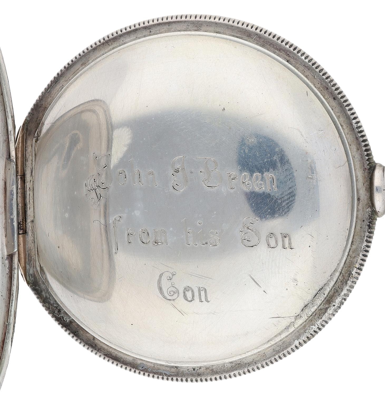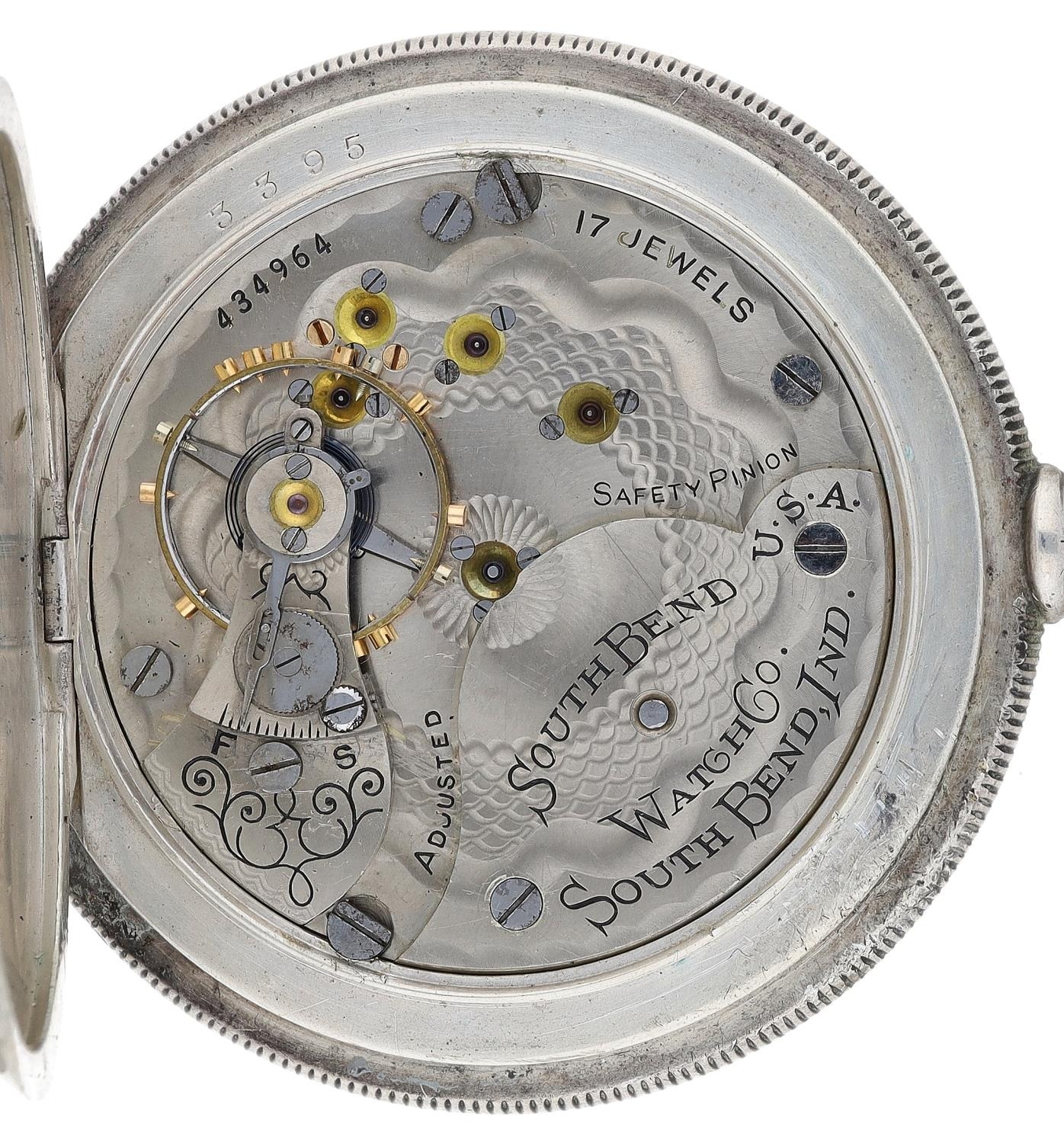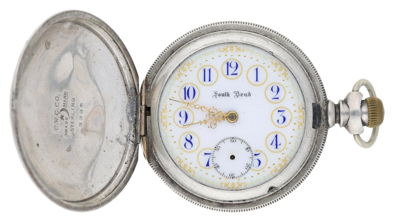 South Bend Watch Co. lever set hunter pocket watch, serial no. 434964, circa 1906, signed 17 jewel adjusted movement with safety pinion, compensated balance and regulator, signed decorated dial with blue Arabic numerals, dot minute markers and subsidiary seconds, Louis style hands, within an engraved C.W.C.Co. Sterling case with applied gold hinges, 176gm, 58mm (with faults)