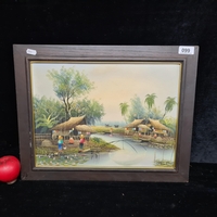 An interesting Vietnamese Mother of pearl inlaid painting. Features traditional Vietnamese scene and temple. Beautiful lustre of mother of pearl.