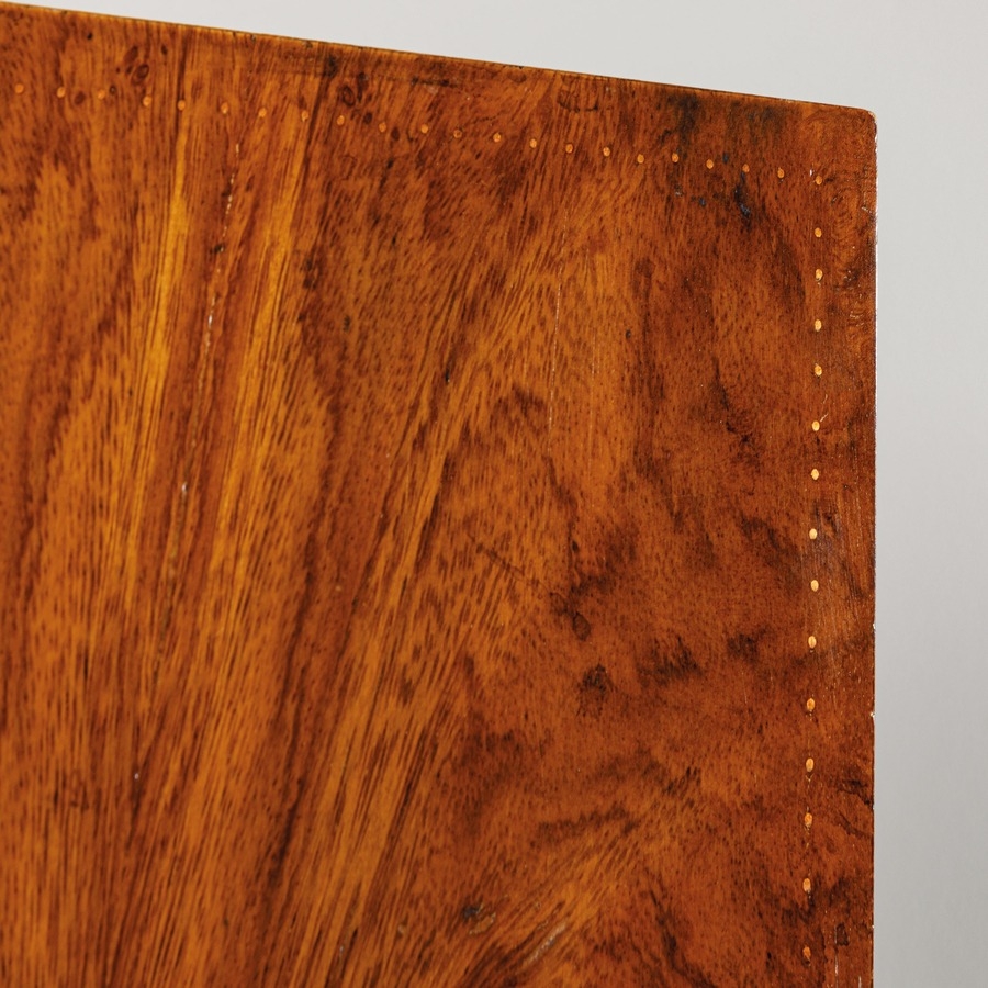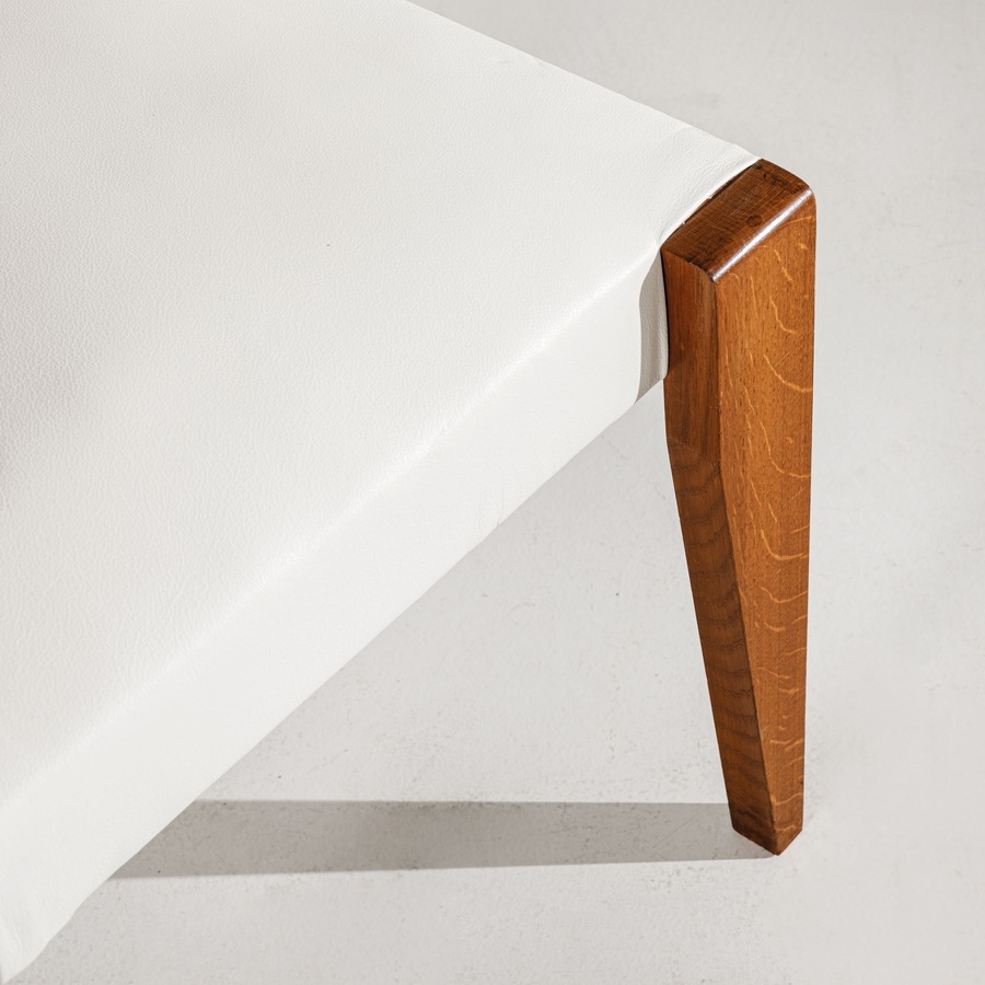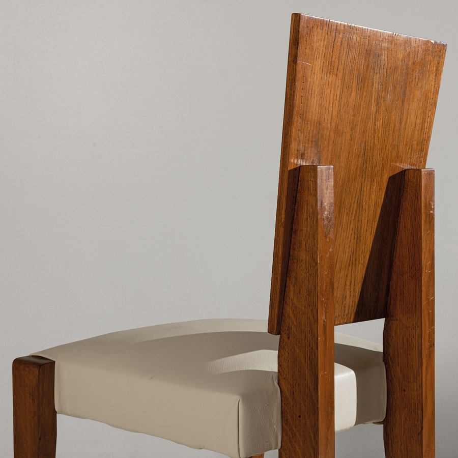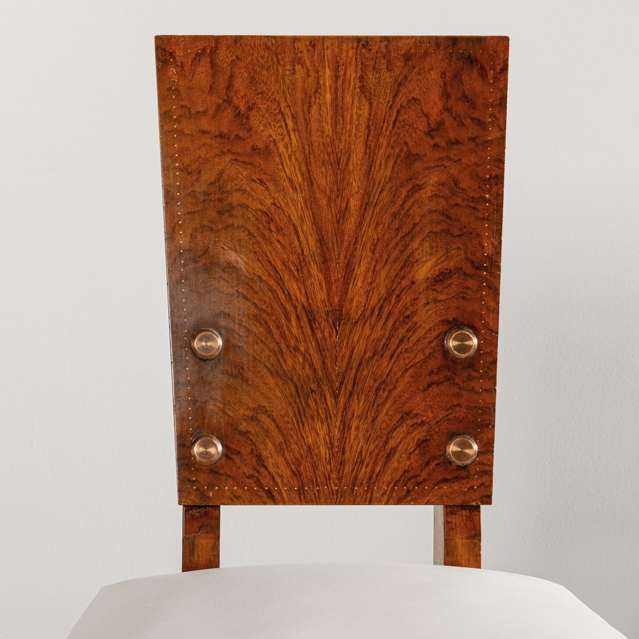 Sei sedie. Legno di rovere, radica, pelle imbottita, rame, ottone. Francia, anni '40.