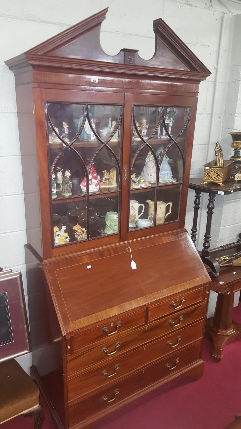 A Mahogany and inlaid bureau bookcase, the upper part with an architectural broken pediment with dentil ornament centred by a carved rosette, fitted with adjustable shelves enclosed by astragal glazed panel doors, the lower part having a crossbanded sloping hinged fall enclosing a fitted interior with small drawers and pigeon holes, above a central enclosed cupboard with concealed compartments behind, containing two short and three long drawers below. 3' wide x 7 3/4' high.
