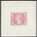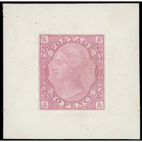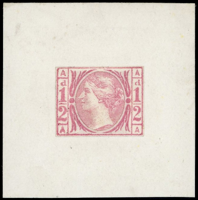 1879 Tender Essay. Very fine paste-up essay in pink for a ½d design lettered AA, produced using the portrait cut from an existing stamp with only the border being a new design. Both pieces mounted on a piece of stout white card (41x42mm). Believed to have been submitted by McCorquodale.