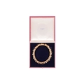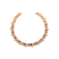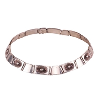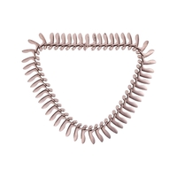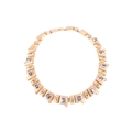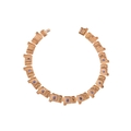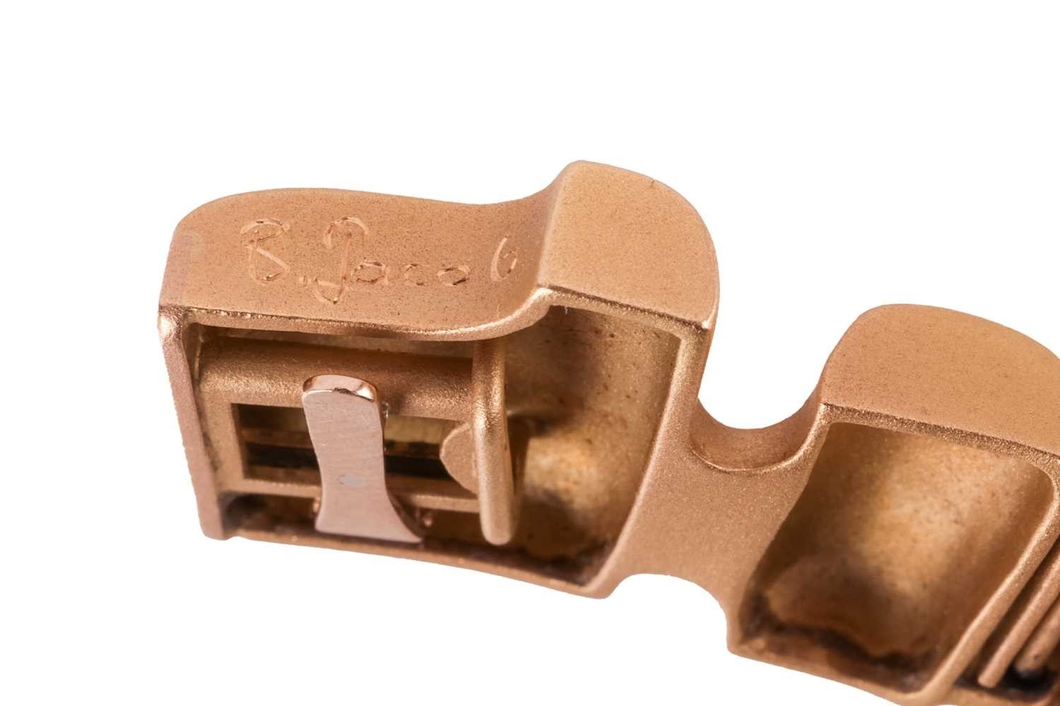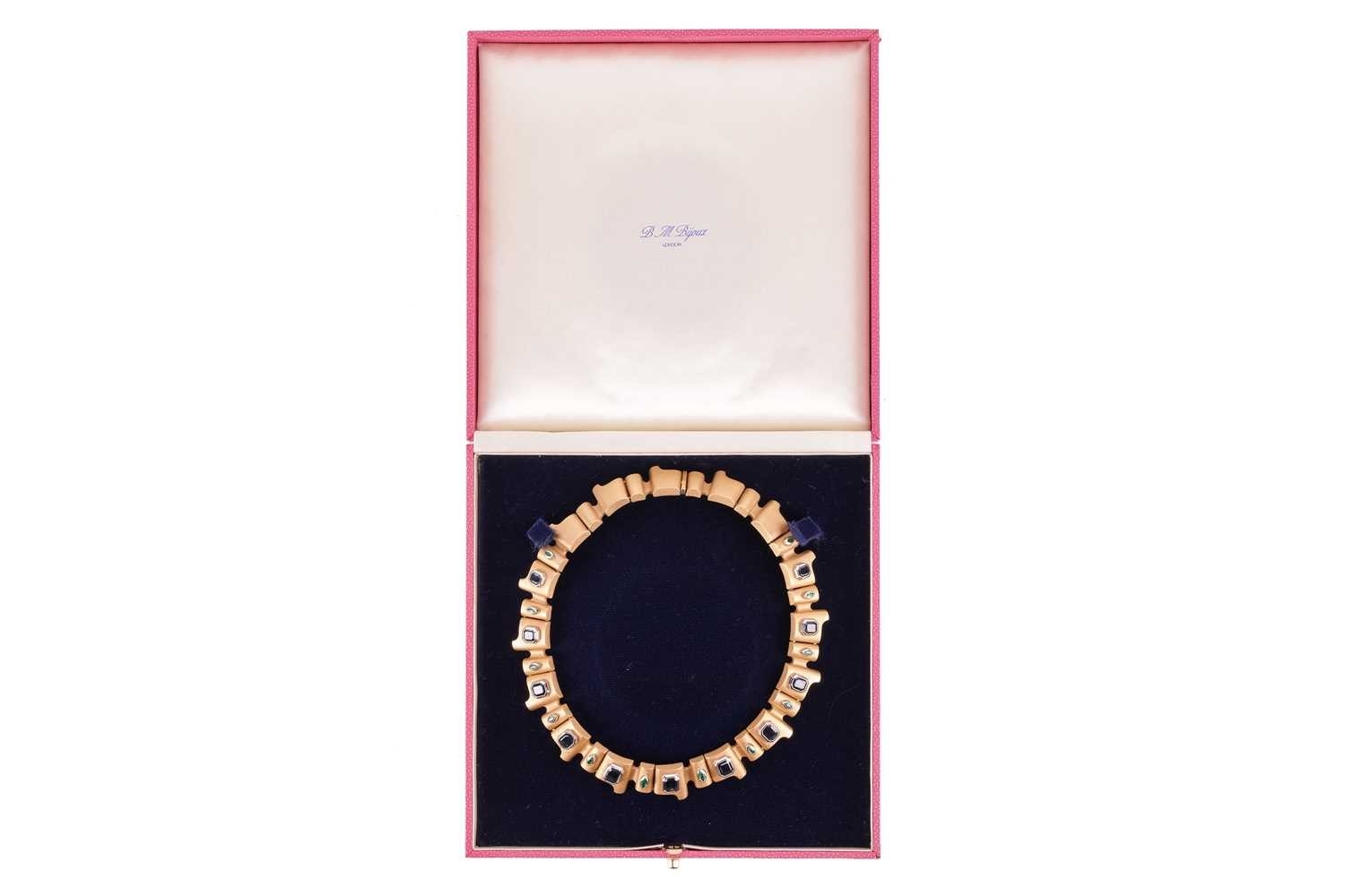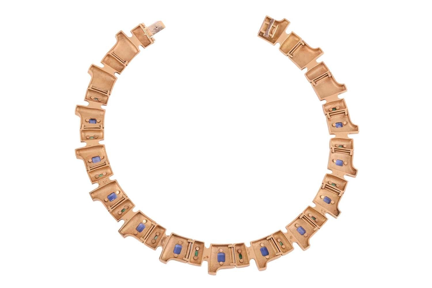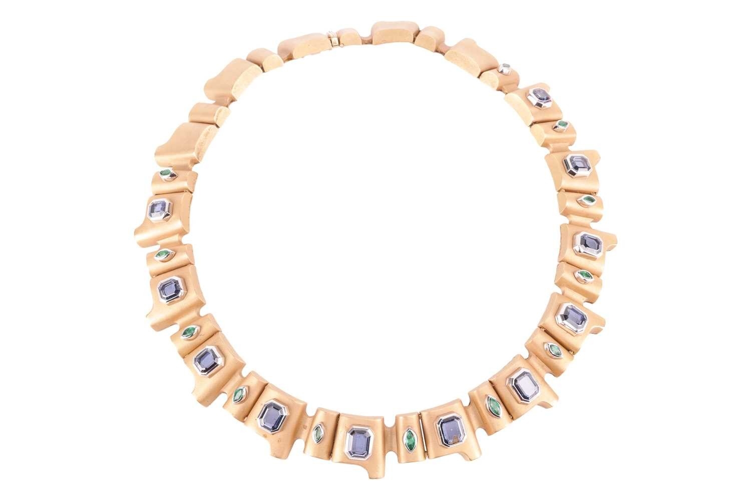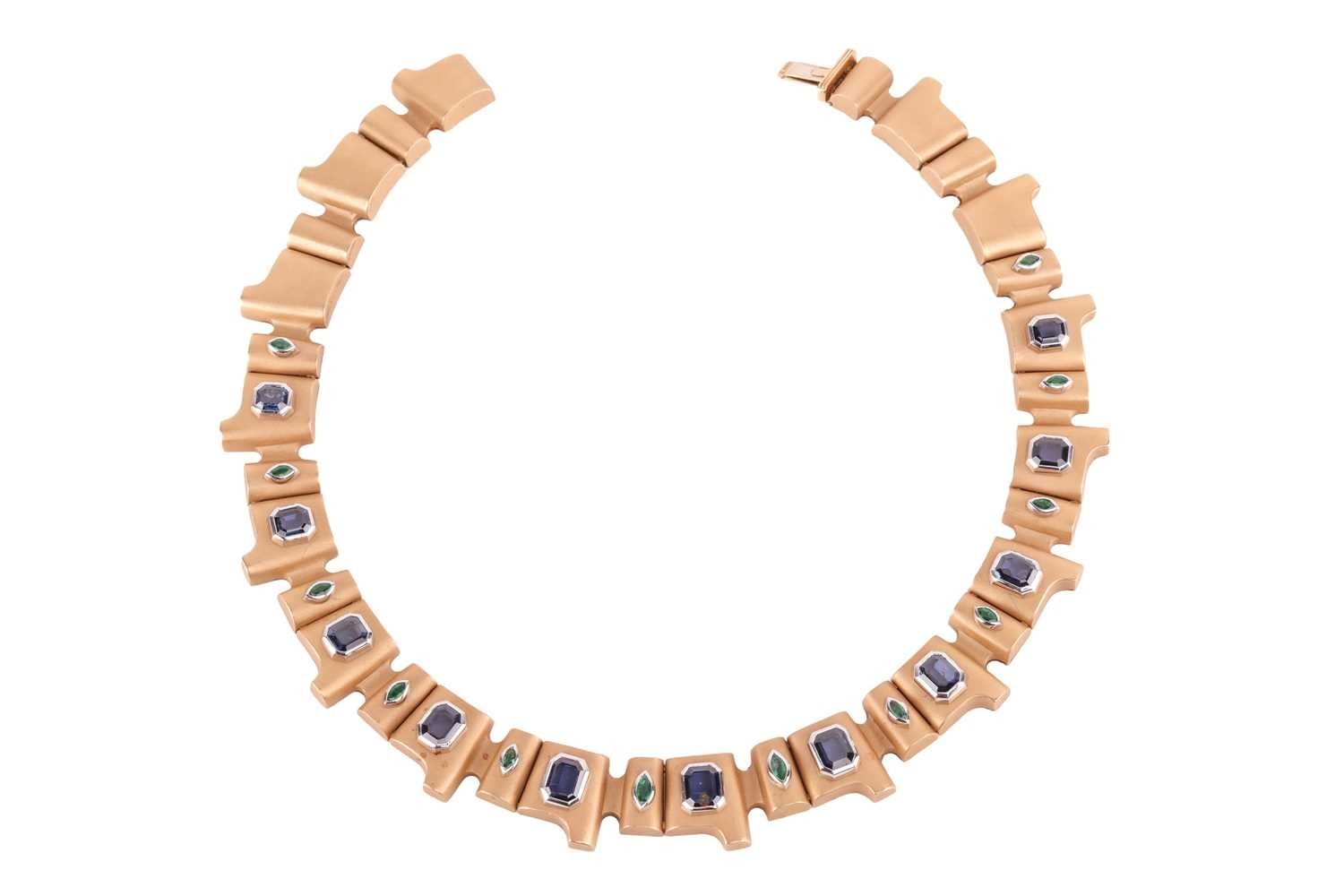 A geometric gem-set collar necklace in 18ct yellow gold; comprising a series of hinged abstract geometric links in sandblasted finish, collet-set with octagonal portrait-cut sapphires alternating with navette-cut emeralds, completed with an integral tongue clasp, signed 'B. Jacot' for Bernadine Jacot, London assay marks, overall length 40.0 cm, in a B M Bijoux case, 198.8 grams.