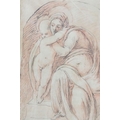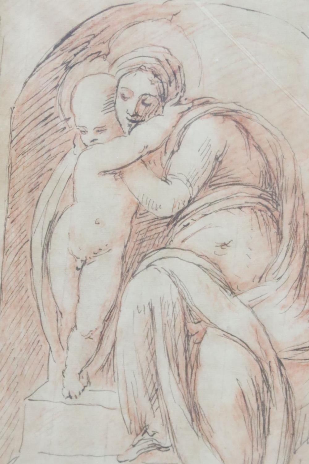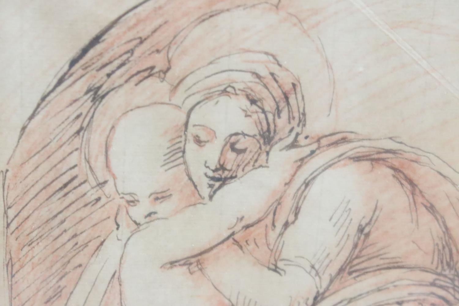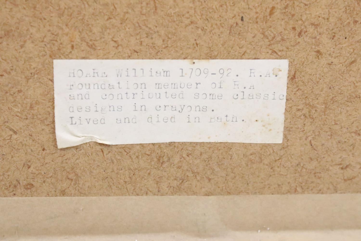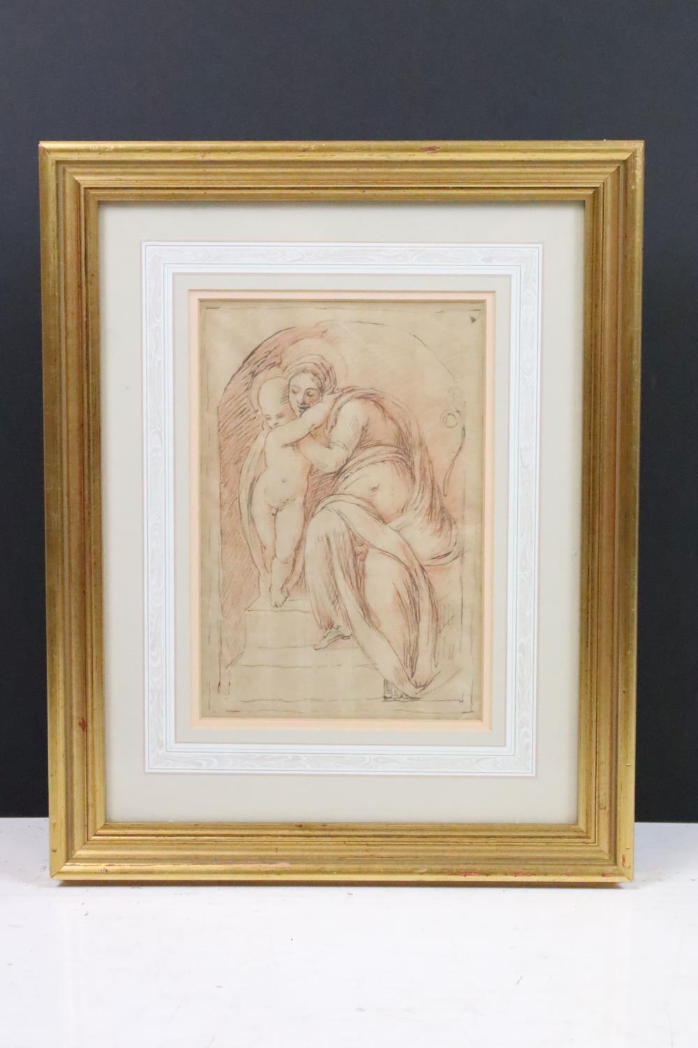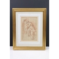 English School, mother and child, pen and crayon, indistinctly inscribed lower right, 25 x 27cm, gilt framed, label verso ' Hoare William 1709 - 92. R.A. Foundation member of R.A. and contributed some classic designs in crayons. Lived and died in Bath. '