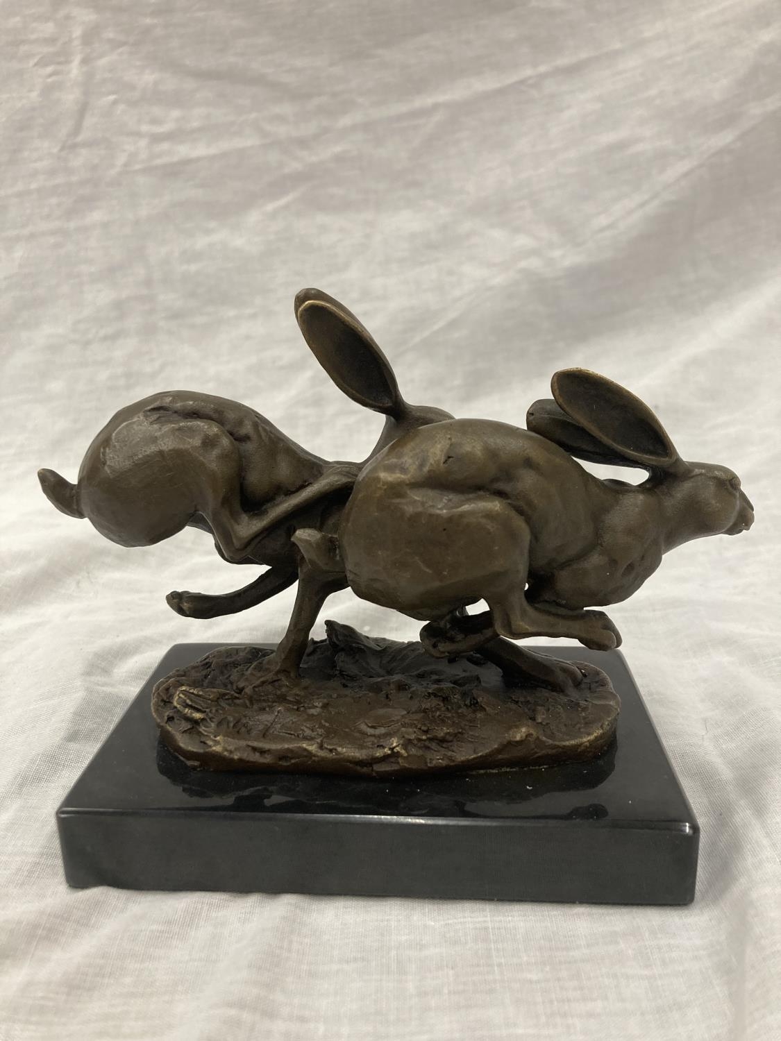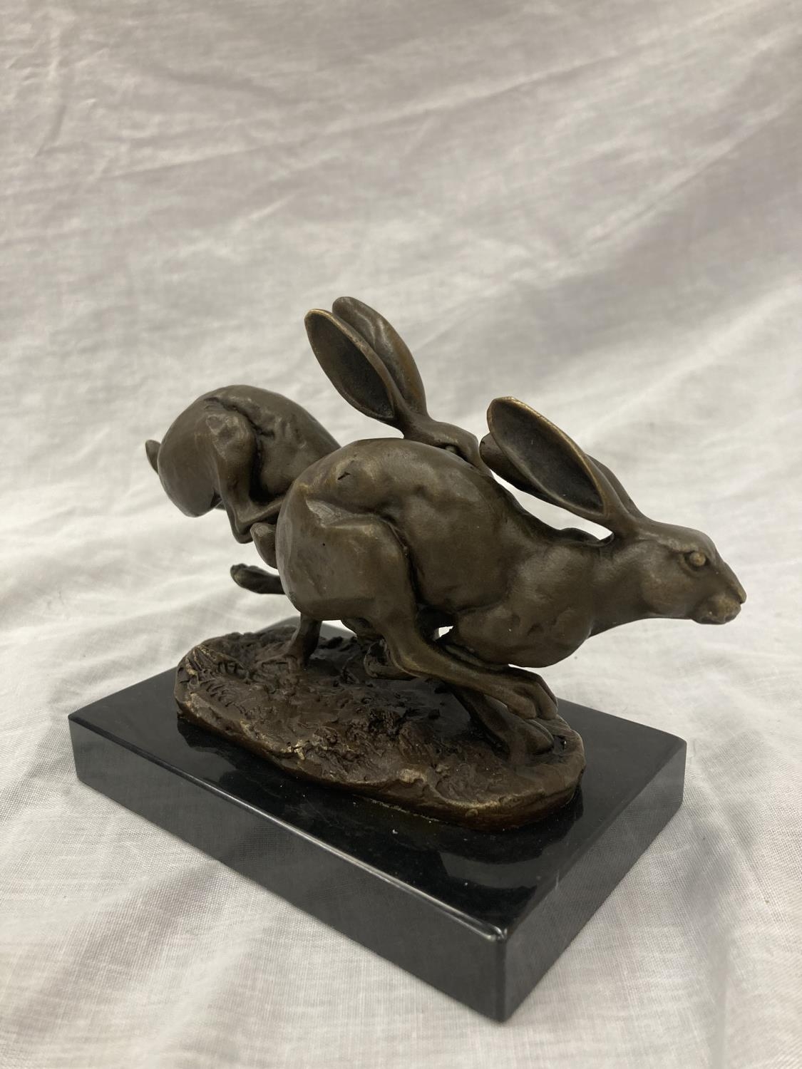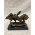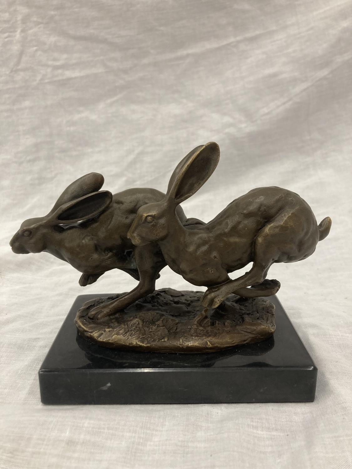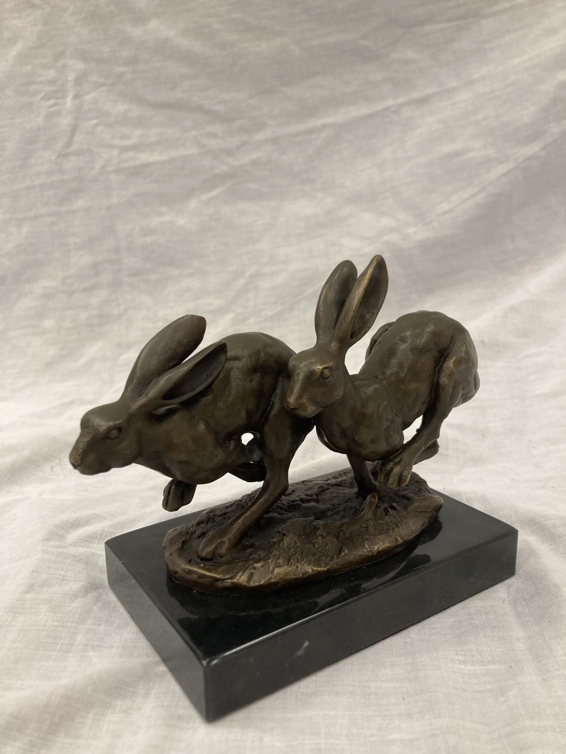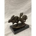 A SIGNED BRONZE OF HARES RUNNING ON A MARBLE PLINTH HEIGHT 12CM, LENGTH 15CM