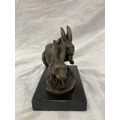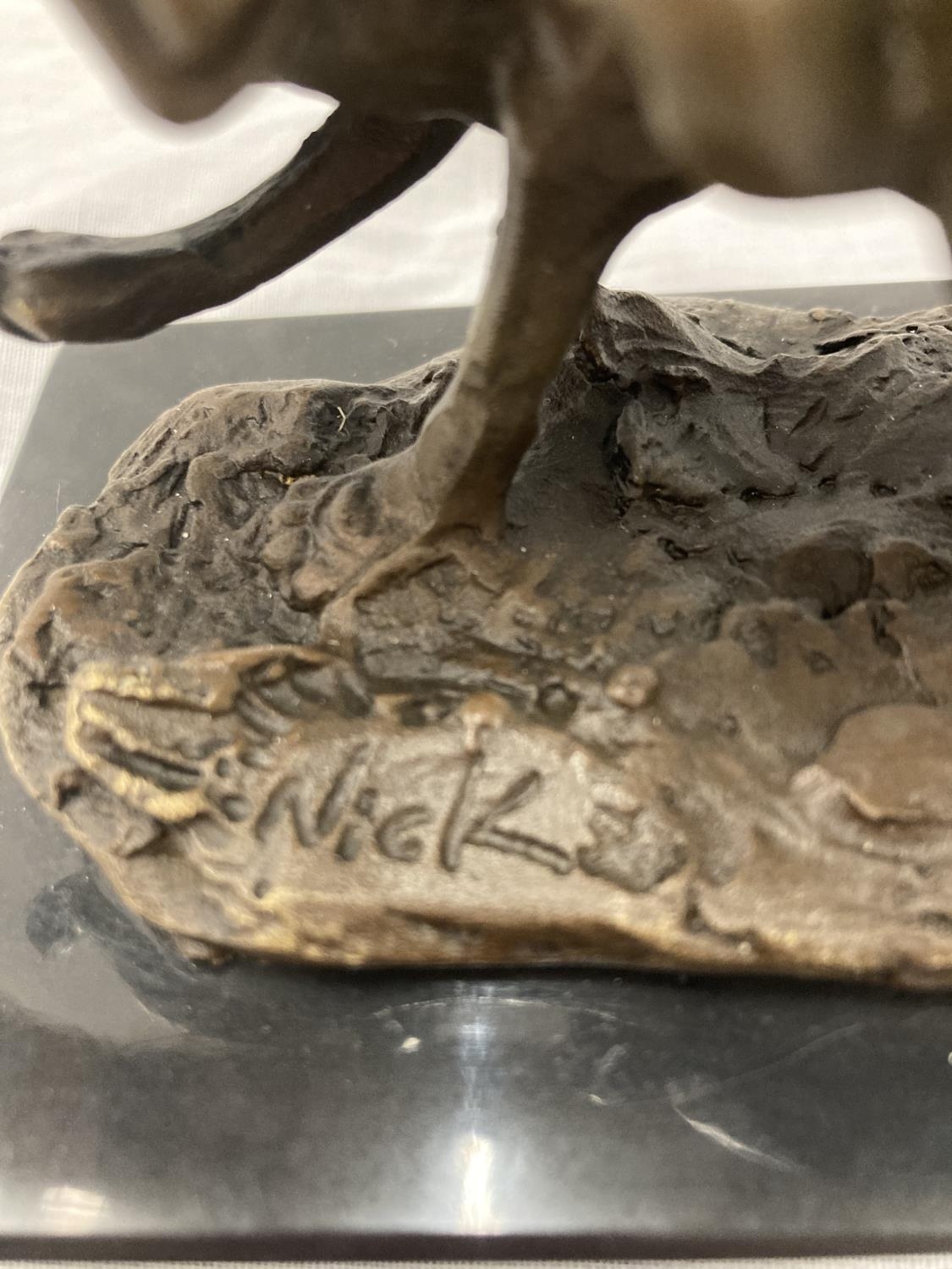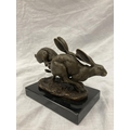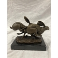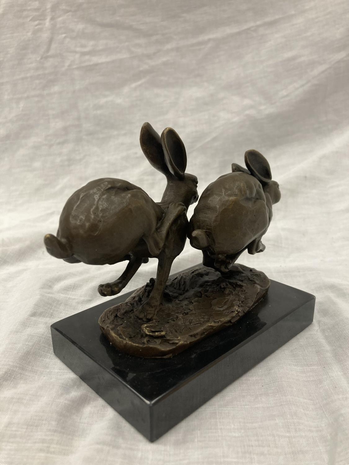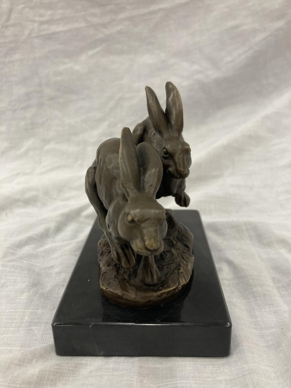 A SIGNED BRONZE OF HARES RUNNING ON A MARBLE PLINTH HEIGHT 12CM, LENGTH 15CM