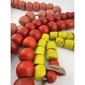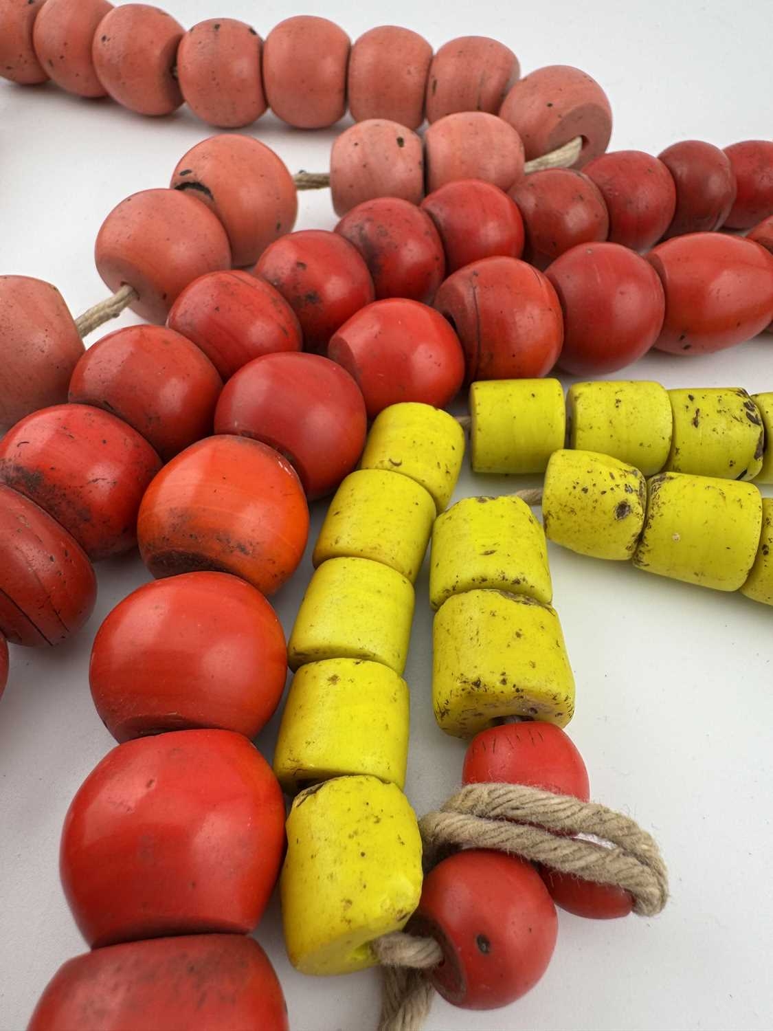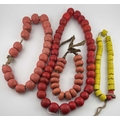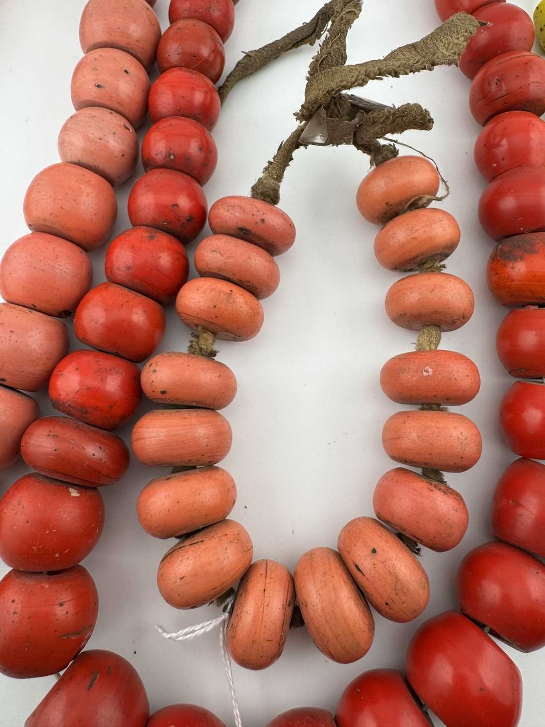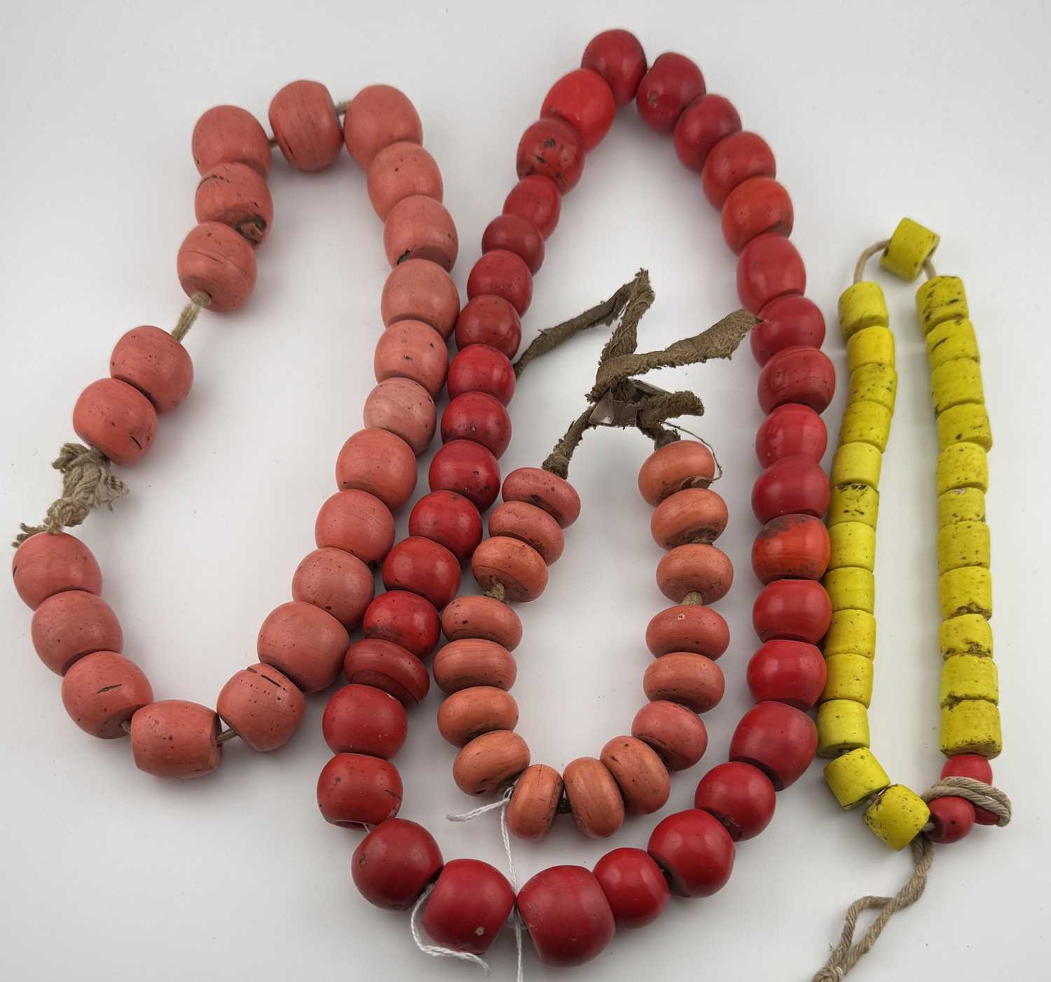 Nepalese jewellery, three heavy bead necklaces and a bracelet, glass beads on string and fabric ribbon, early-mid 20th century, Tamang people, Nepal longest 34cm (4)