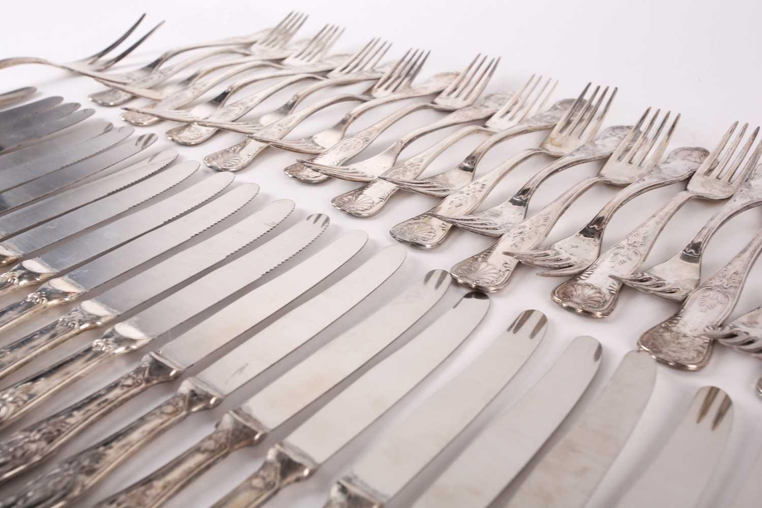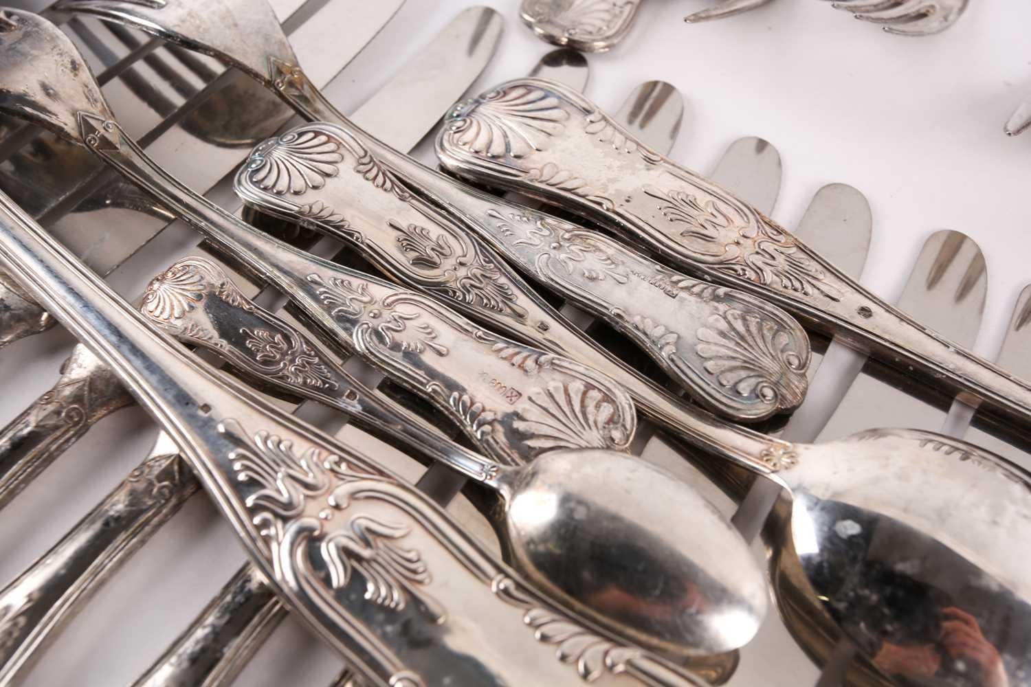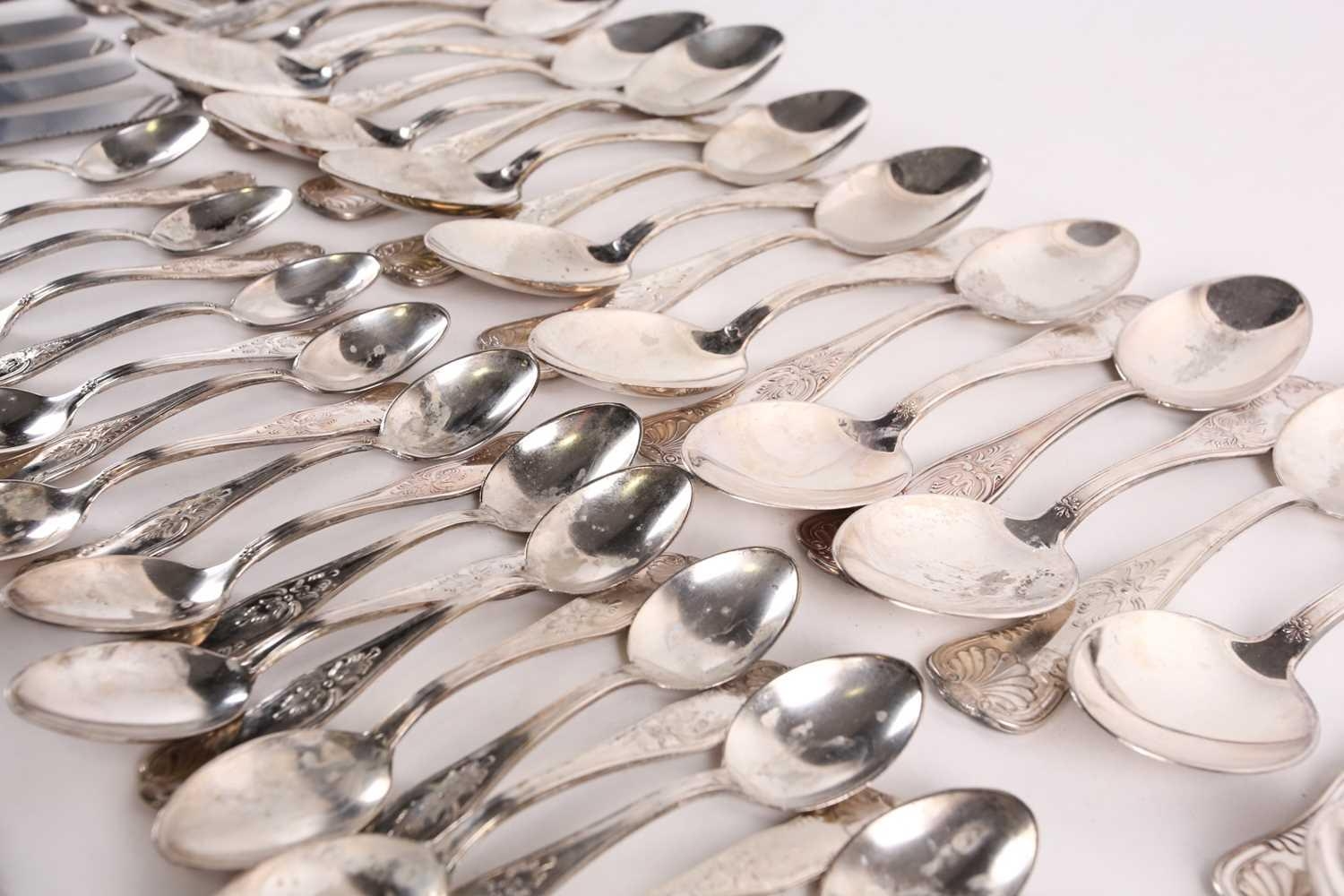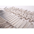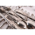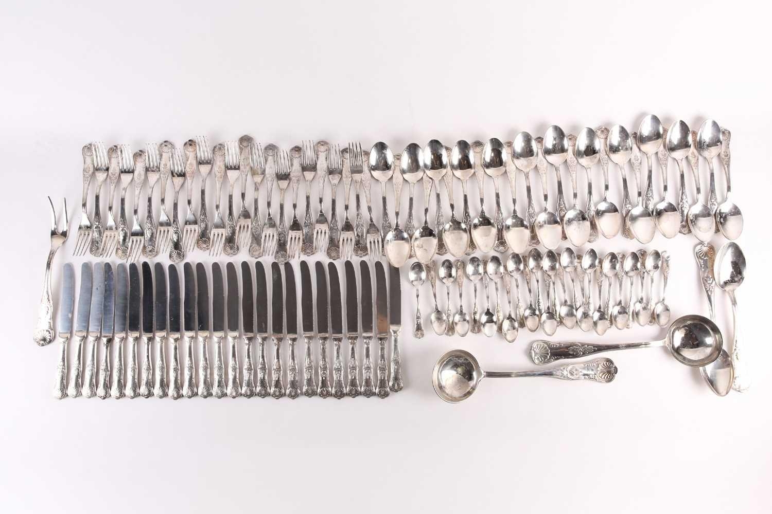 A matched suite of Continental Kings Pattern silver flatware, largely 800 standard, comprising two ladles, tablespoons, table forks, table knives, dessert eaters and others, 122 ozt. of weighable silver.