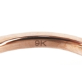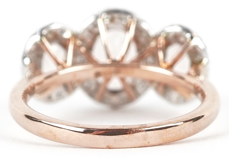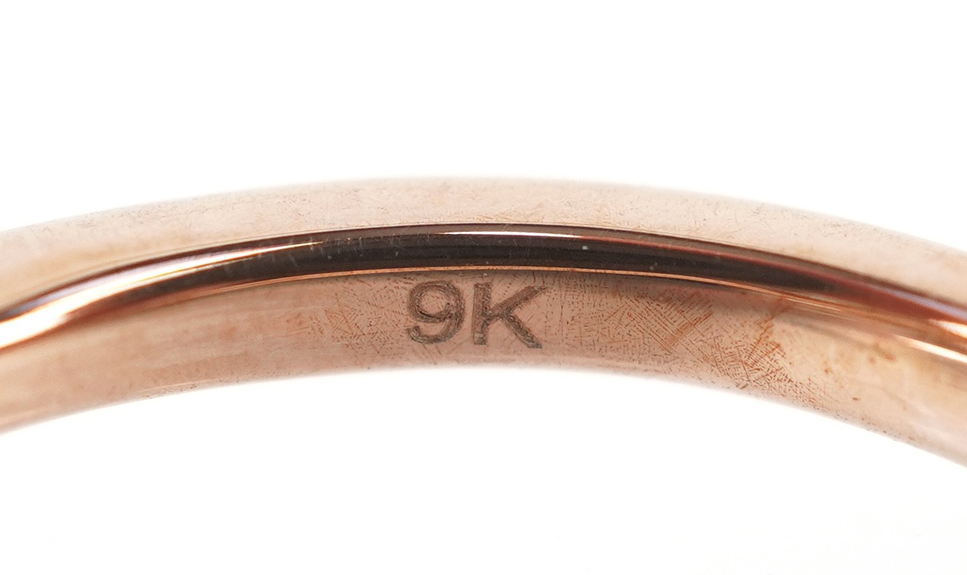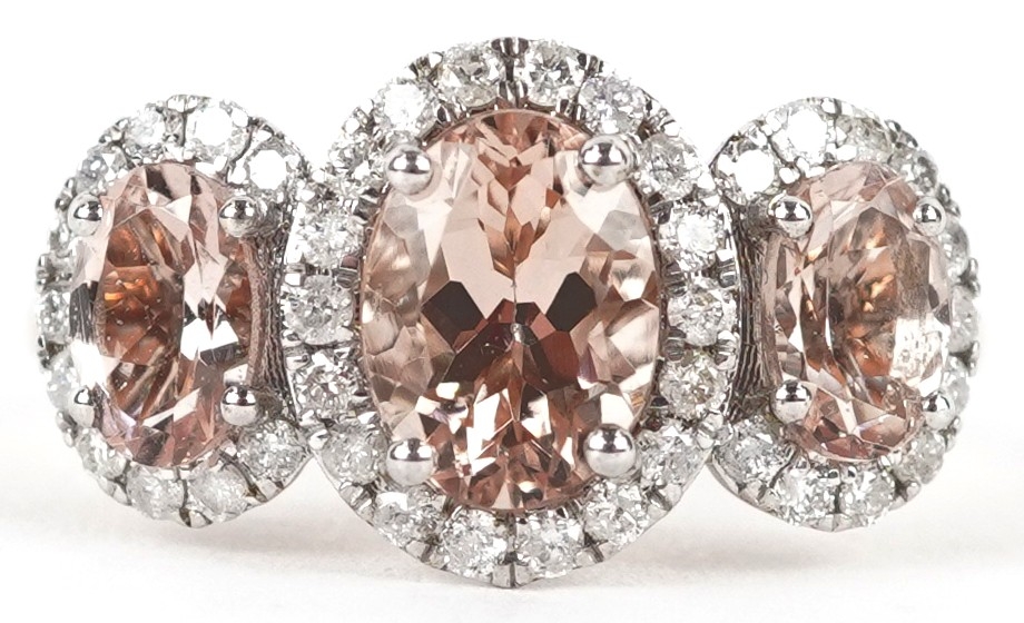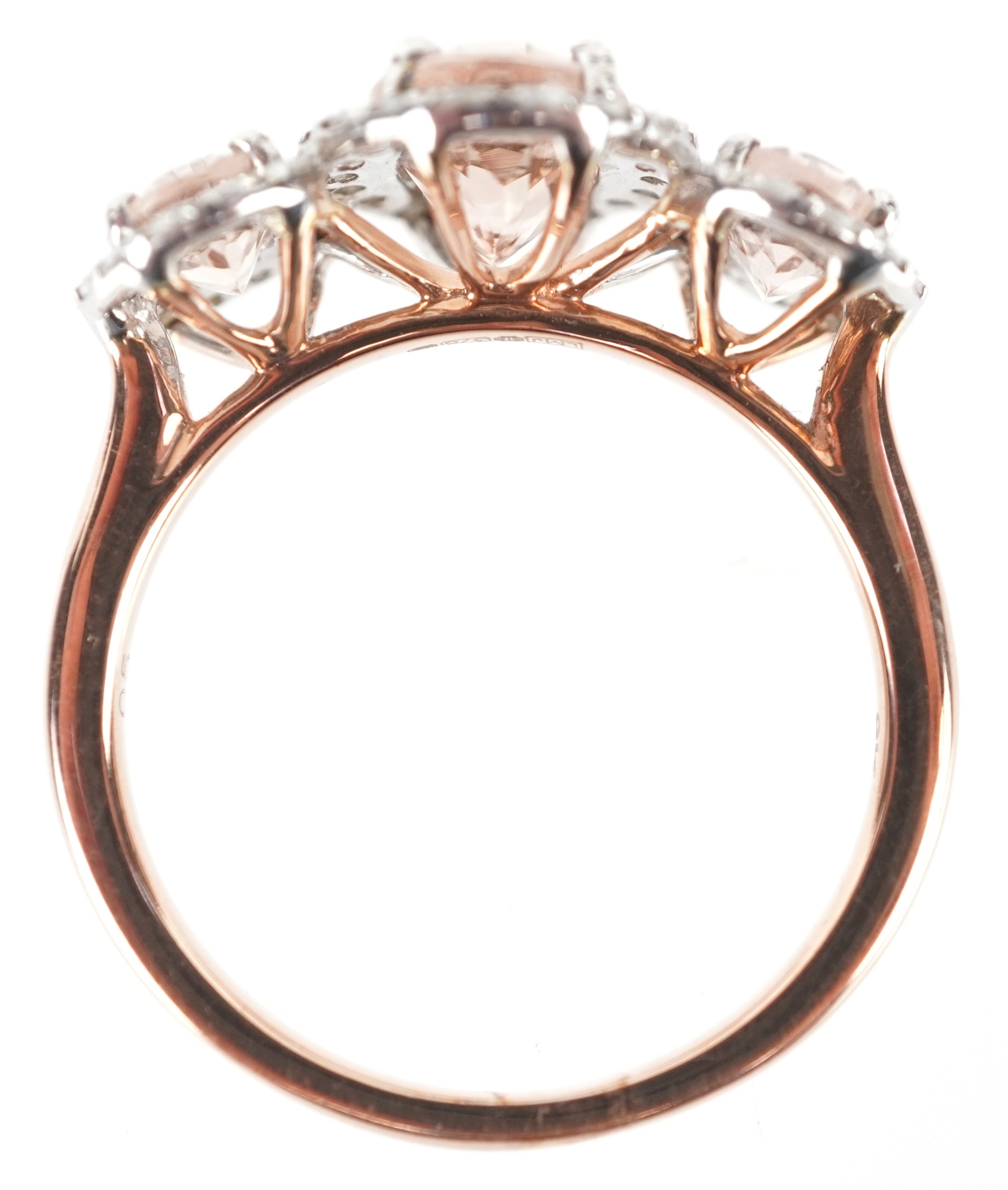 A 9K rose gold morganite and diamond trilogy ring, total diamond weight 0.44 carat, total morganite weight 2.15 carat, size M/N, 3.5g.