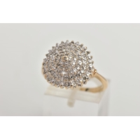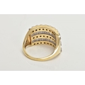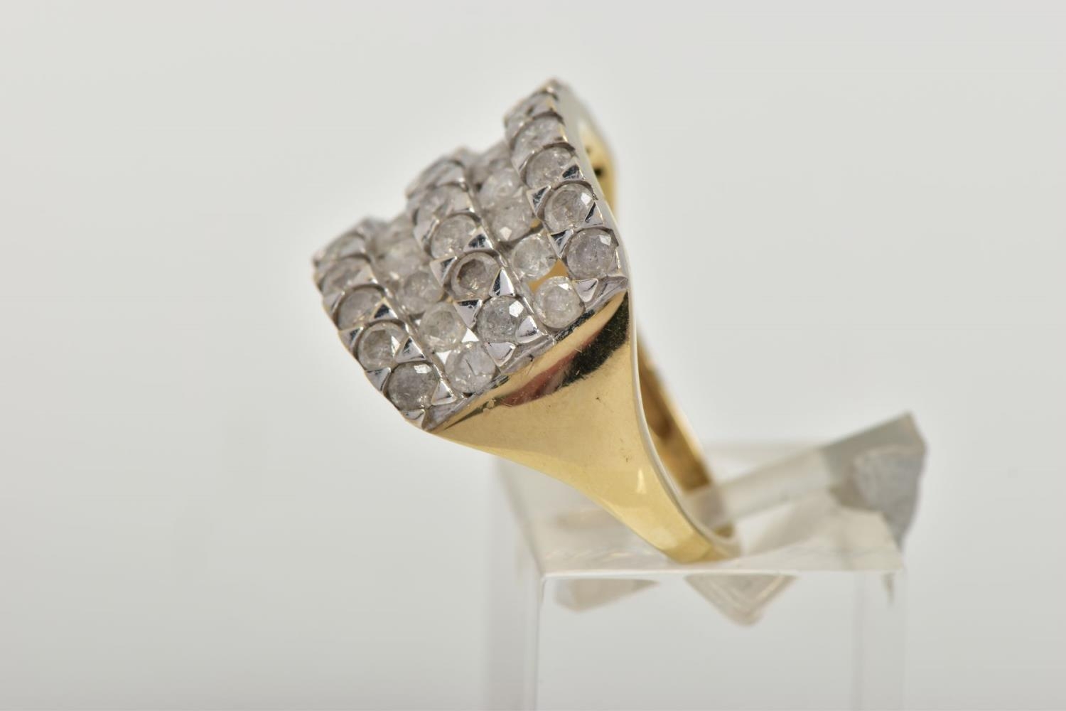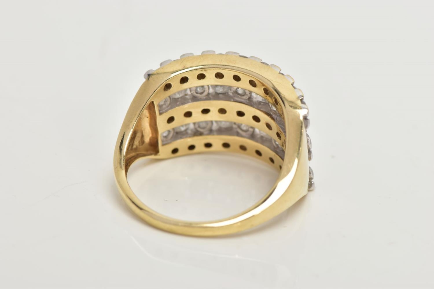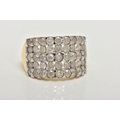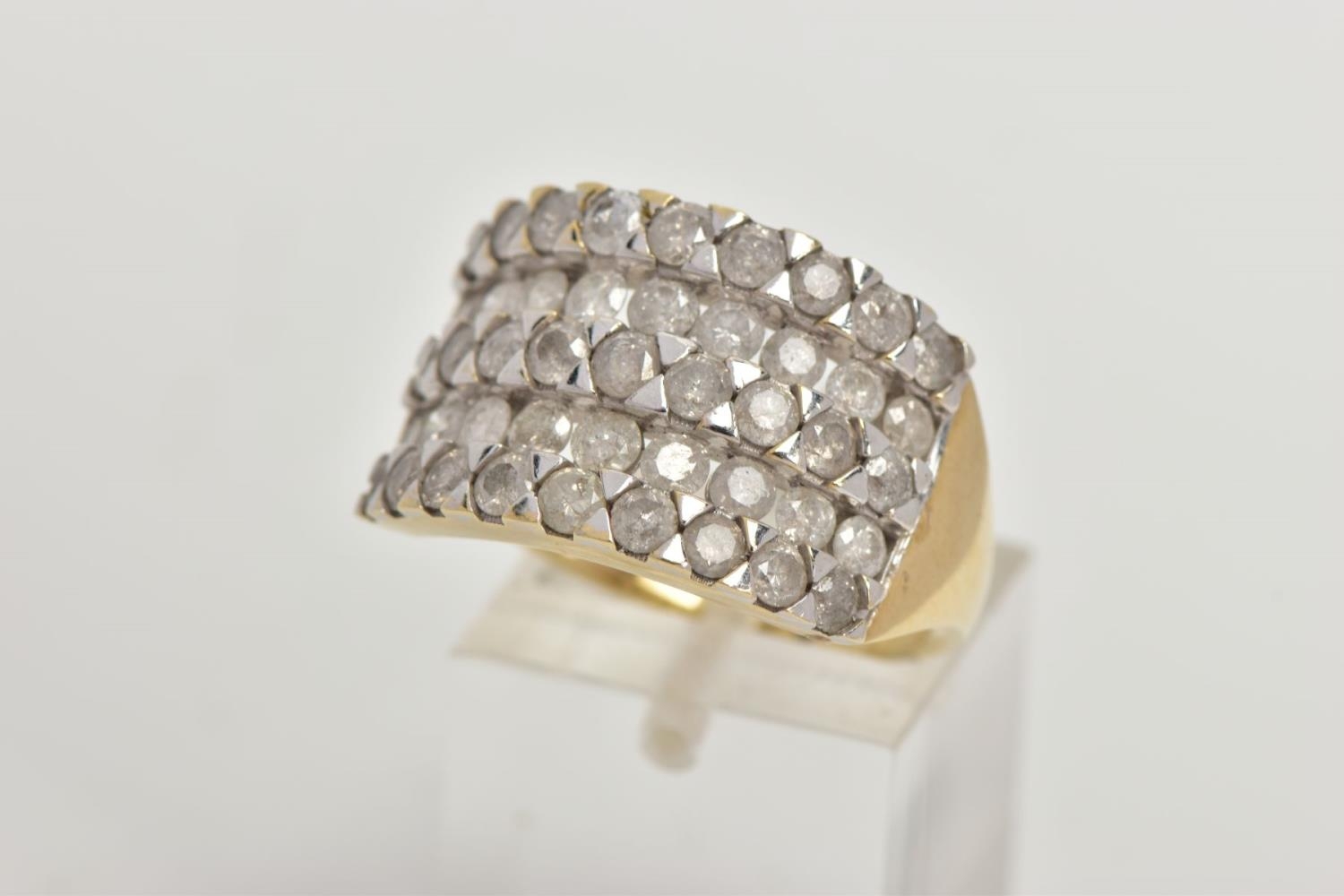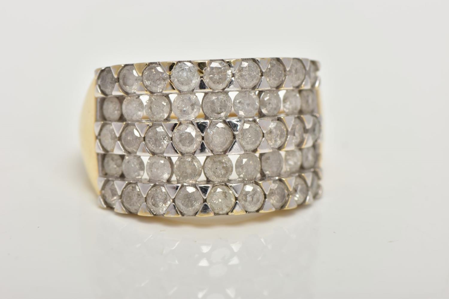 A 9CT GOLD FIVE ROW DIAMOND RING, forty five round brilliant cut diamonds prong set in white gold, estimated total diamond weight 2.25ct, assessed as I3 clarity, leading onto a tapered polished yellow gold band, approximate width 14mm, hallmarked 9ct Birmingham 2020, ring size R 1/2 centre, approximate gross weight 7.8 grams (condition report: general light wear, all stones currently intact, overall condition good)