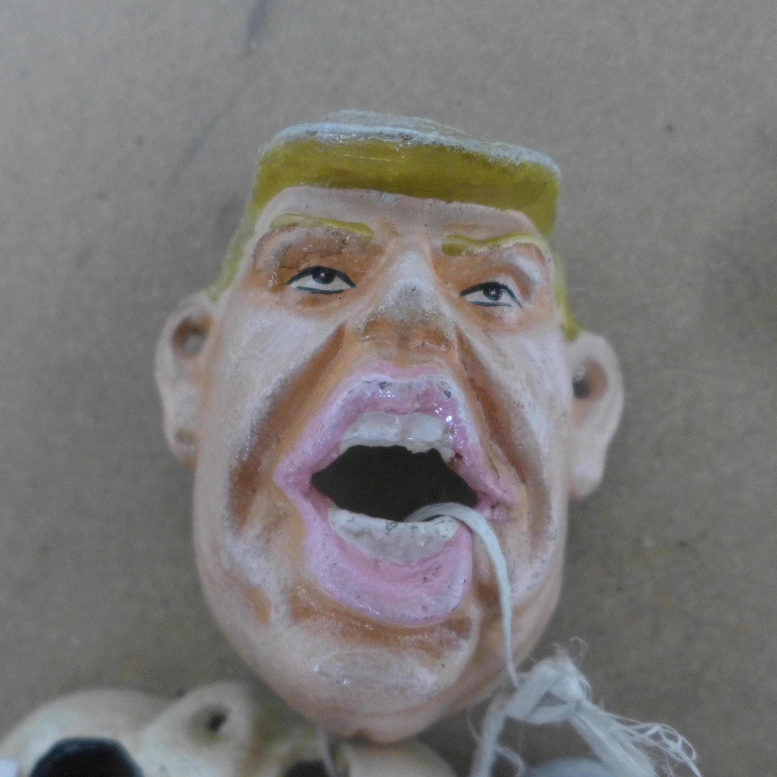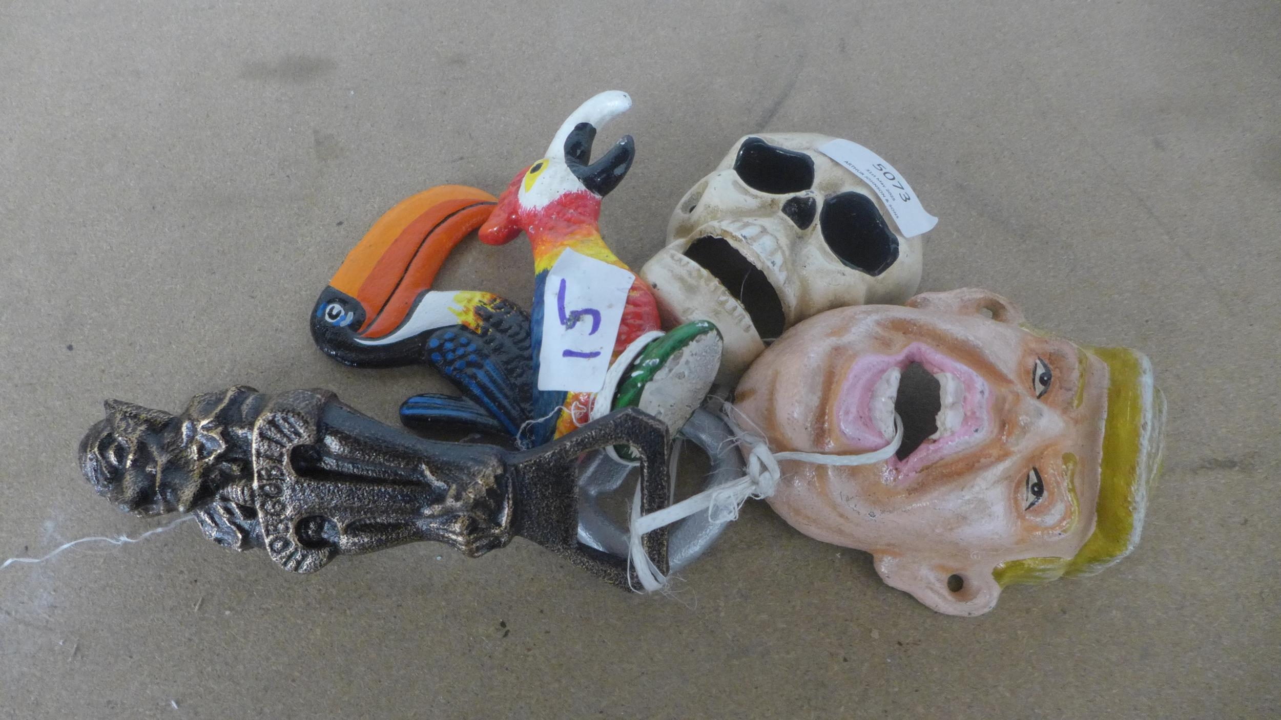 5 cast metal bottle top openers including Trump, skeleton, toucan, parrot and hob goblin *This lot is subject to VAT