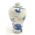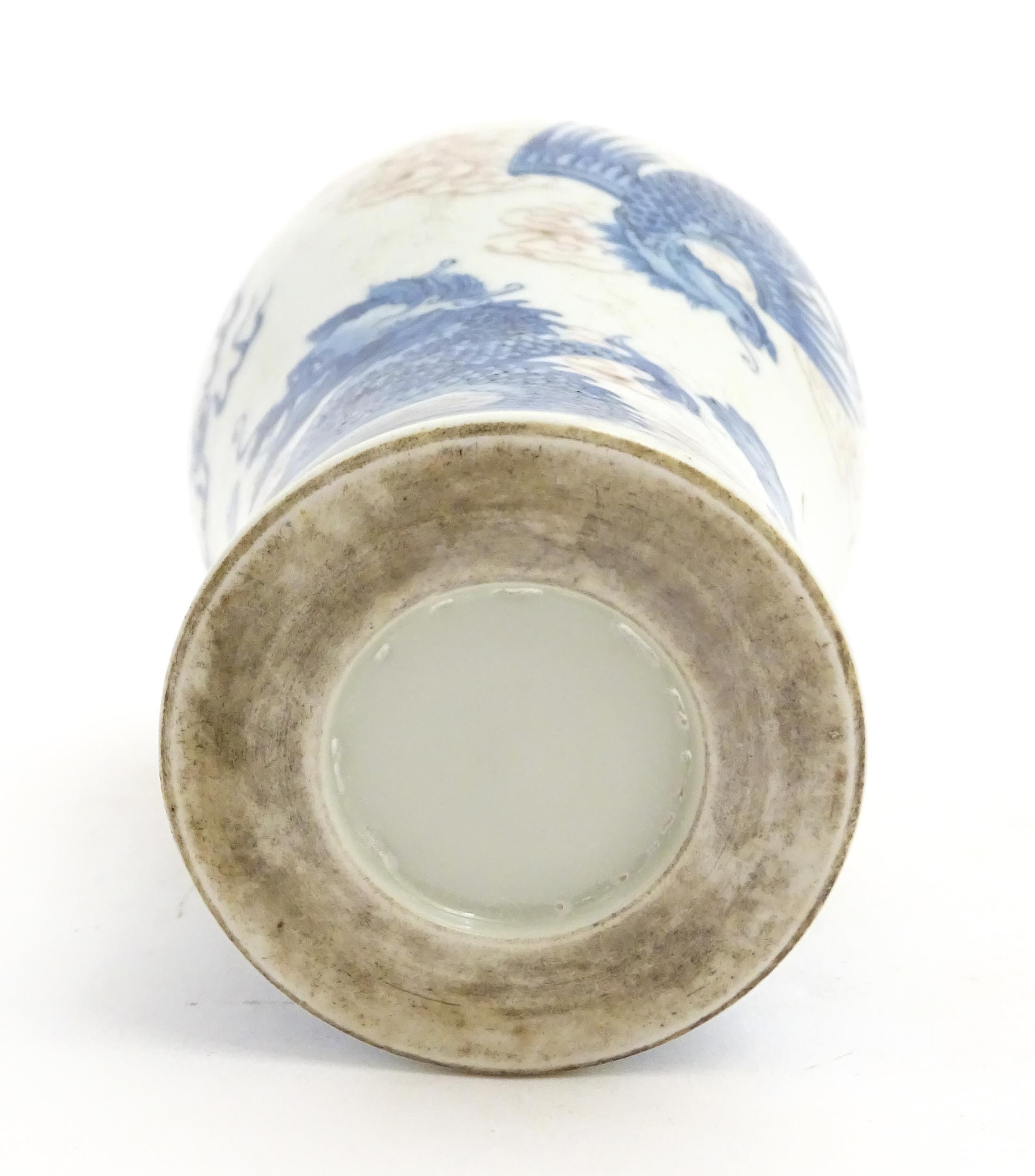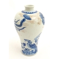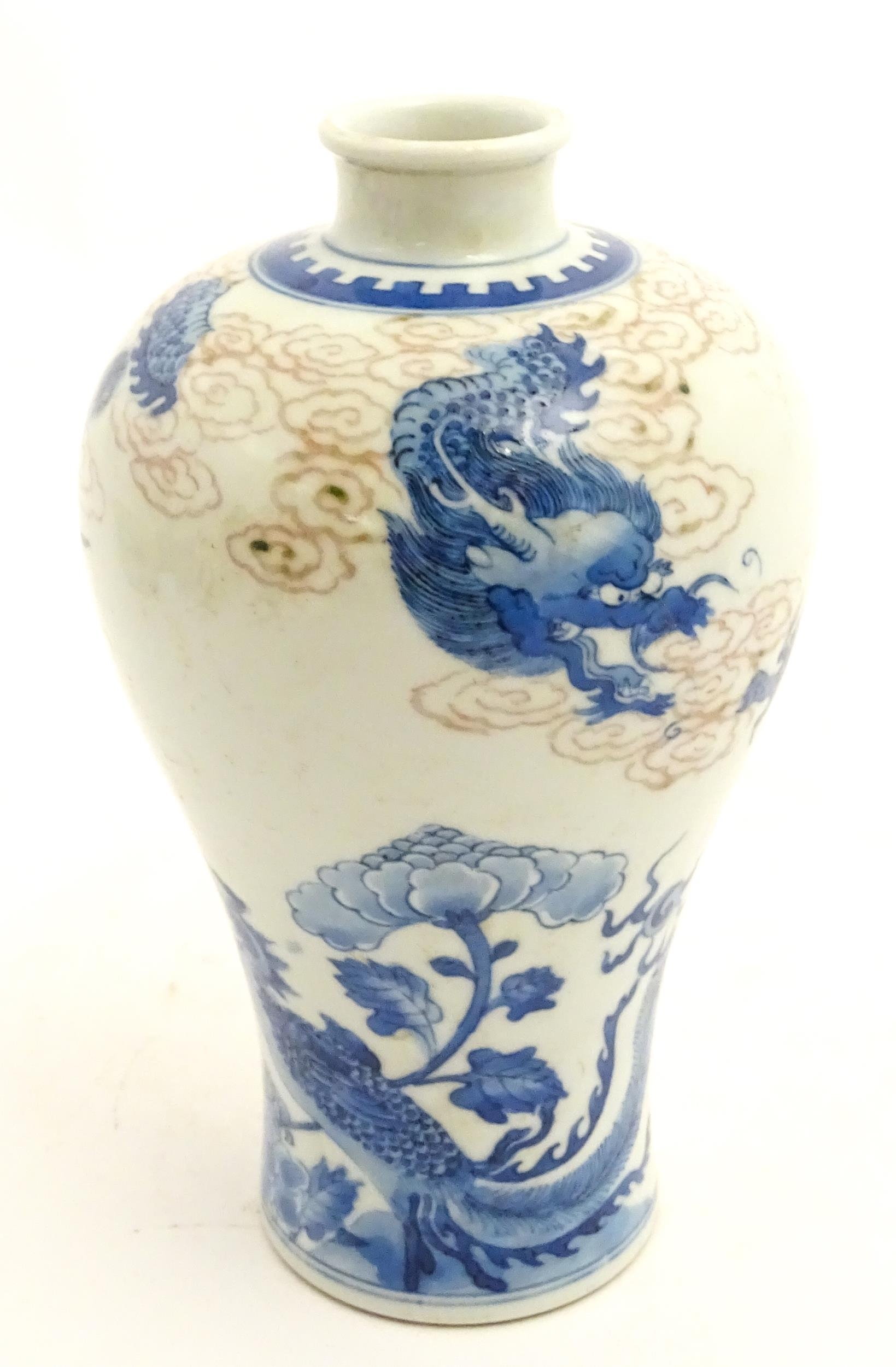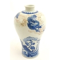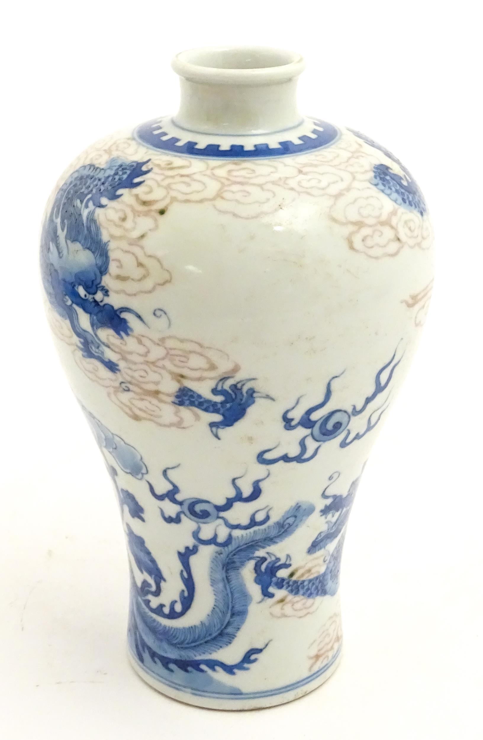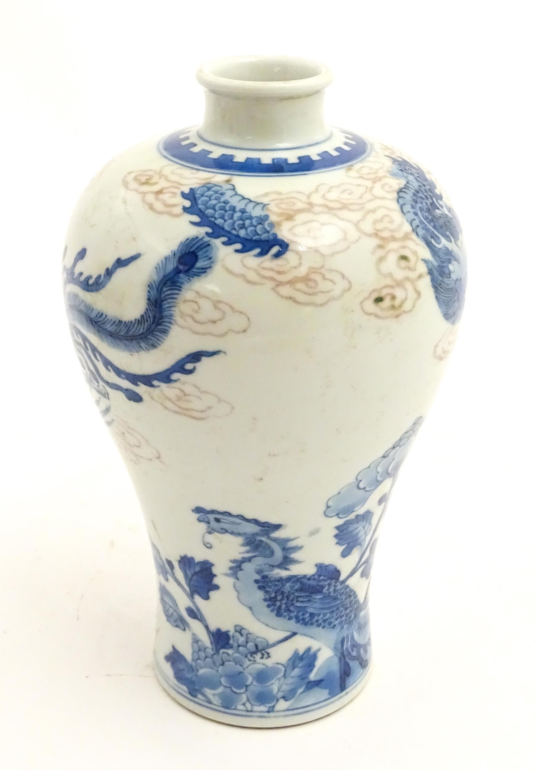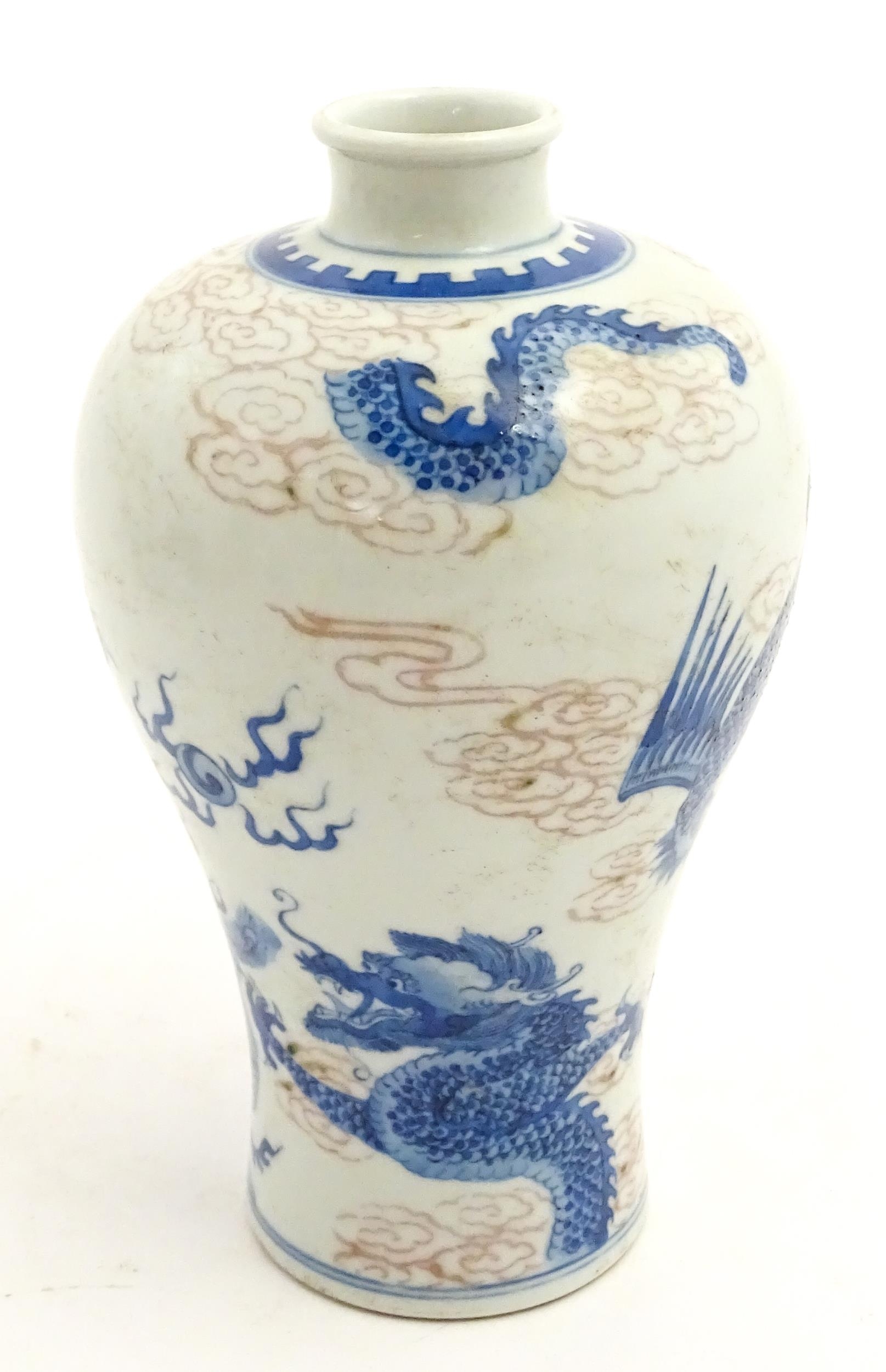 A Chinese blue and white vase decorated with dragons, flaming pearl, phoenix birds and stylised clouds. Approx. 7" high