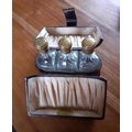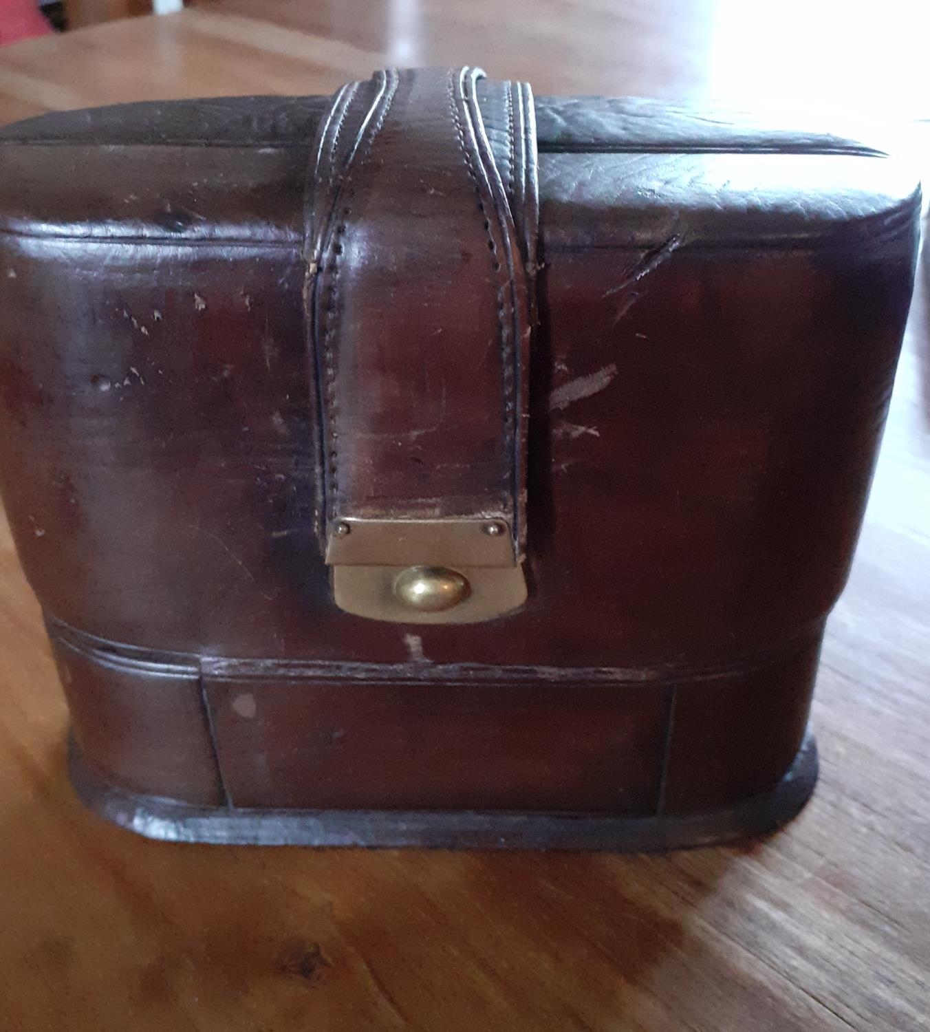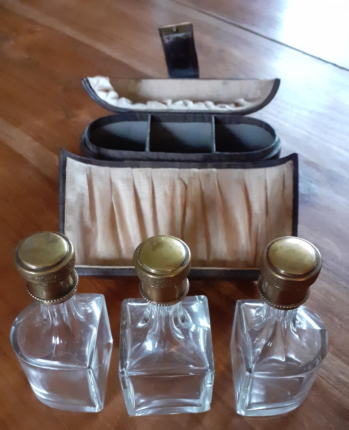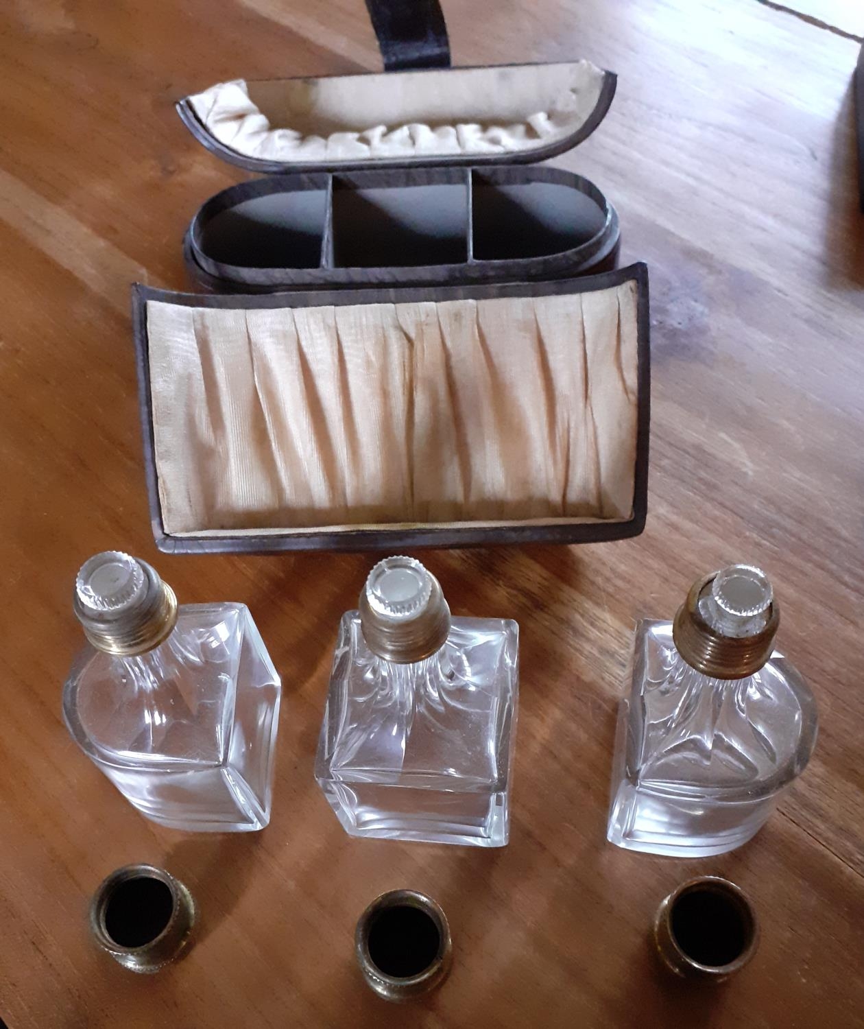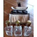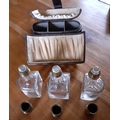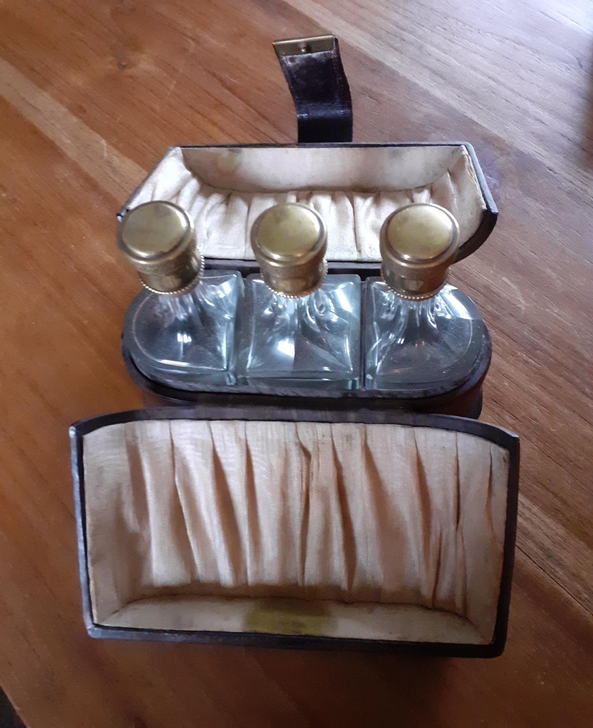 Early Ladies Perfume Leather Travel Case - Three Glass decanters with glass stopper and screw lids inside. Measures 12cm tall x 14cm wide
