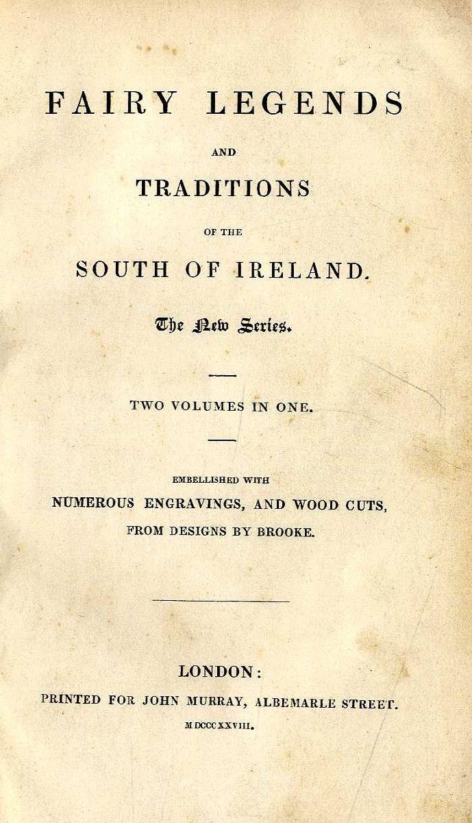[Croker (T. Crofton)] Fairy Legends and Traditions of the South of Ireland, 2 vols. in one, 12mo L. 1828, Vol. 2 lacks title etc., 10 engd. plts. & text illus. after Brooke, cont. hf. calf; Wilde (Lady) Ancient Legends Mystic Charms and Superstitions of Ireland, sm. 8vo L. 1888, orig. cloth, clean copies. (2)