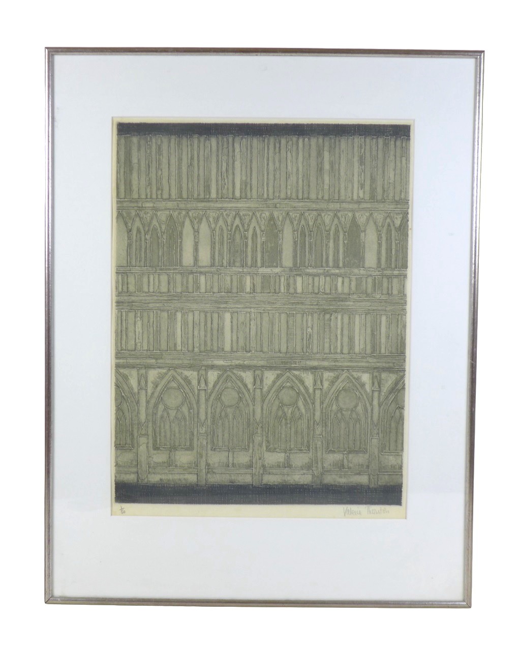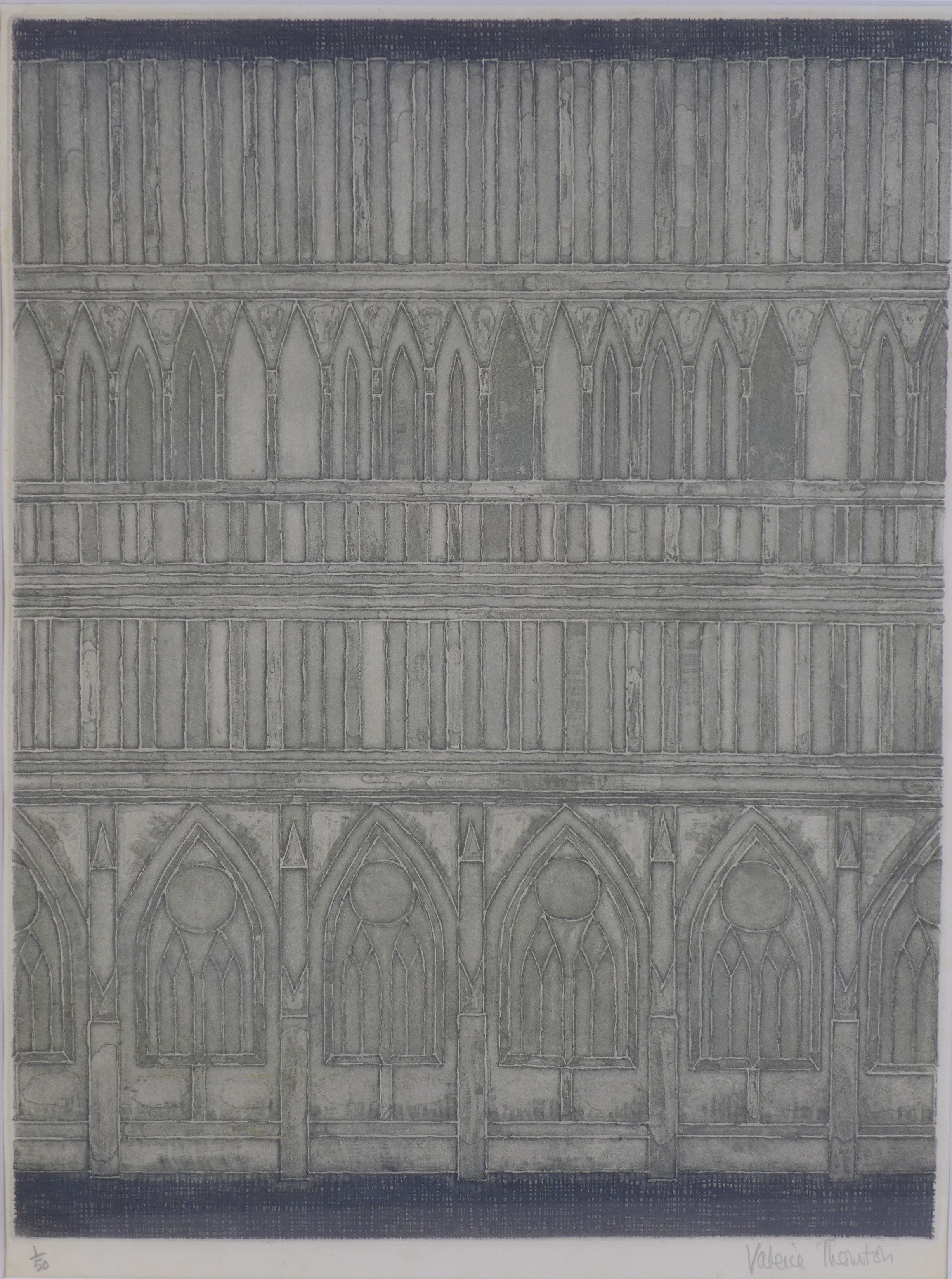 Valerie Thornton (British, 1931-1991): a limited edition architectural study, coloured etching on paper, pencil signed lower right corner, edition marked lower left corner, 1/50, 52 by 40cm, framed and glazed, 77 by 60cm.
