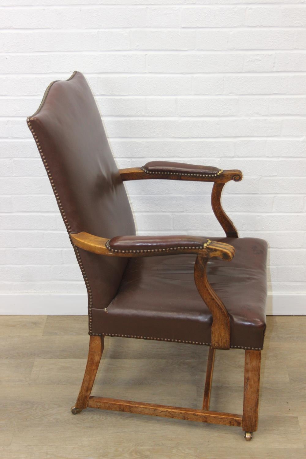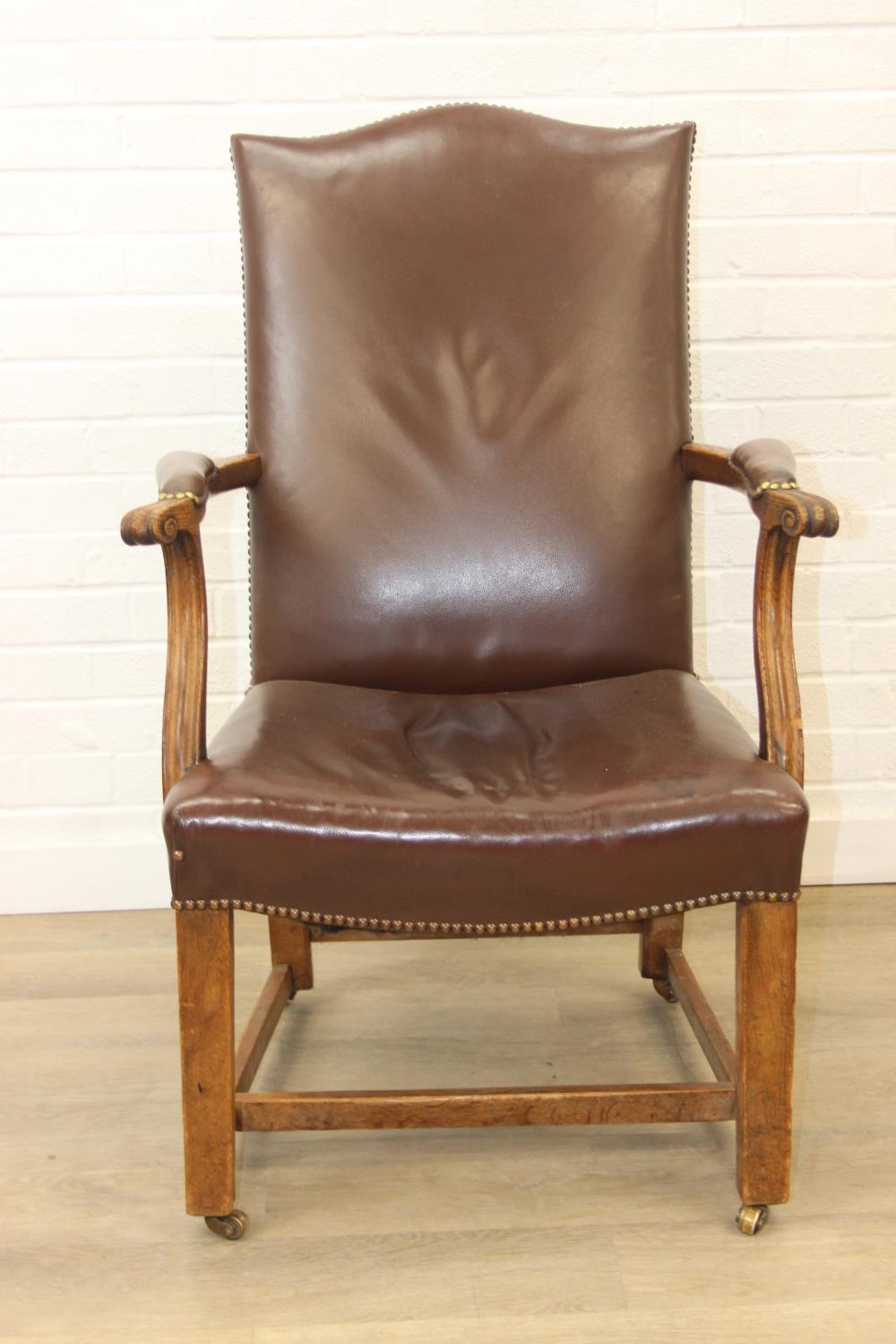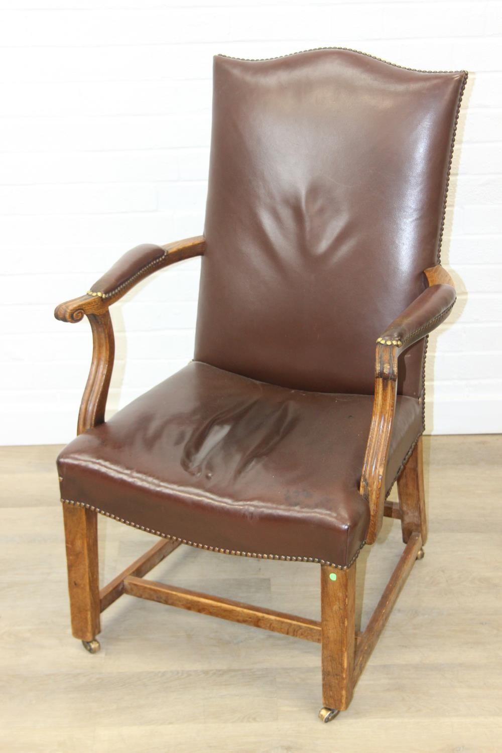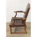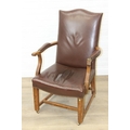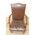 Antique oak open armchair with brown leather upholstery, 65cm wide x 105cm tall