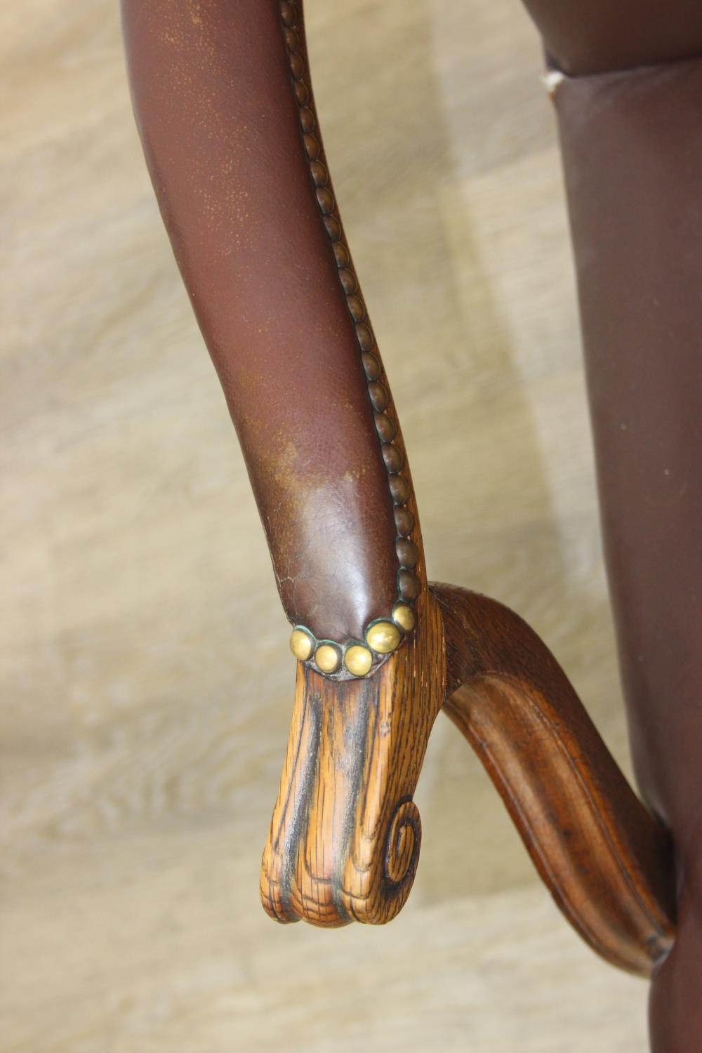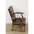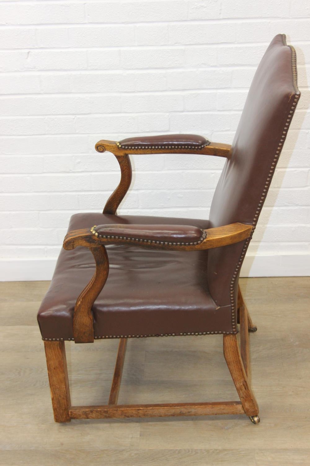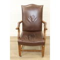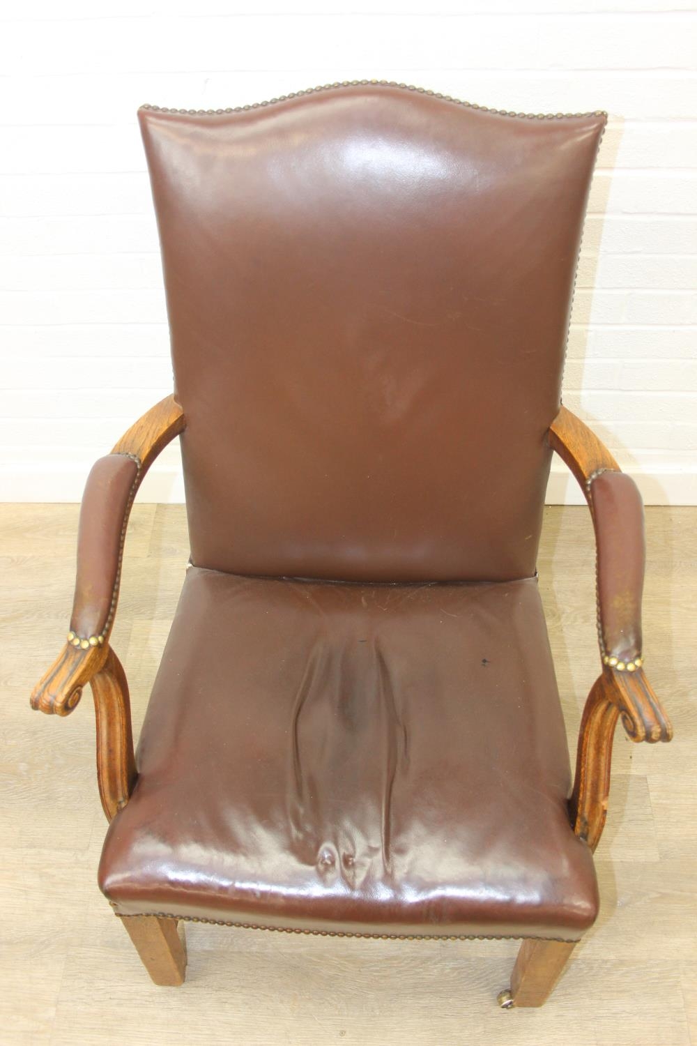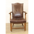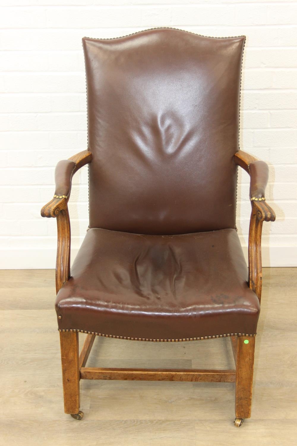 Antique oak open armchair with brown leather upholstery, 65cm wide x 105cm tall