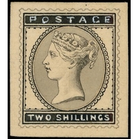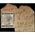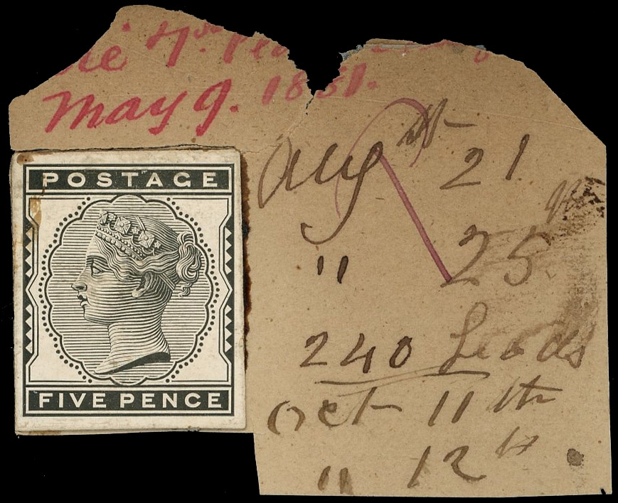 1881 5d Indigo. Very fine striking book piece printed in black on white glazed card, mounted on piece of original page, annotated May 9 1881’ in red and ‘aug 21, aug 25’, ‘240 Leads’, ‘Oct 11th’ and ‘Oct 12th’ in black. Unique. SG169. Cat. £1400