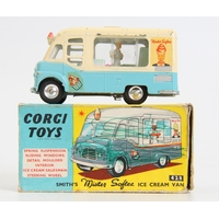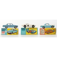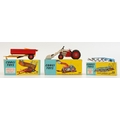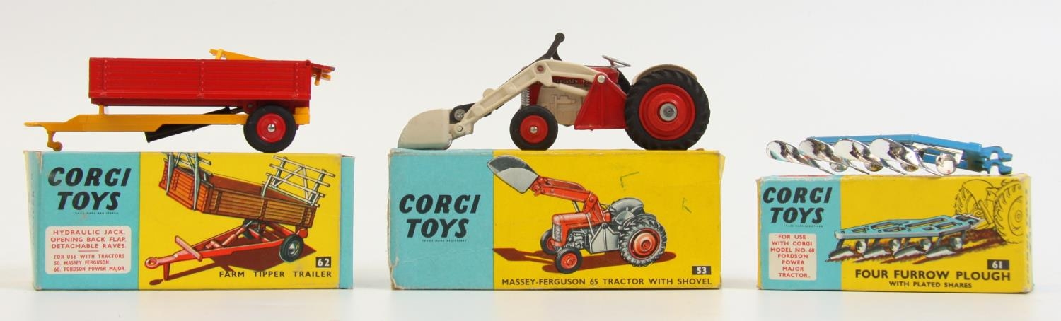 Corgi 62 Farm Tipper Trailer, red body, yellow raves, red plastic hubs, boxed; Corgi Toys 61 Four Farrow Plough with plated shares, blue body, boxed and a Corgi Toys 53 Massey Ferguson 65 Tractor with shovel, red and off-set white body, silver seat, silver shovel, boxed (3)