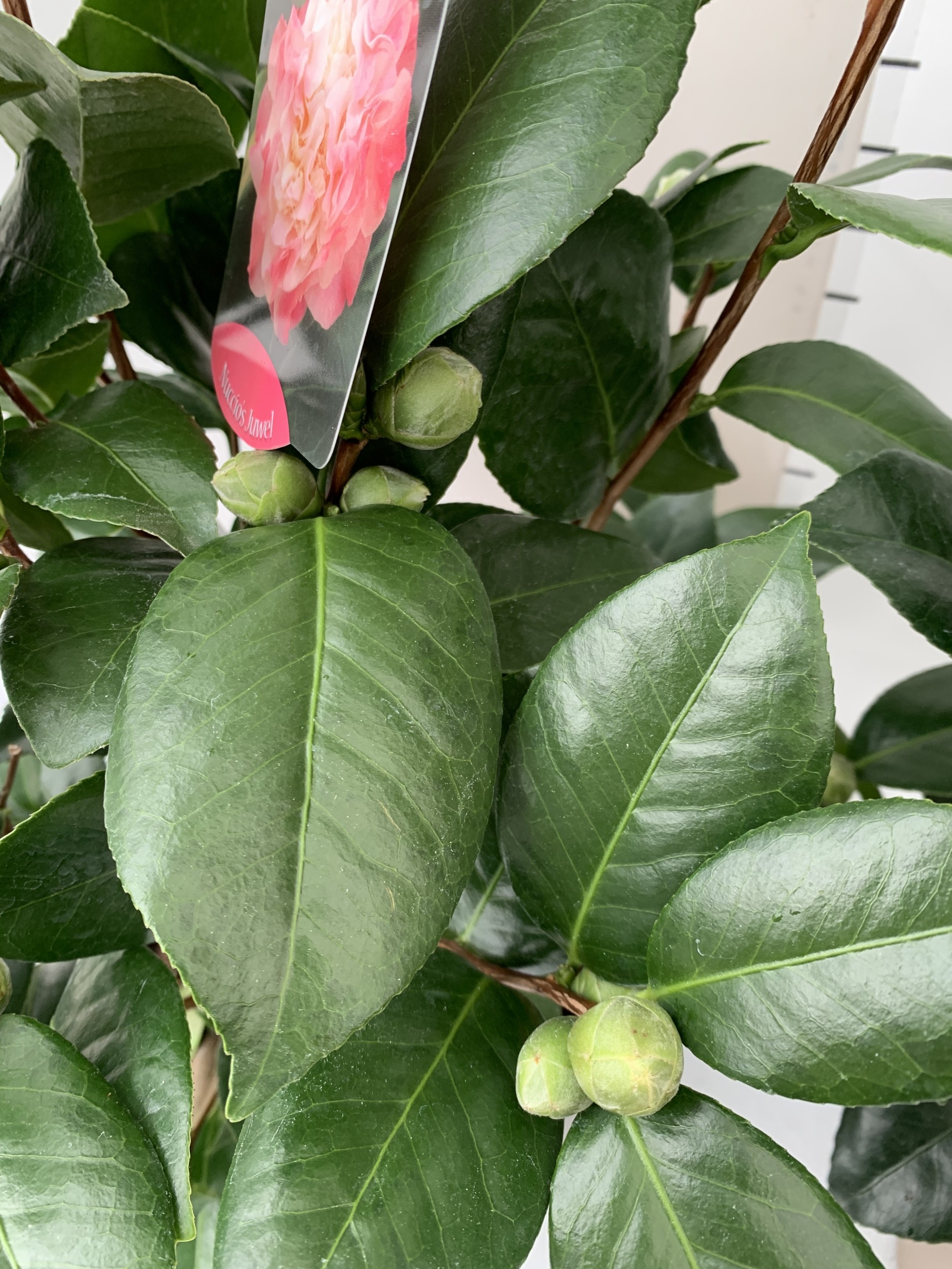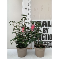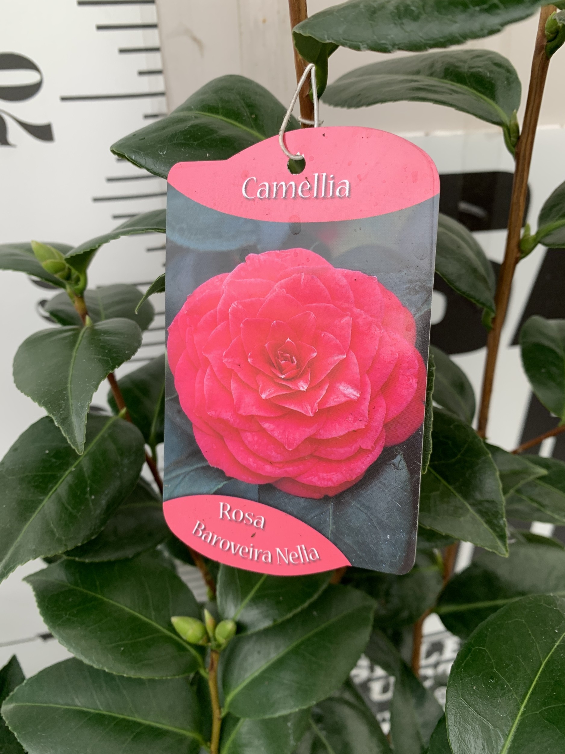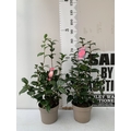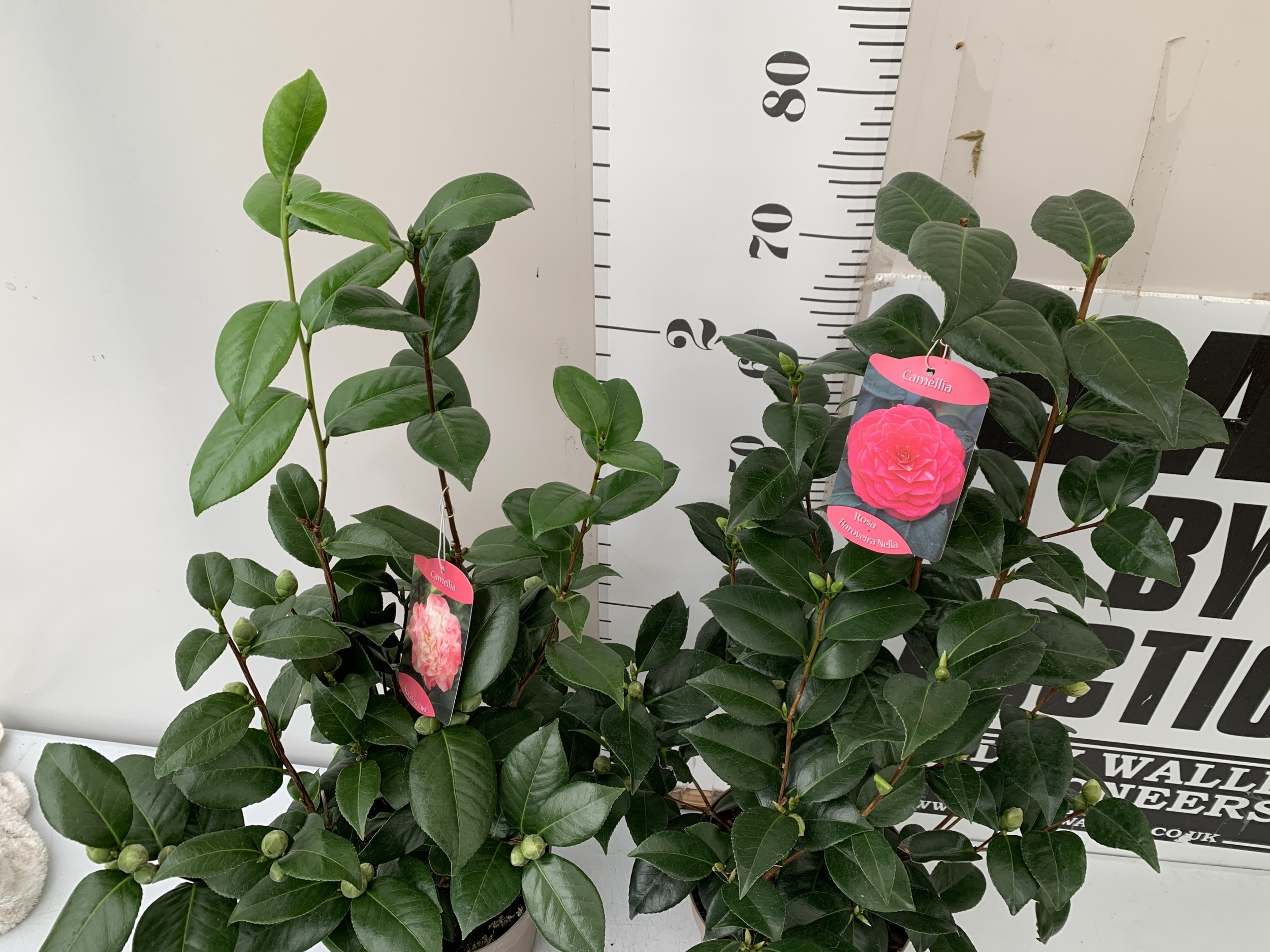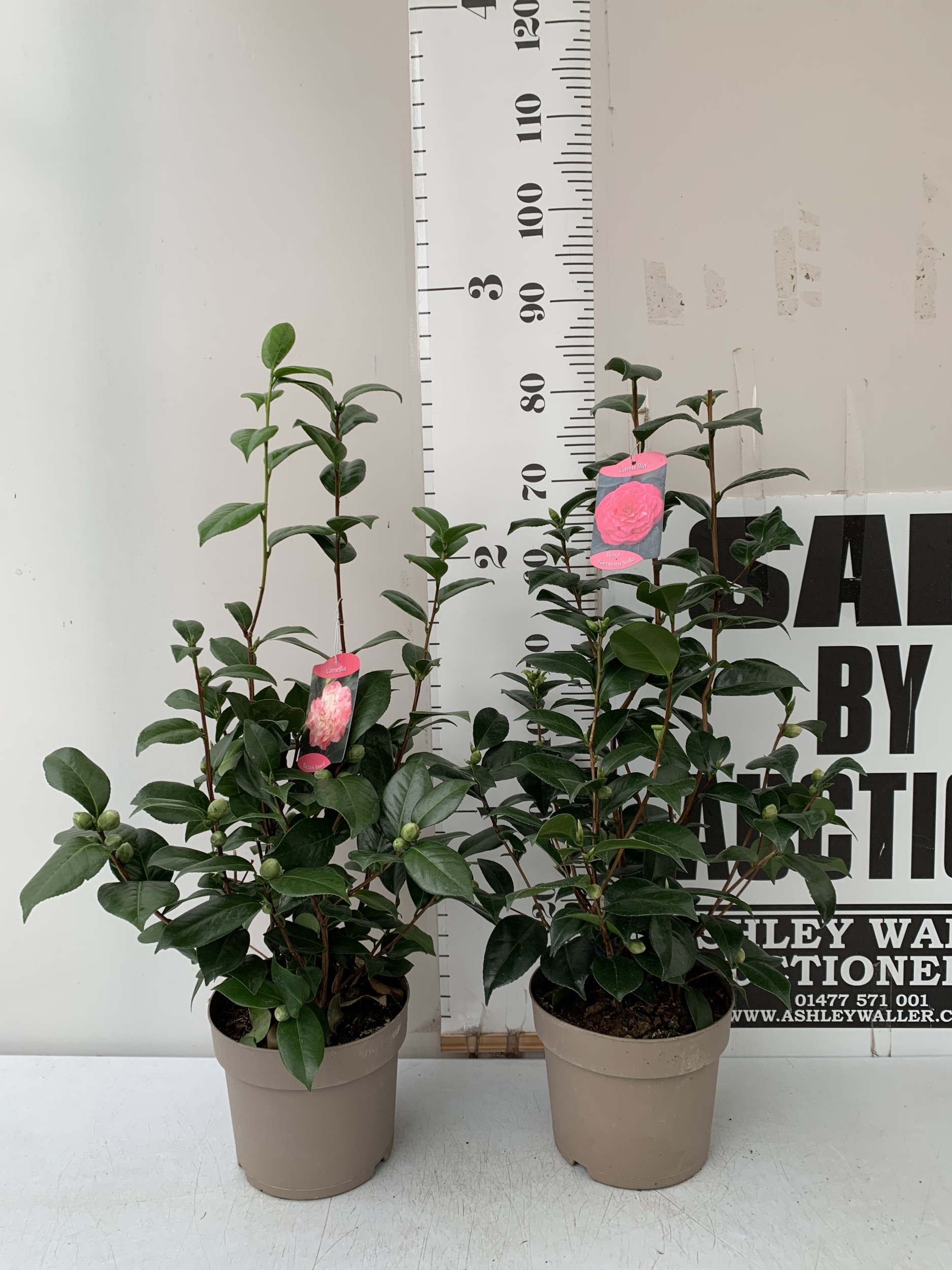 TWO LARGE CAMELLIA JAPONICAS - ONE PINK 'NUCCIO'S JEWEL' AND ONE PINK 'ROSA BAROVEIRA NELLA'. FULL OF BUDS IN 4 LTR POTS, APPROX 80CM TALL. TO BE SOLD FOR THE TWO