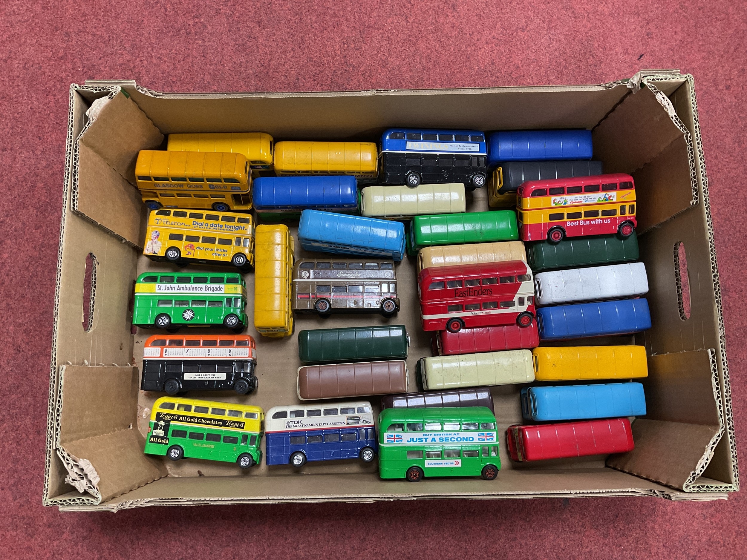 Thirty Two Diecast Model Double Decker Buses by Corgi. Assorted Liveries, Playworn. (One Box).