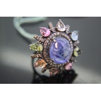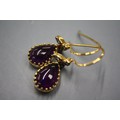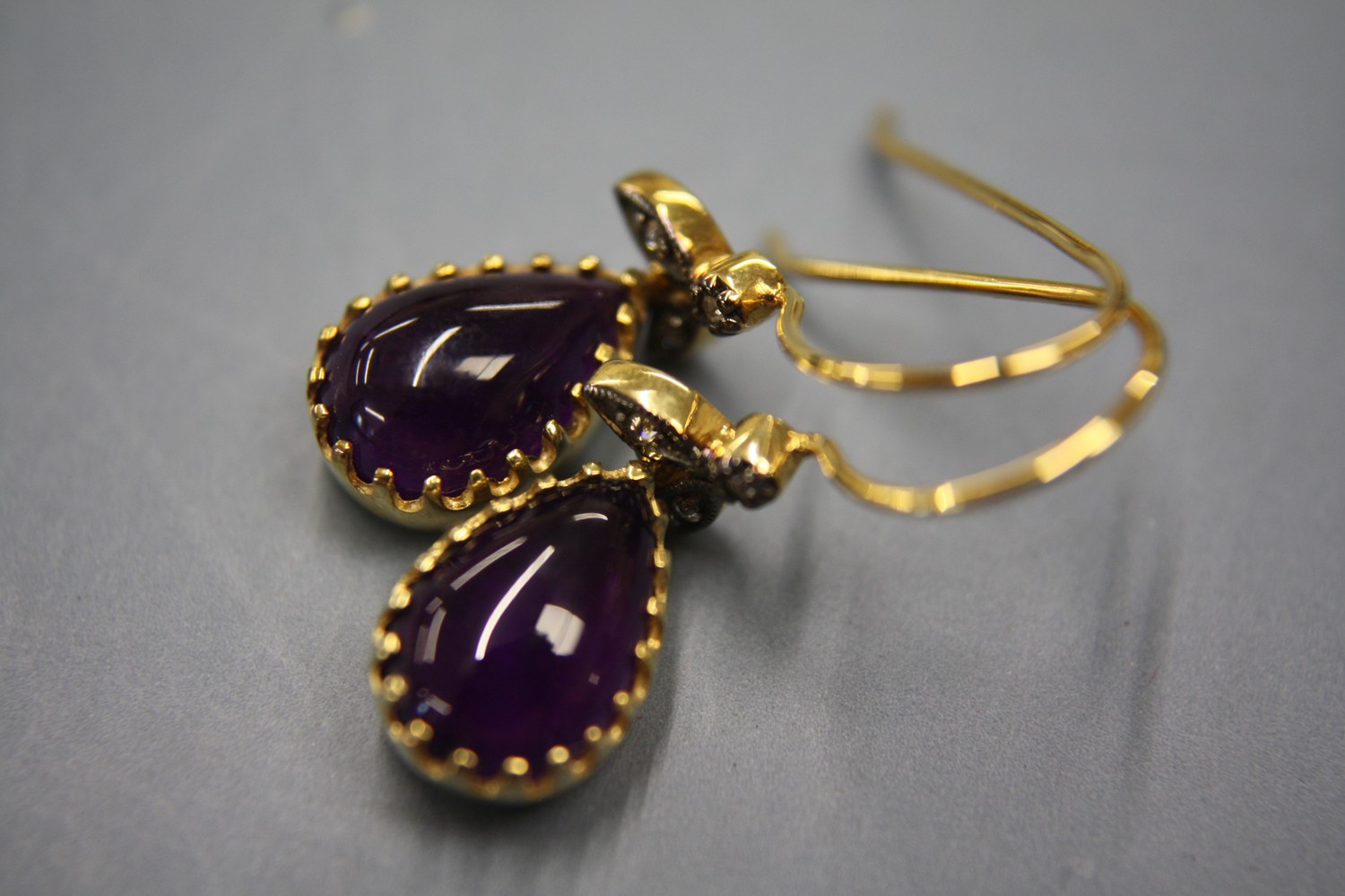 Pair of 9ct gold and silver drop earrings with cabochon pear-shaped amethysts and diamond set foliate bales