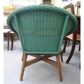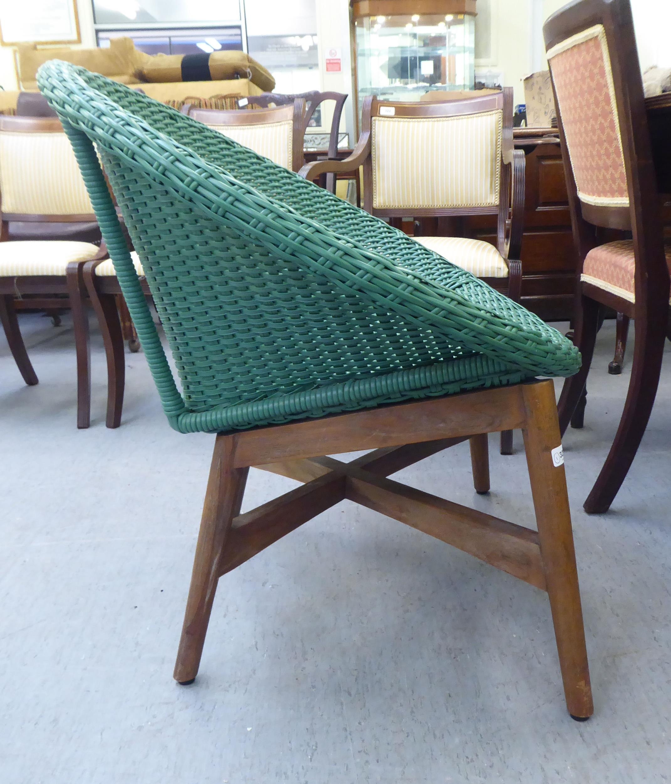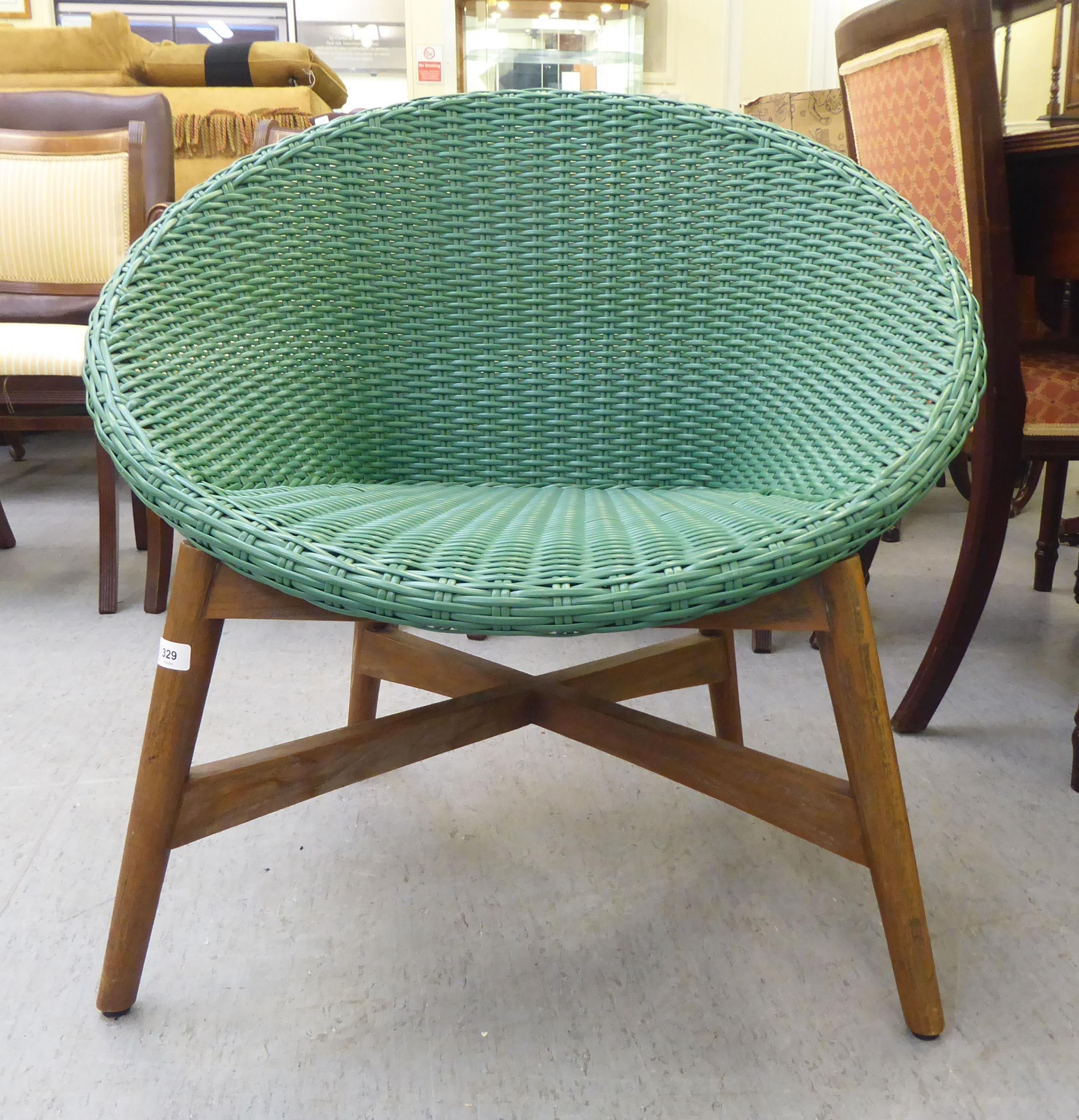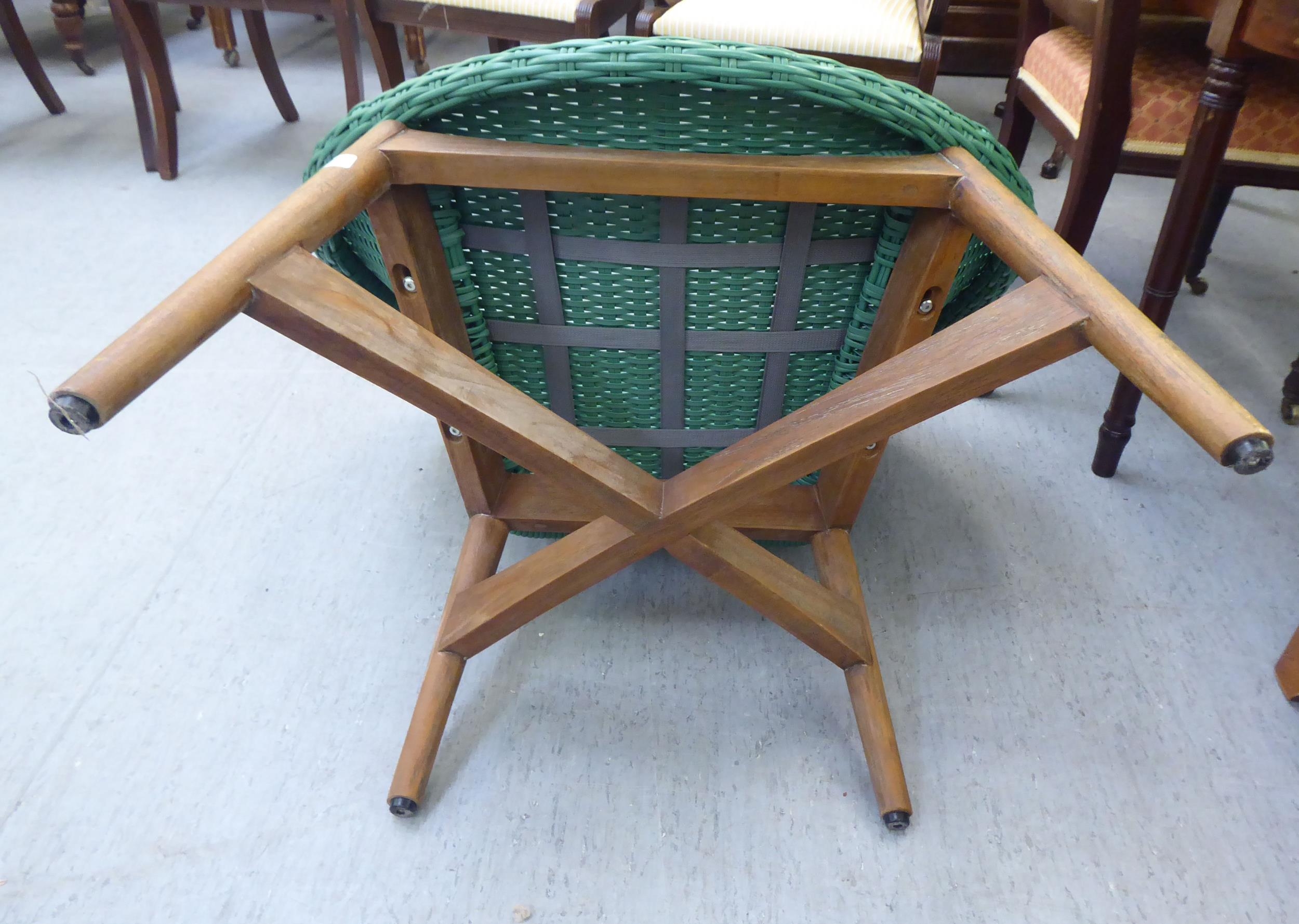 A modern Indonesian made green wicker style easy chair, on a teak underframe