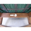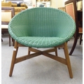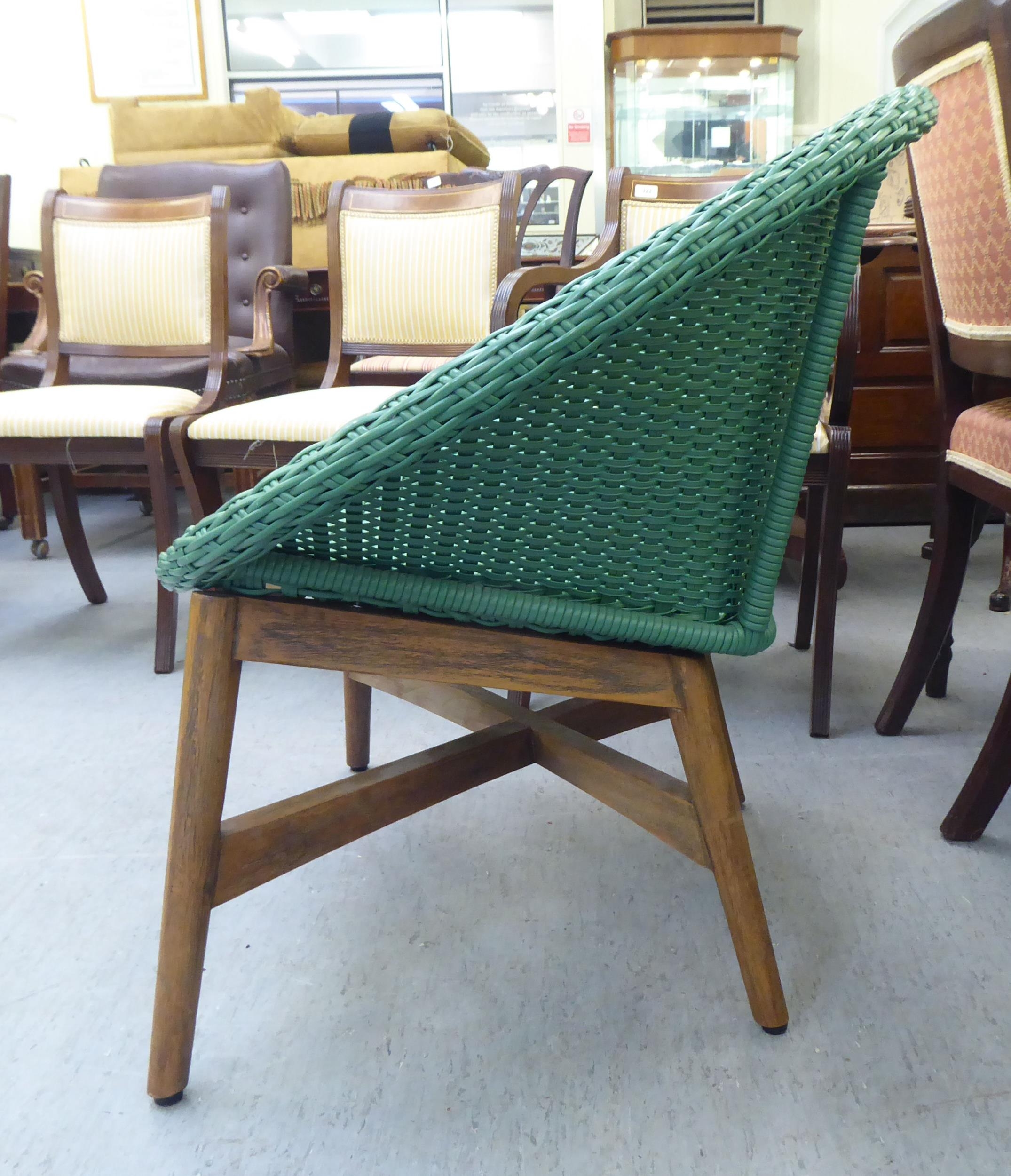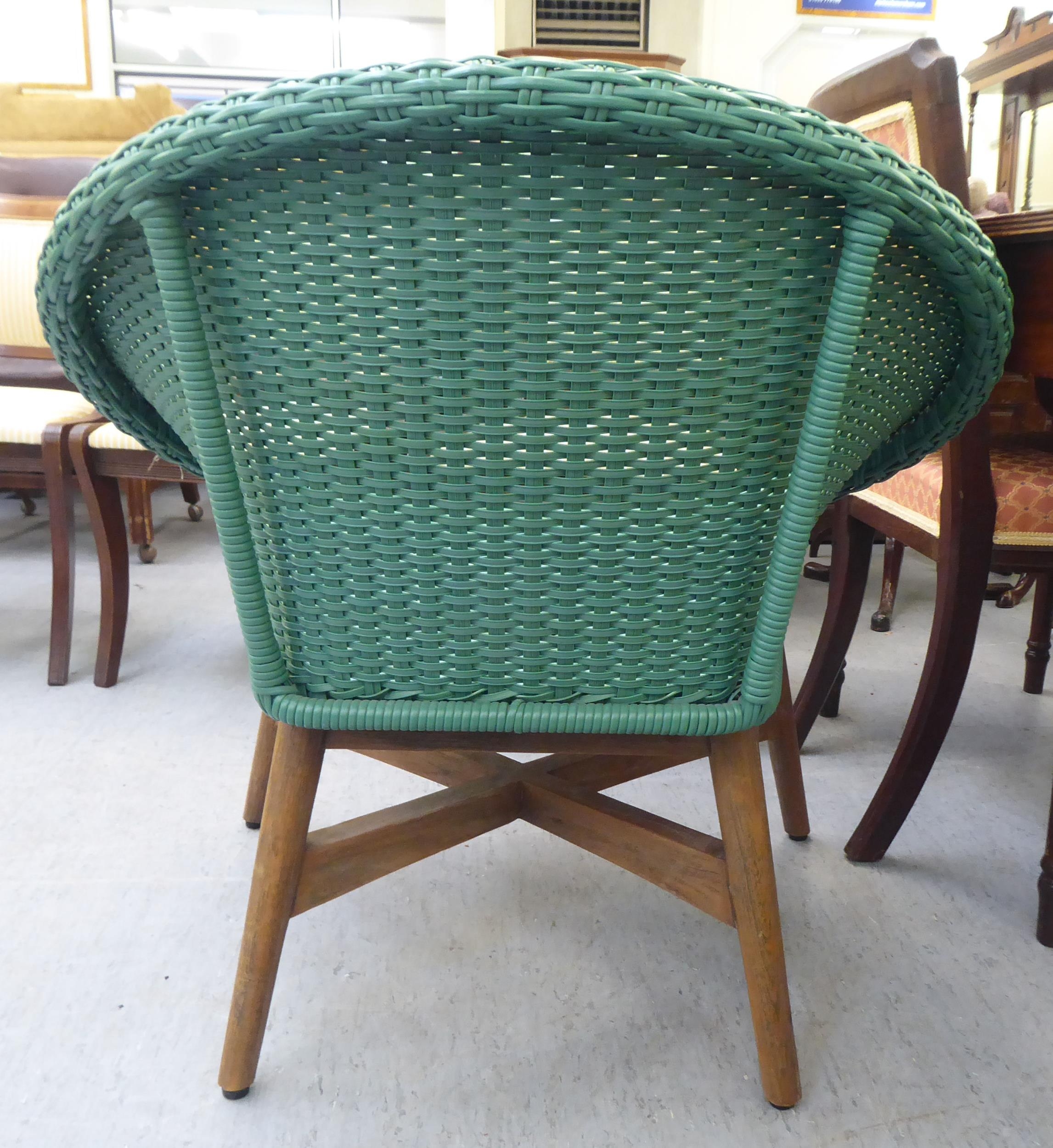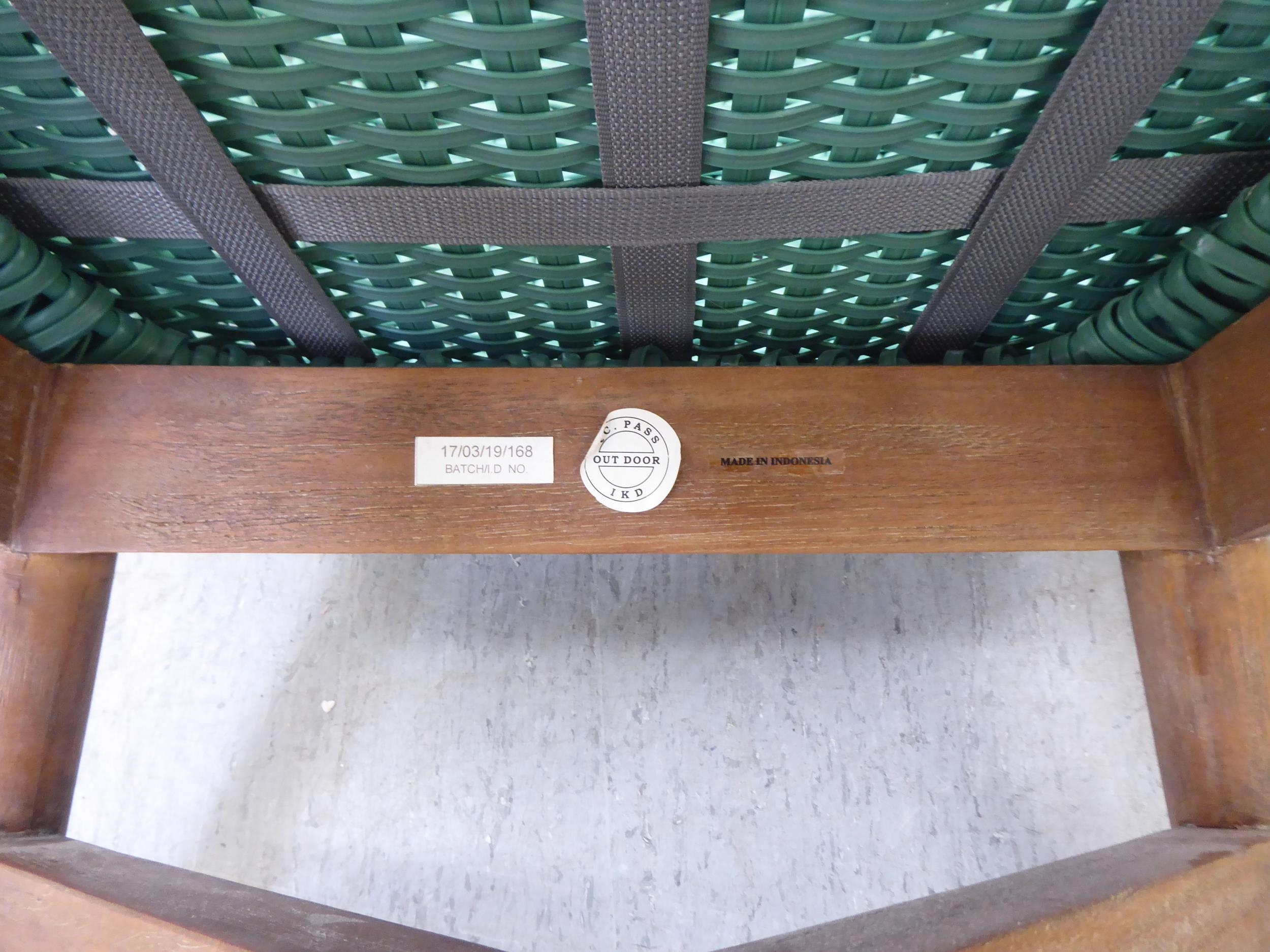 A modern Indonesian made green wicker style easy chair, on a teak underframe